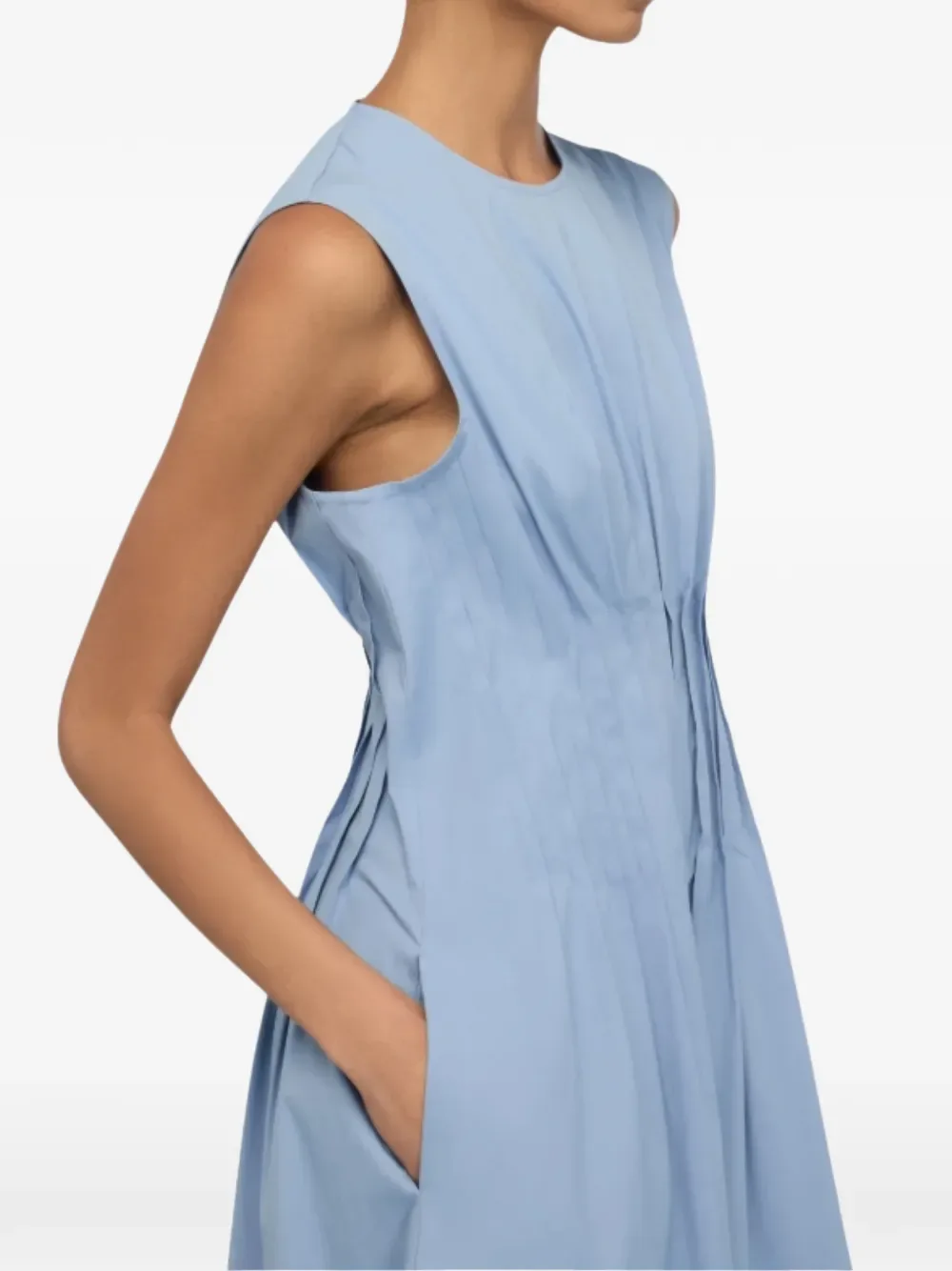 Синяя майка без рукавов с круглым вырезом и драпировкой