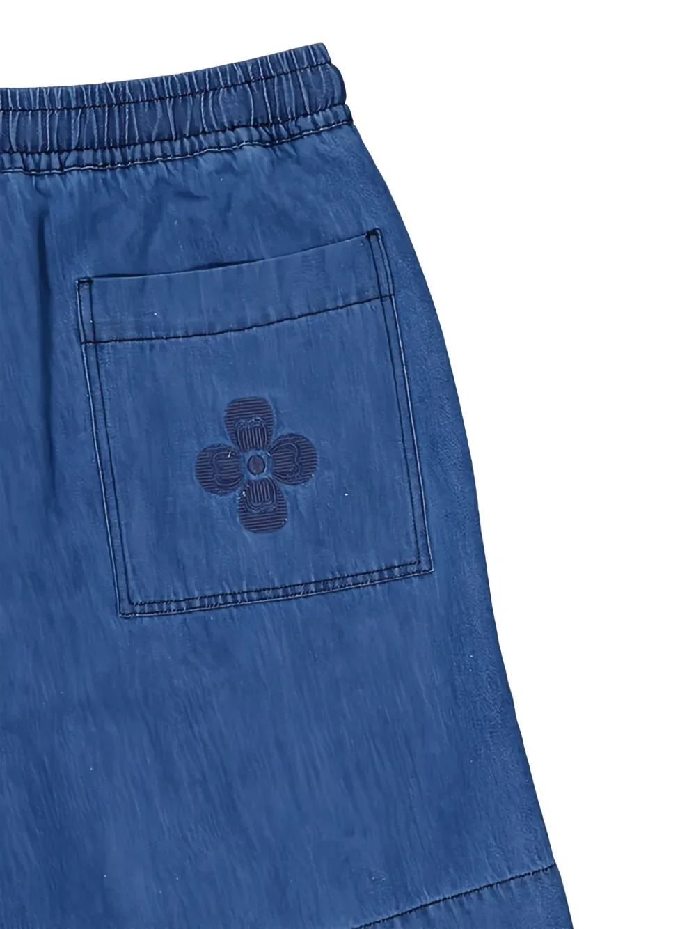 Синий цвет, эластичный пояс с завязками, задний карман, цветочная вышивка