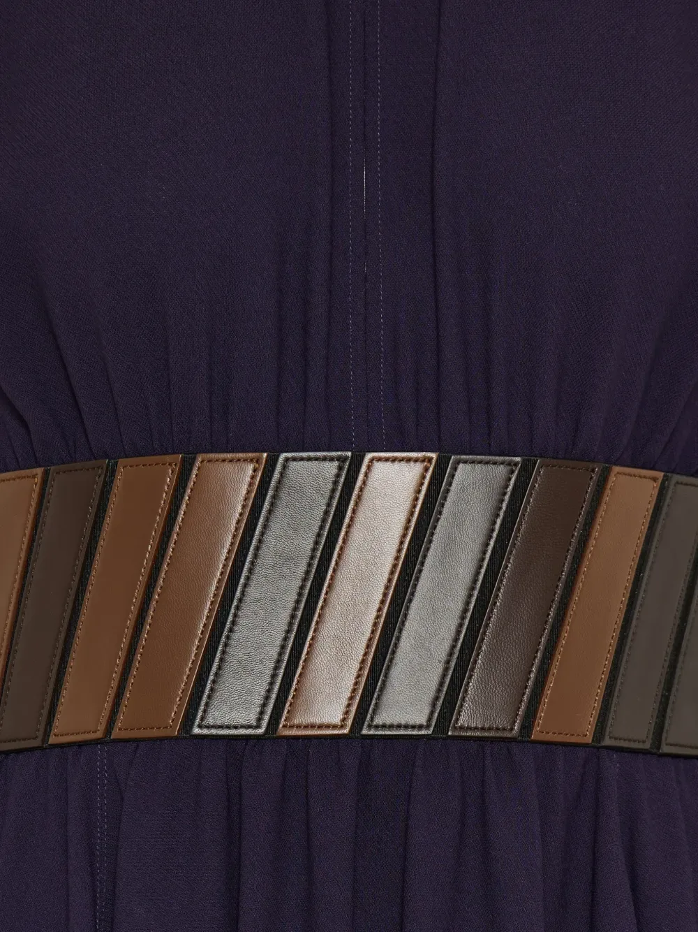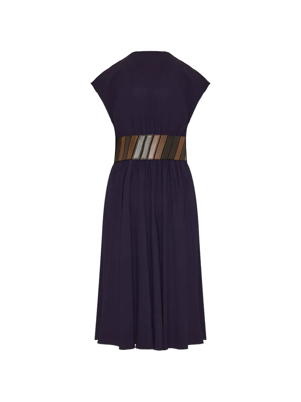 Фиолетовое платье А-силуэта с вставками, поясом, короткими рукавами, круглым вырезом и длиной до колена