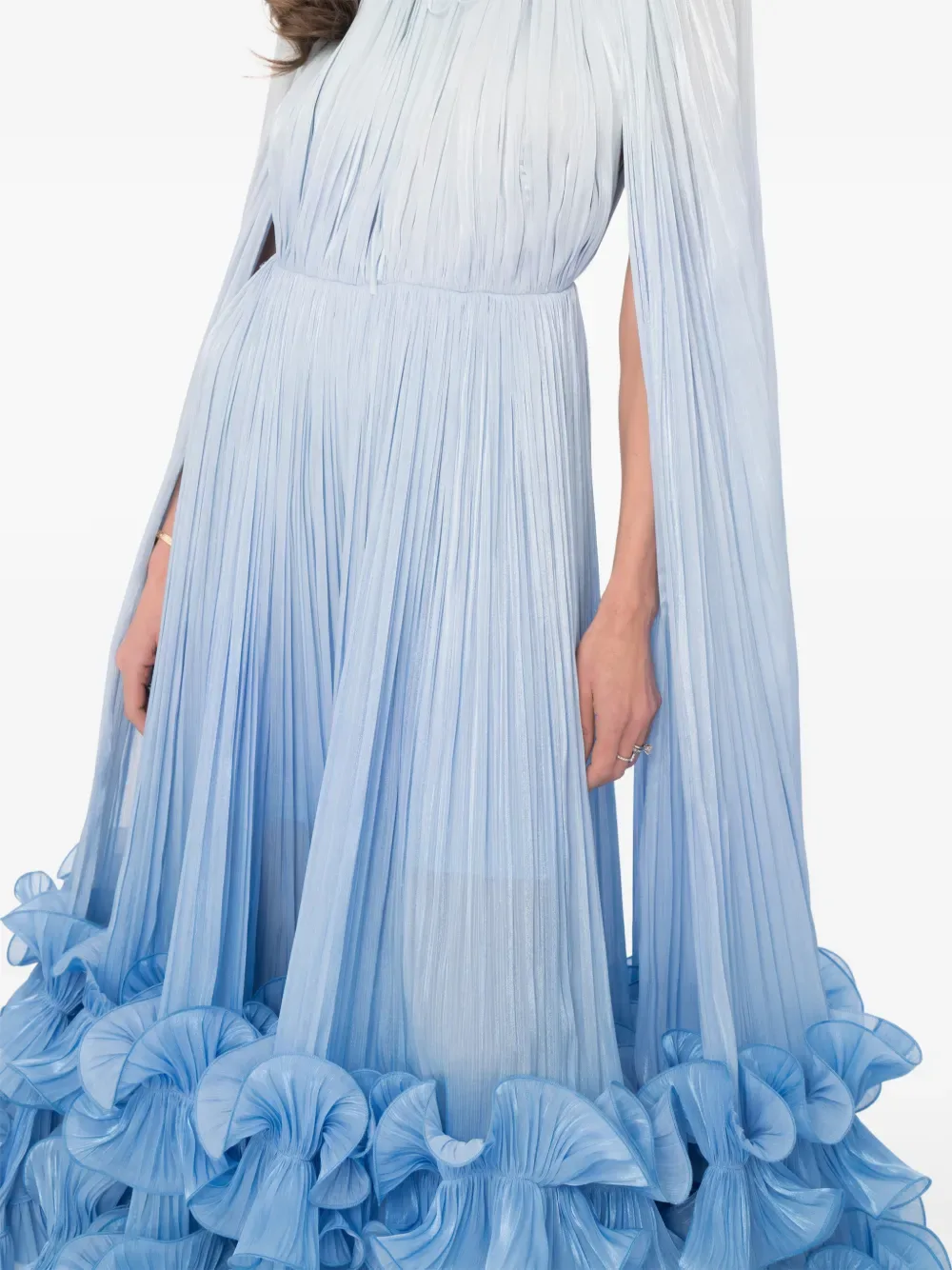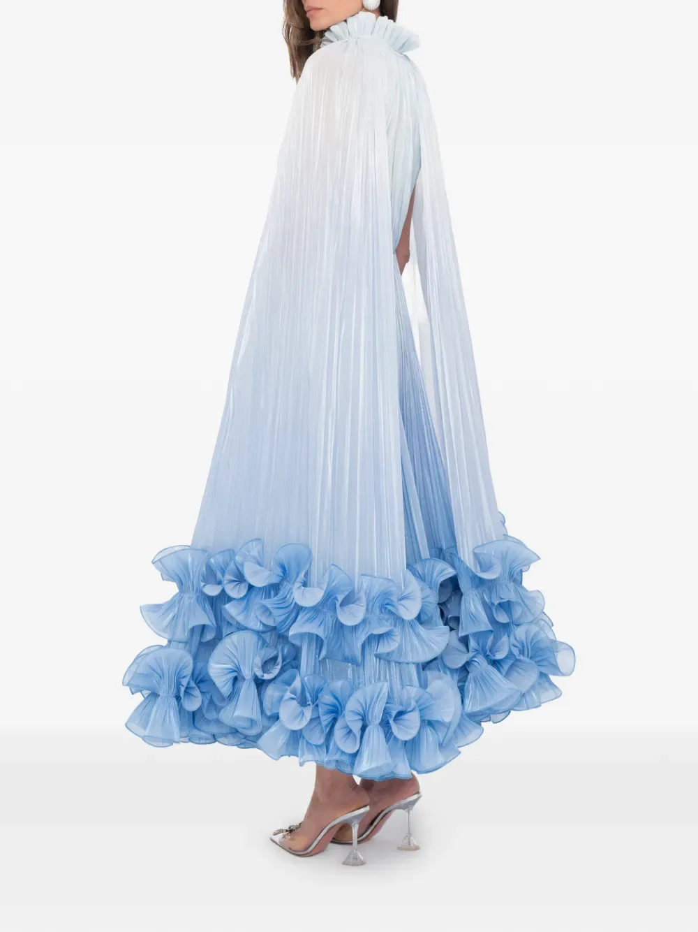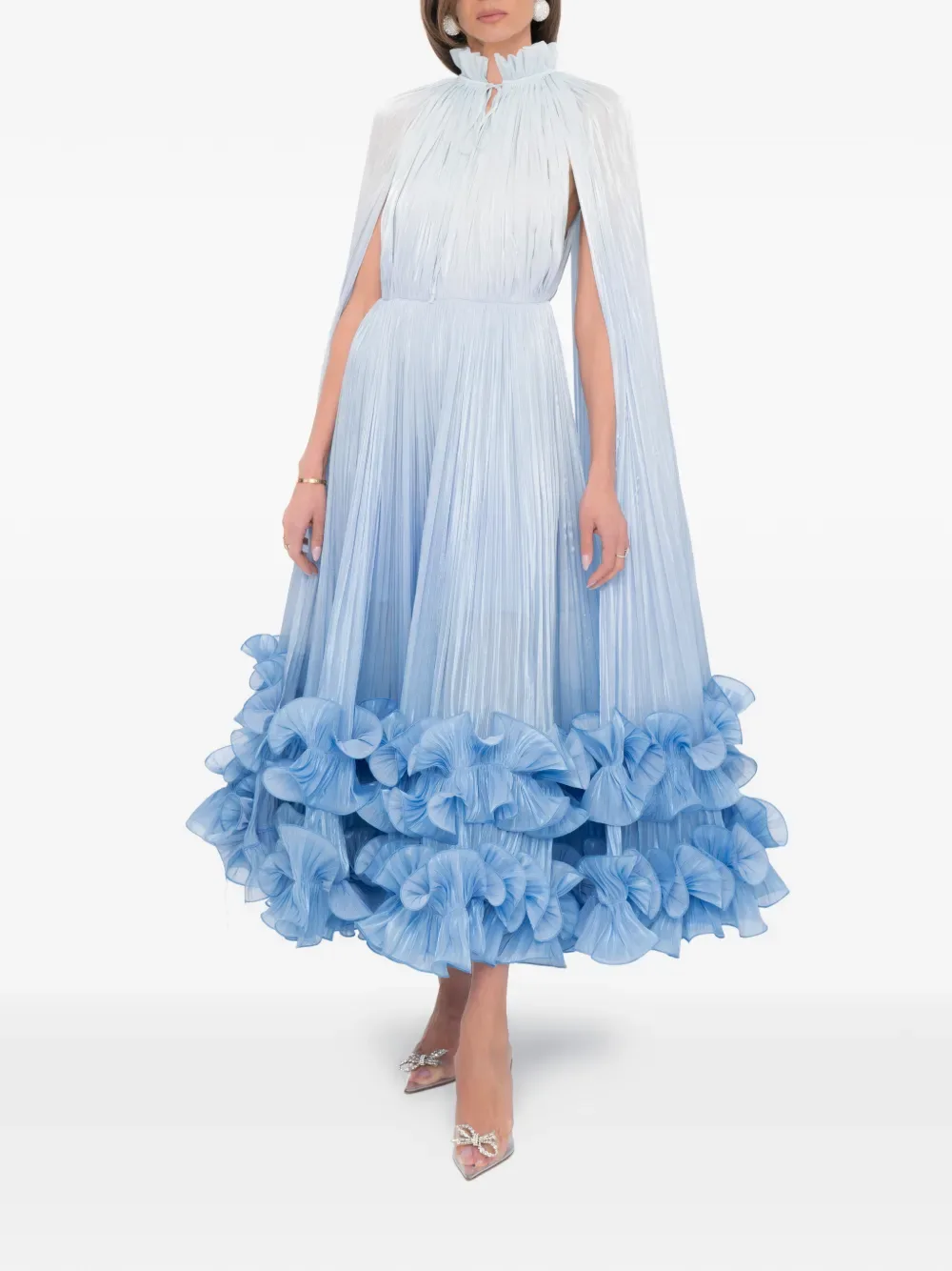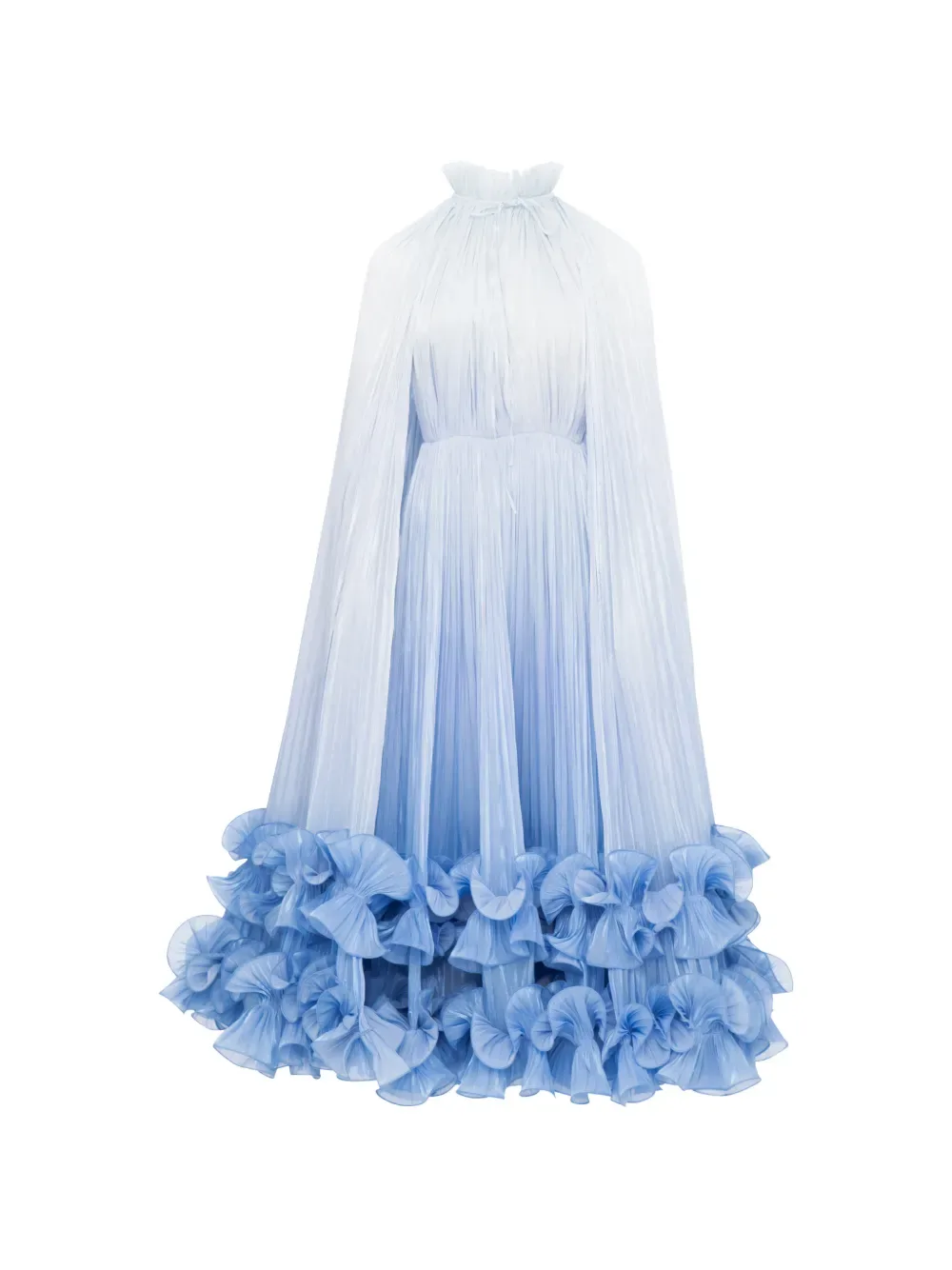 Голубое платье с оборчатым подолом, высоким воротом и деталями в виде накидки