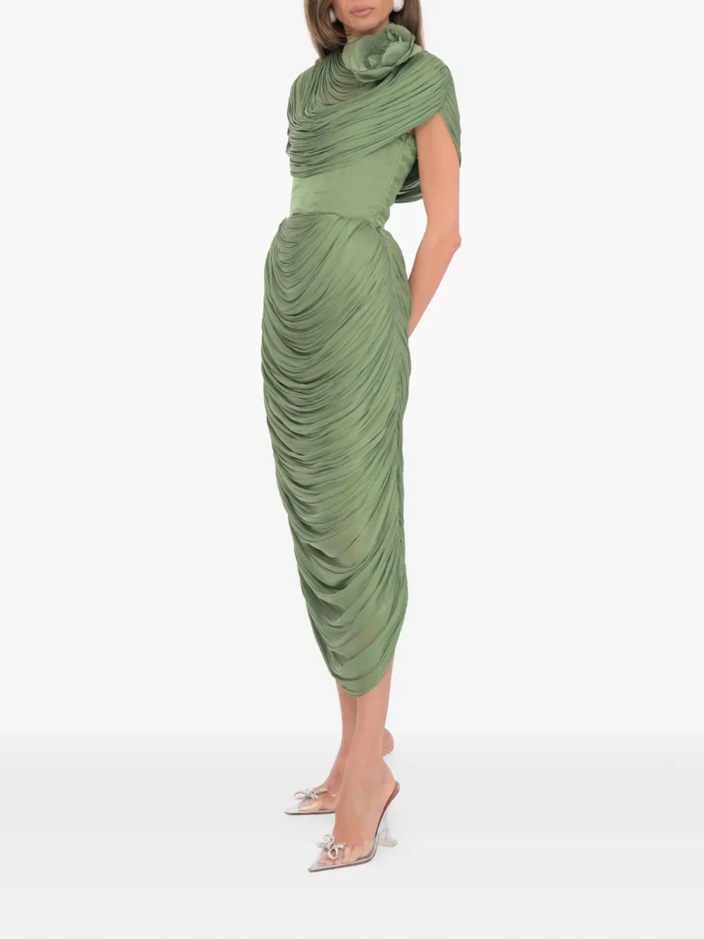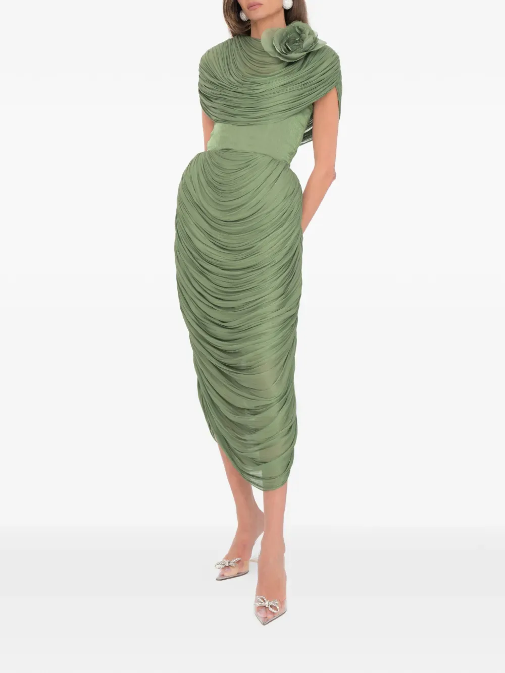 Миди длины мшисто-зеленое платье с цветочным декором и скрытой застежкой