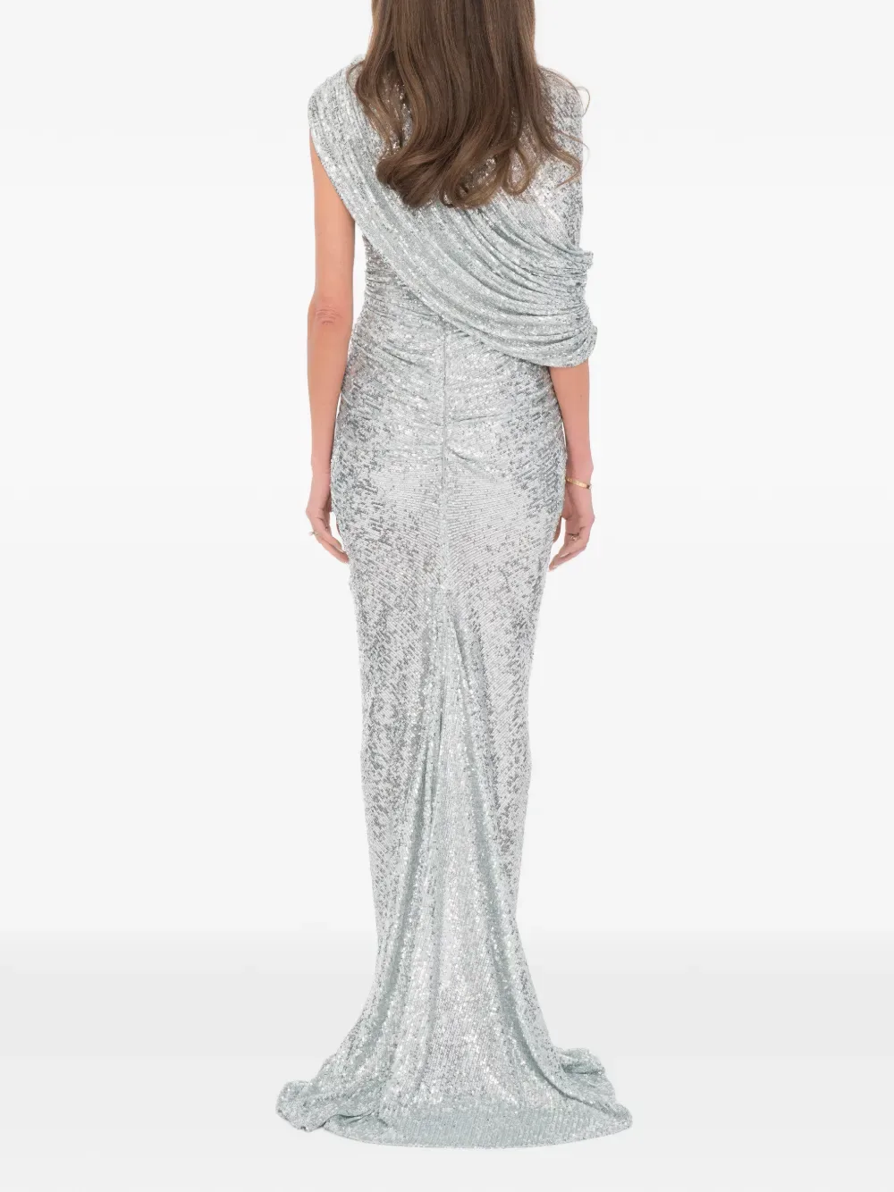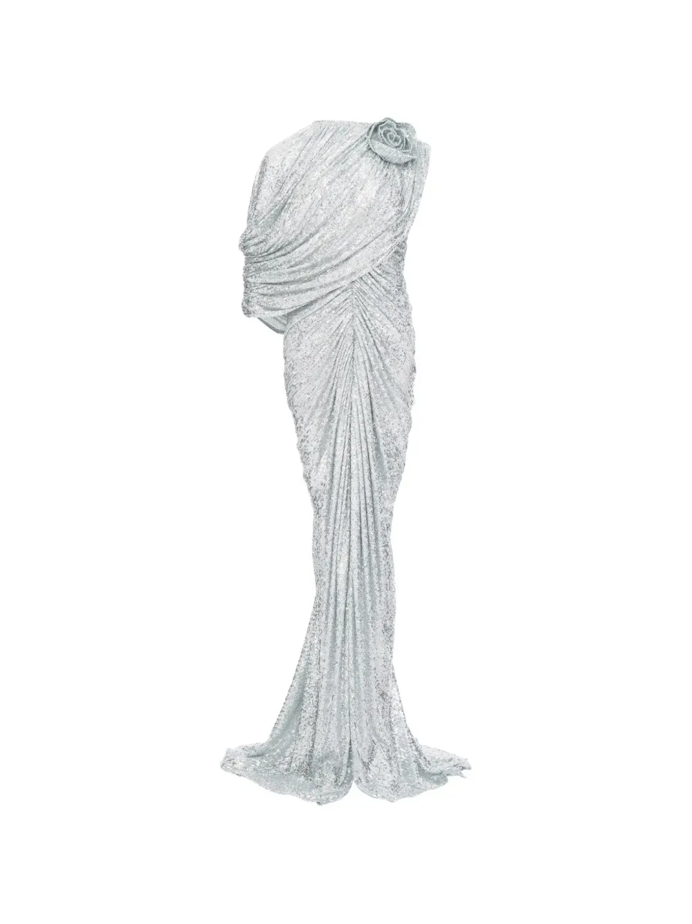 Серебристый декор из пайеток, цветочные детали, разрез на бедре