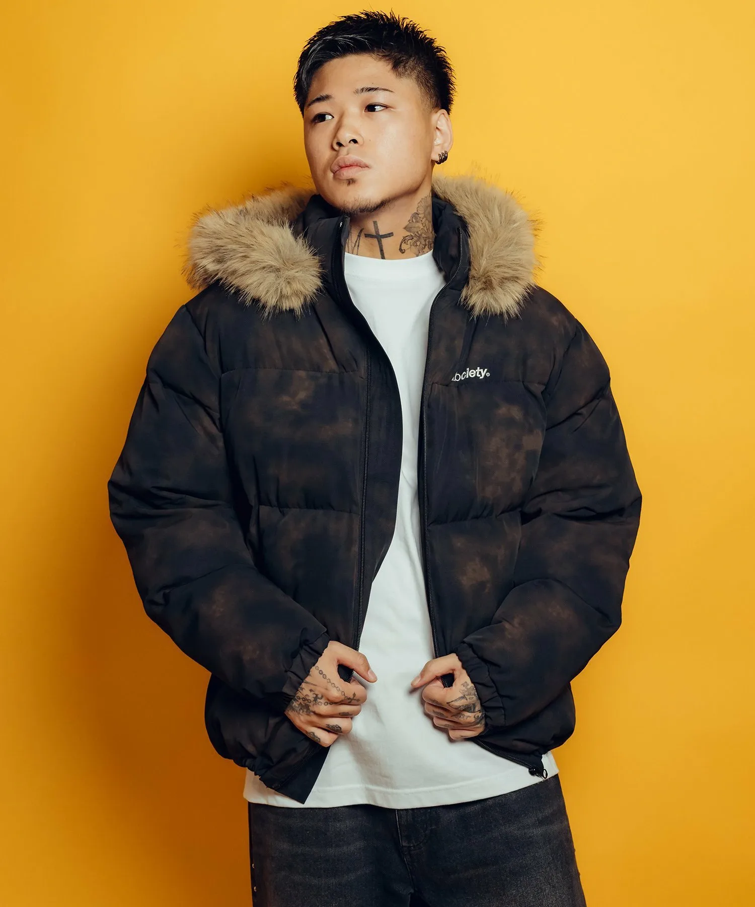 Главный логотип бренда, «THEBASE», вышит на левой стороне груди, а на задней части воротника вышит символ с узором пейсли.