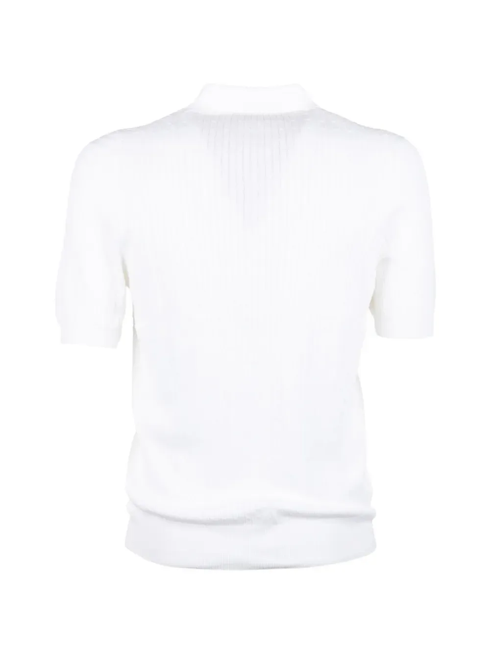 Белый рубчатый трикотаж, короткие рукава, воротник-поло, застежка на пуговицы