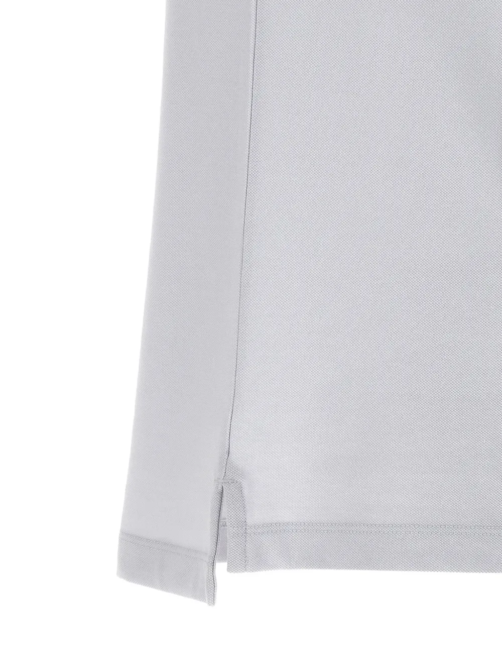 Светло-голубой хлопок, застежка на три пуговицы, контрастная окантовка, разрезы по бокам, резиновый логотип