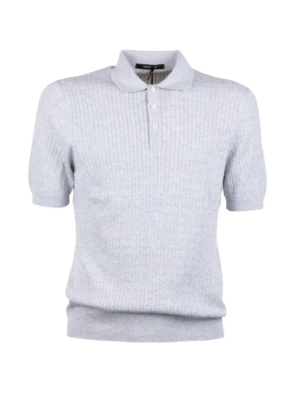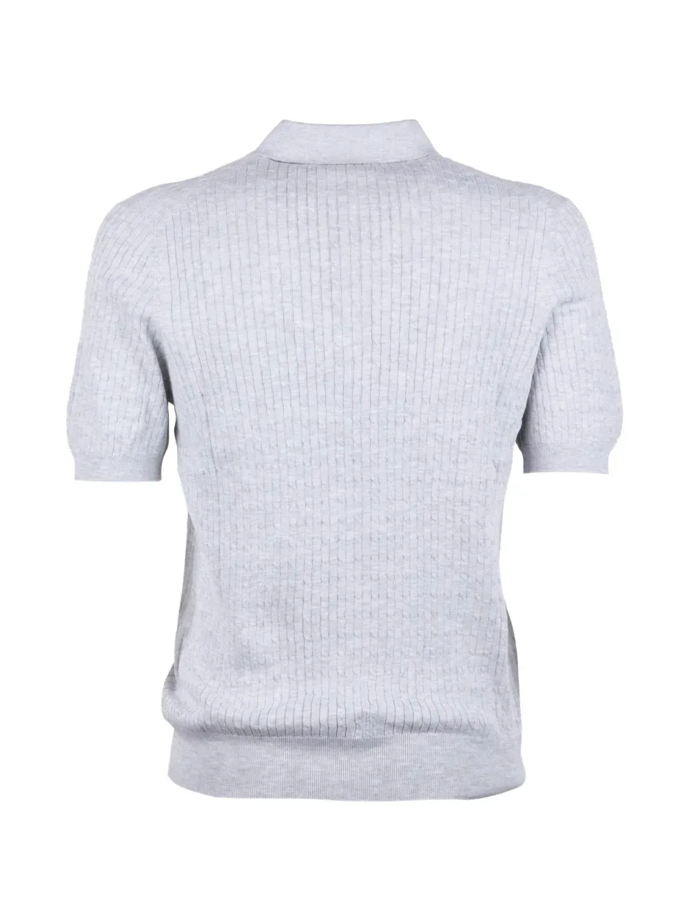 Светло-серый в рубчик, вязаный, с воротником поло, застежкой на пуговицы спереди, короткие рукава