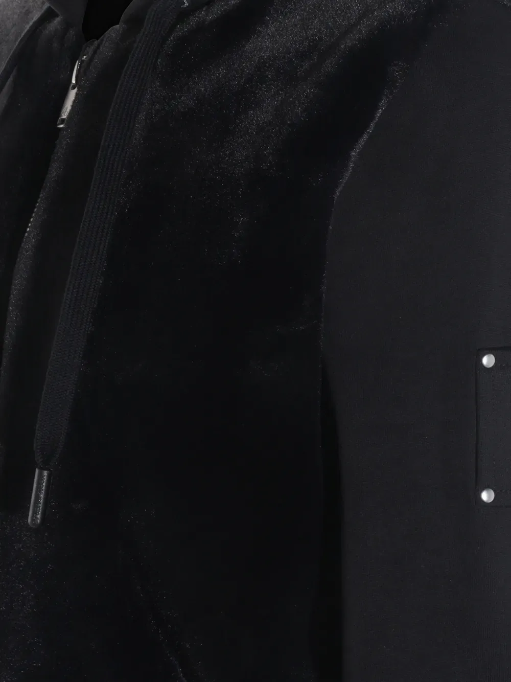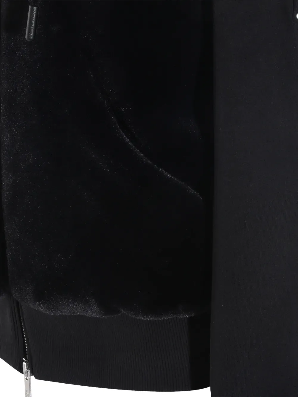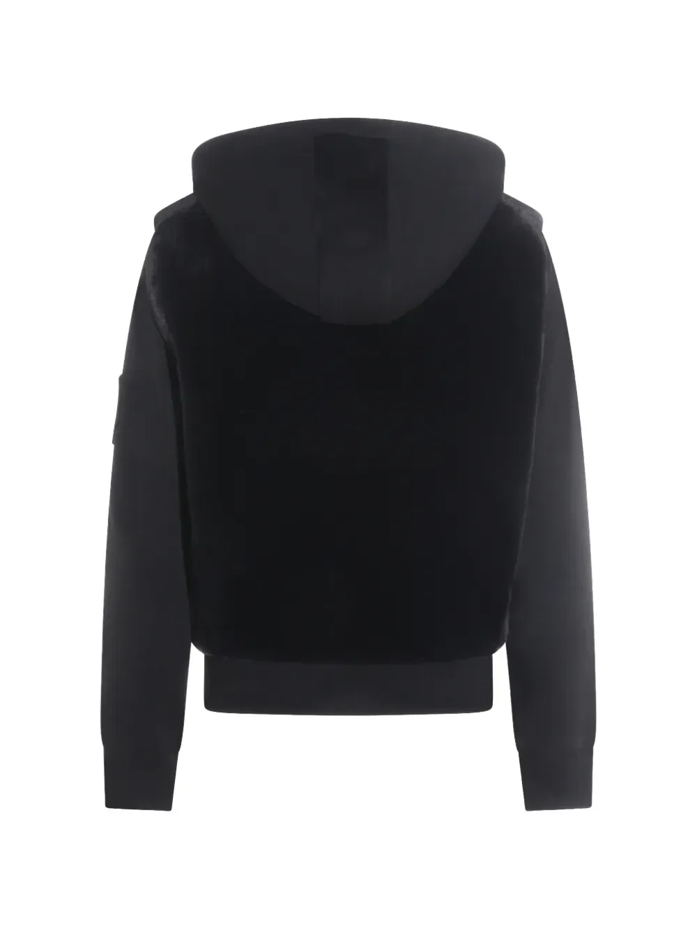 Черная толстовка с меховой отделкой, капюшоном на кулиске, застежкой-молнией, логотипной нашивкой и ребристым подолом