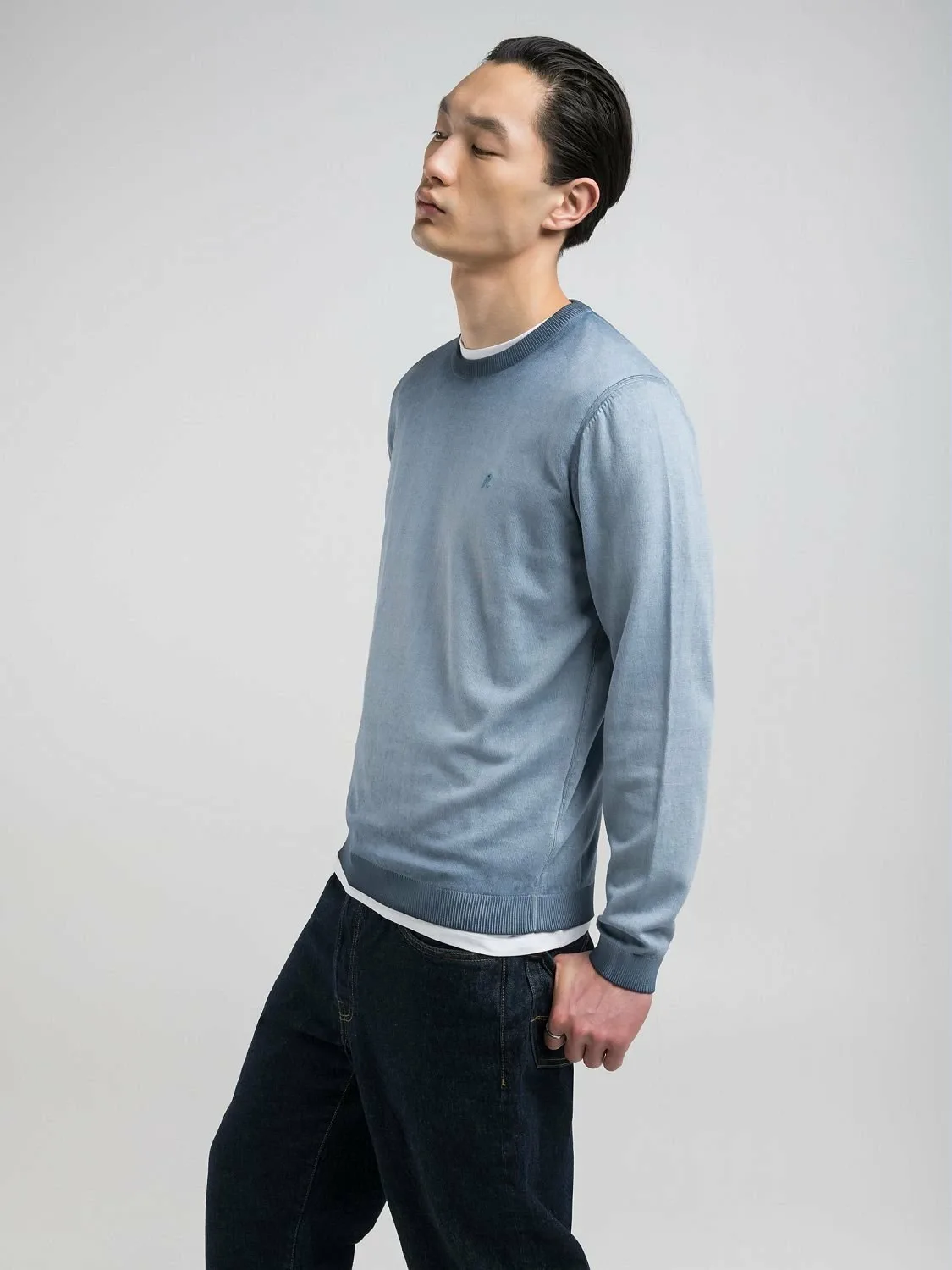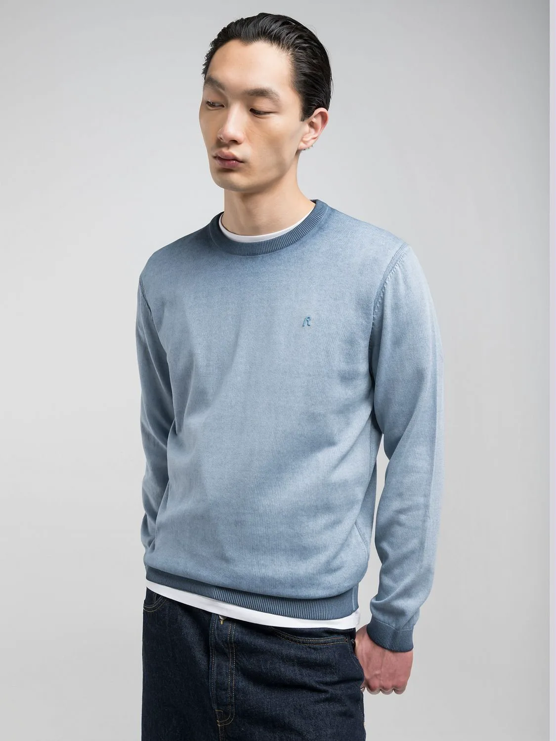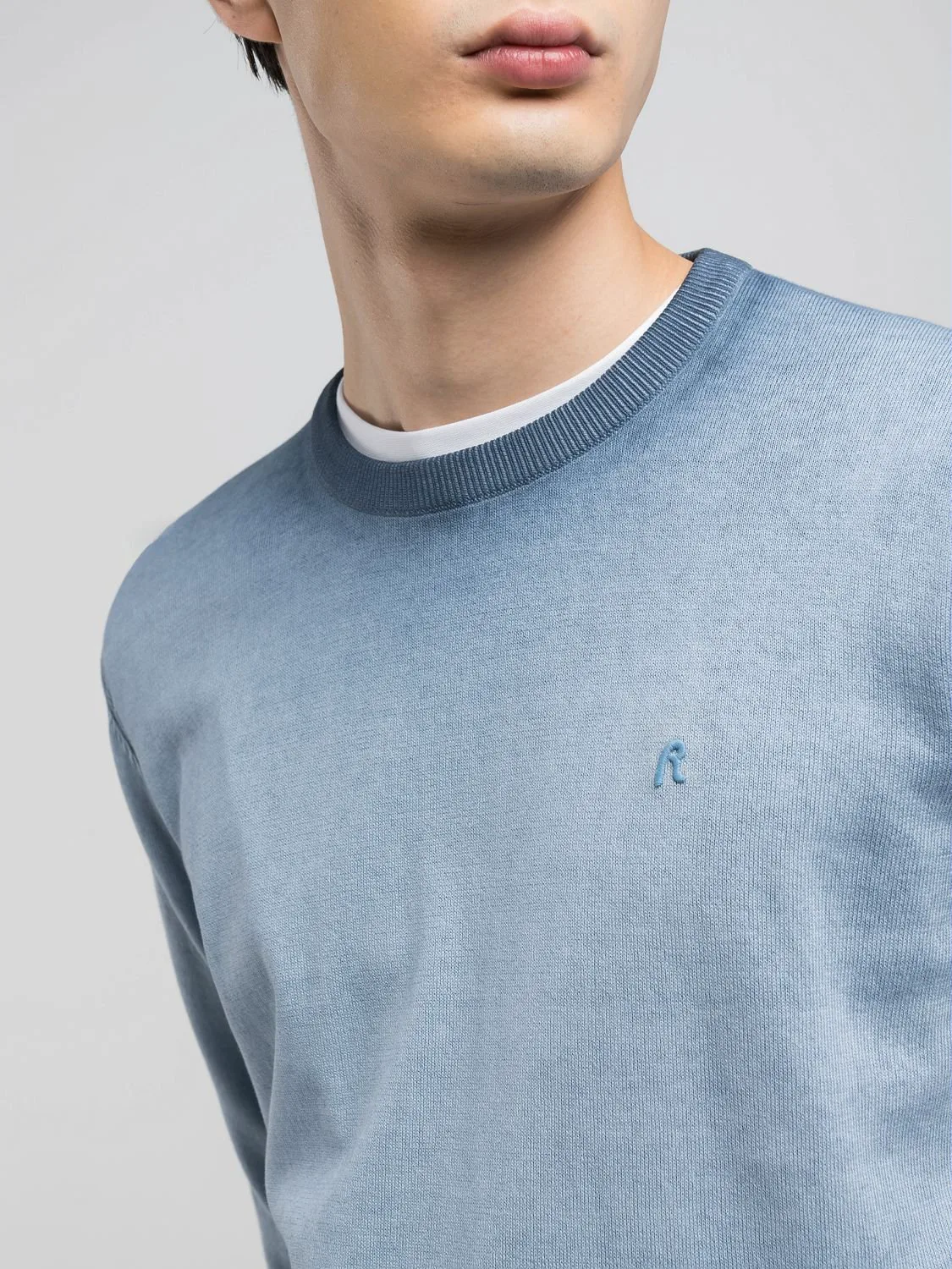 Легкая футболка с круглым вырезом, изготовленная из мягкого хлопка с уникальным эффектом омбре на воротнике и подоле. Украшена ребристой трикотажной отделкой и культовой вышитой в тон буквой R на груди. Стандартный крой.