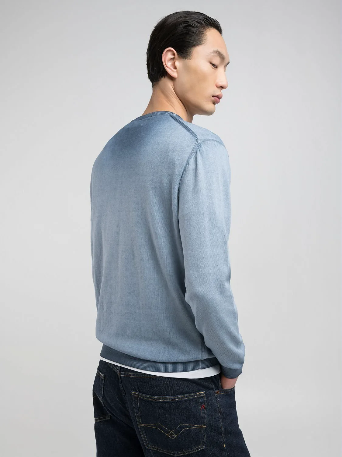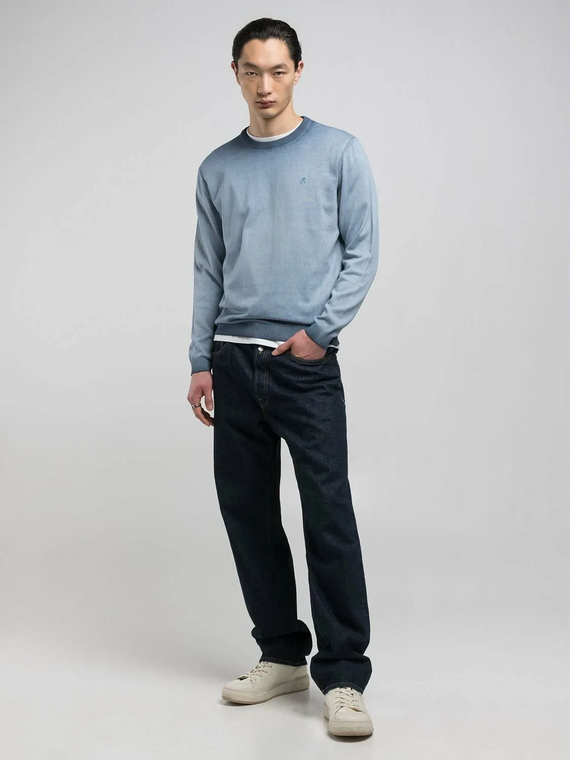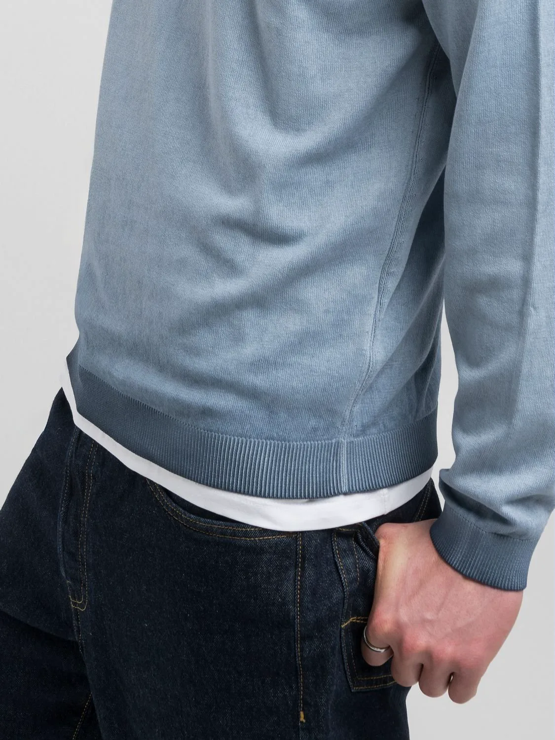 Легкая футболка с круглым вырезом, изготовленная из мягкого хлопка с уникальным эффектом омбре на воротнике и подоле. Украшена ребристой трикотажной отделкой и культовой вышитой в тон буквой R на груди. Стандартный крой.