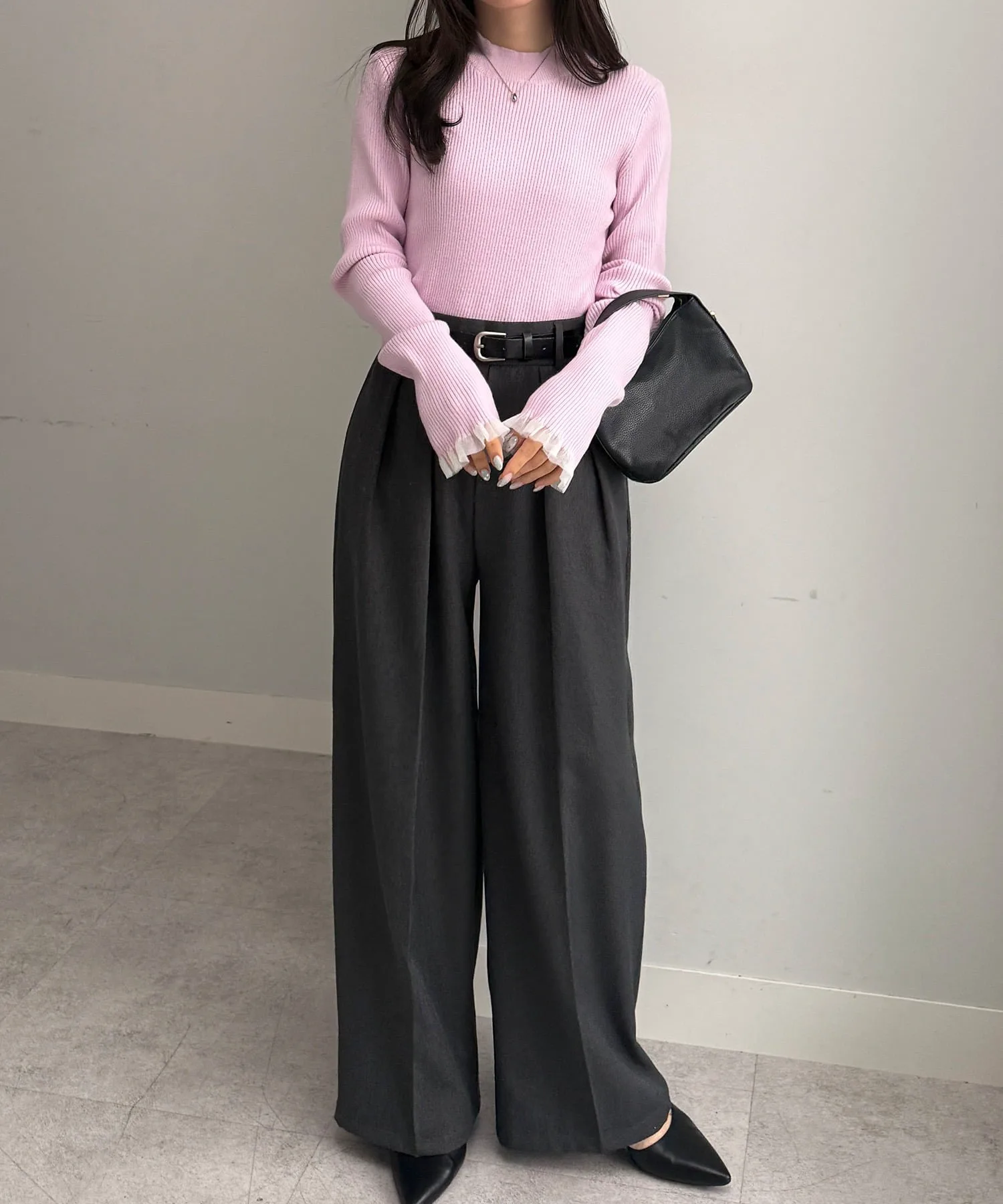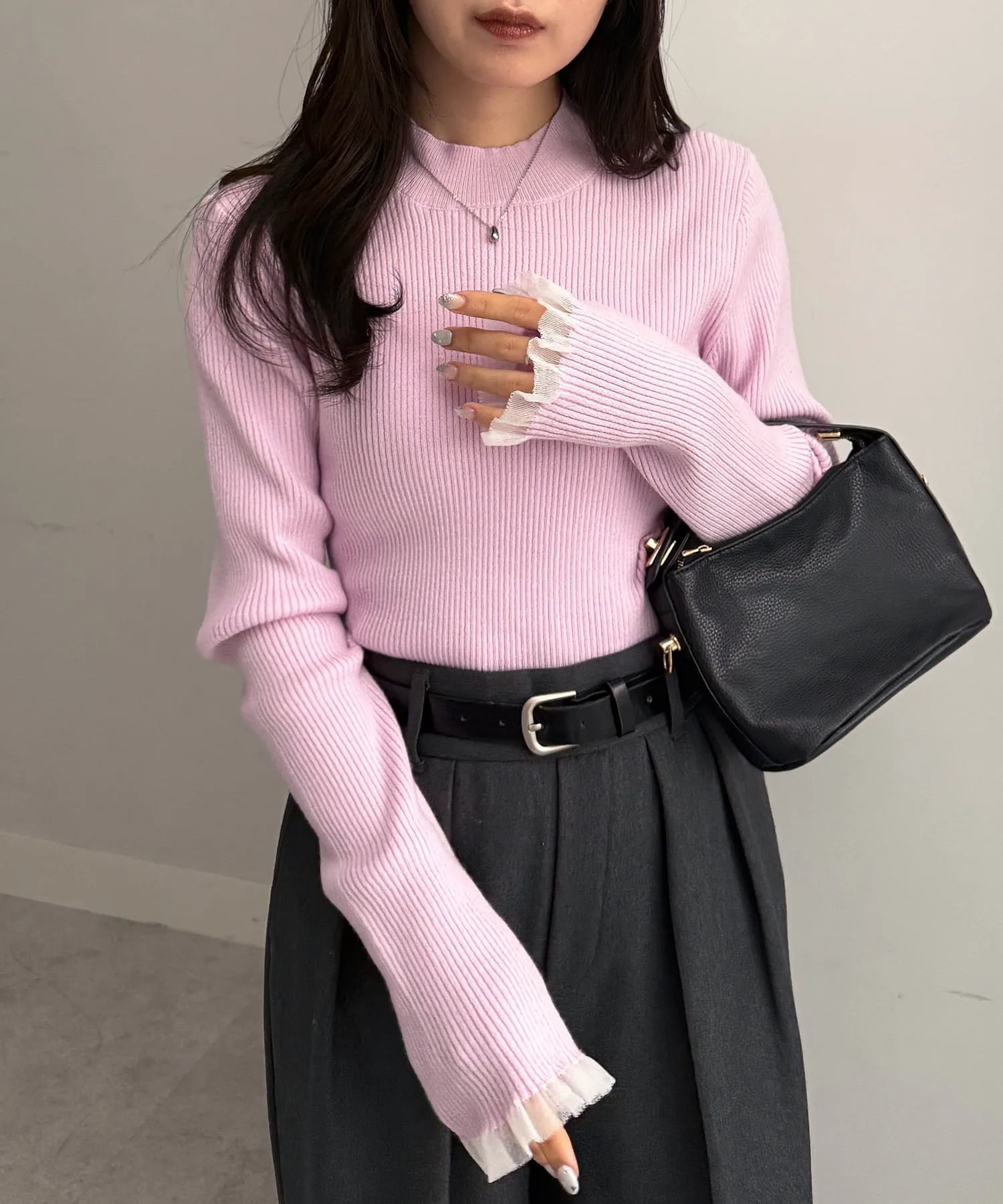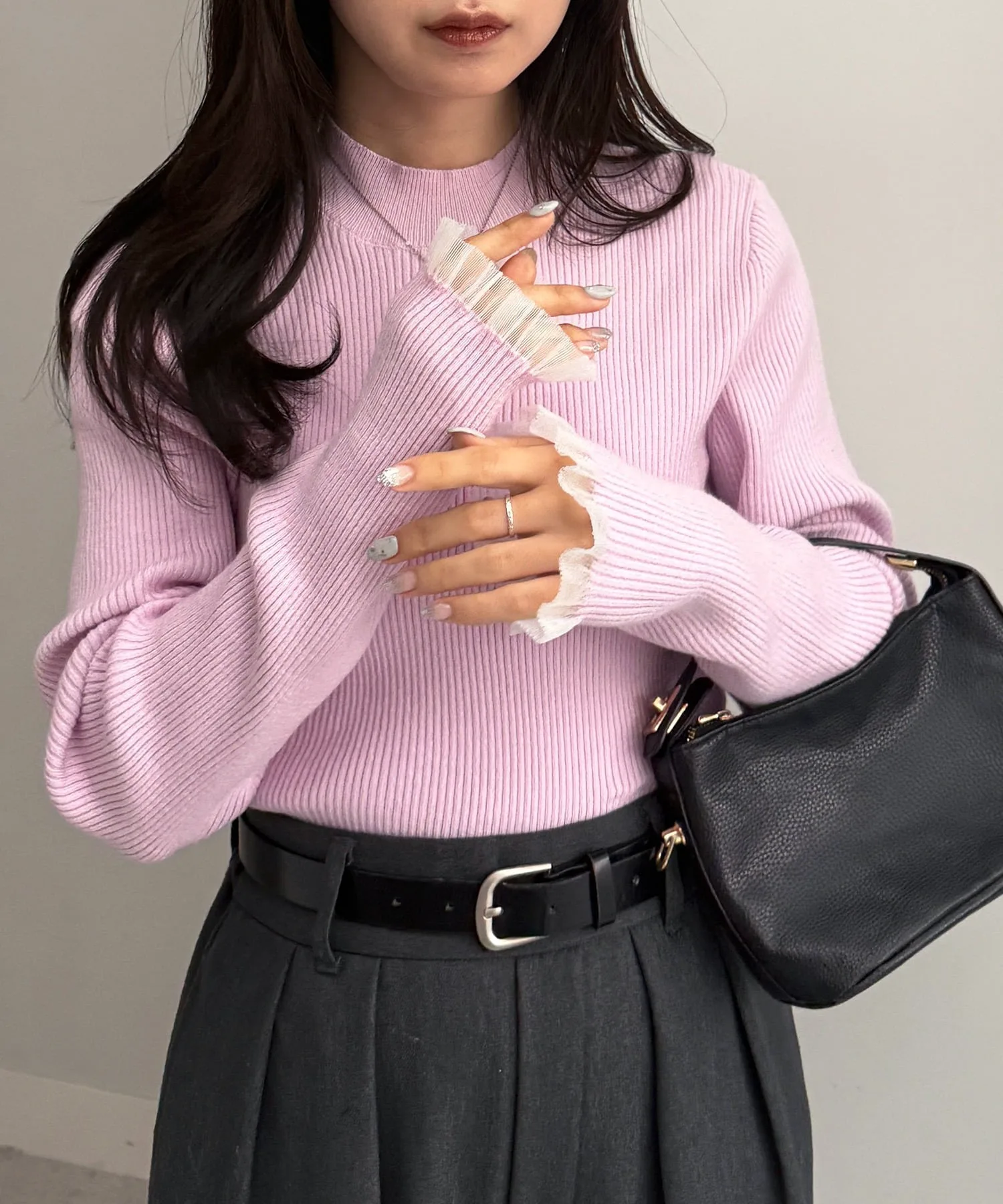 - Рукава украшены модной многослойной прозрачной вязаной оборкой.