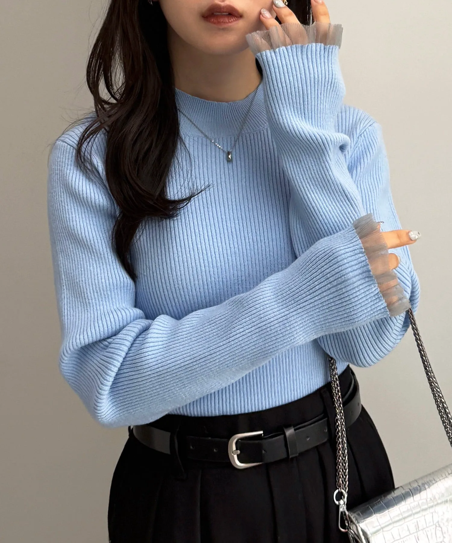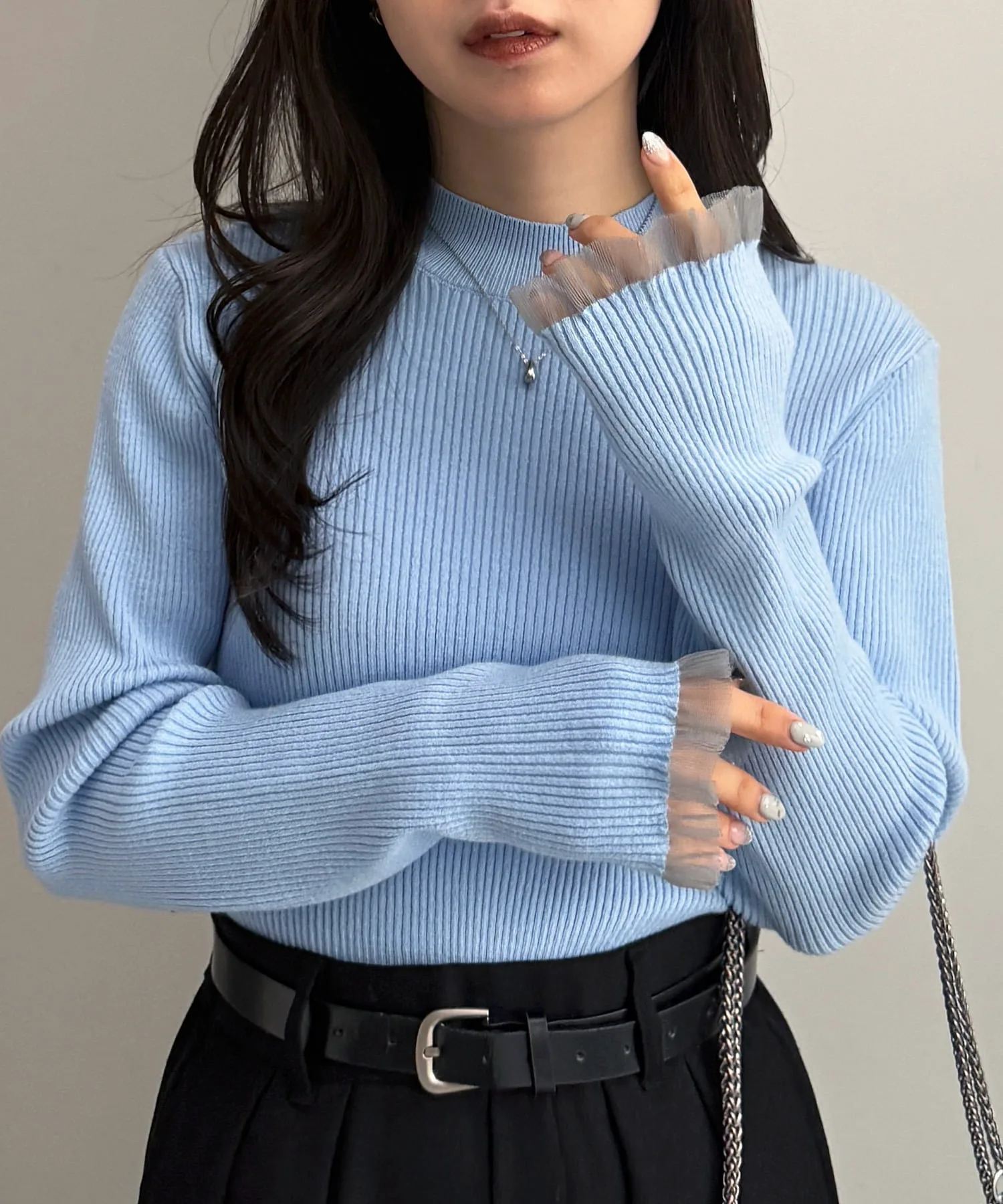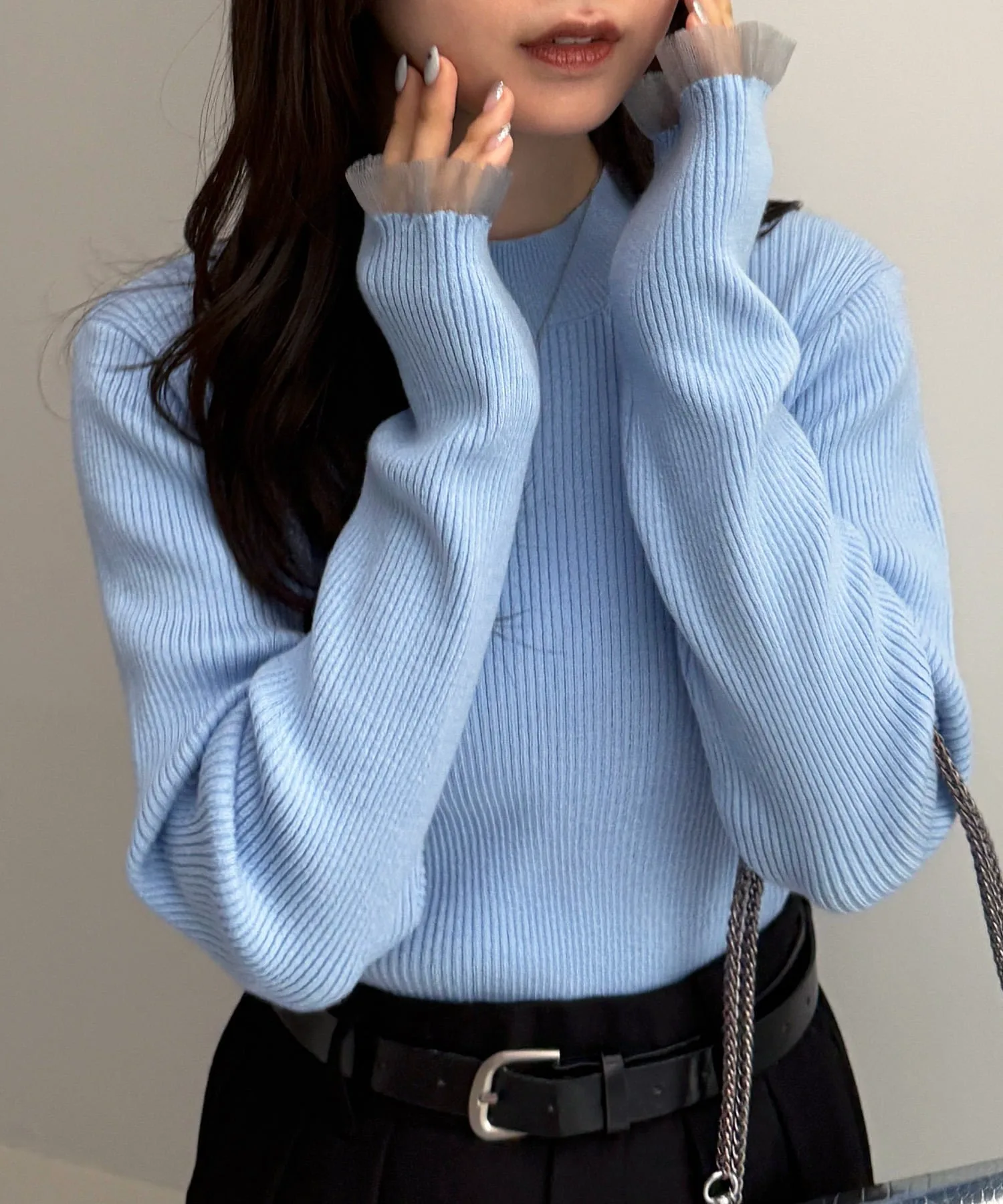- Рукава украшены модной многослойной прозрачной вязаной оборкой.