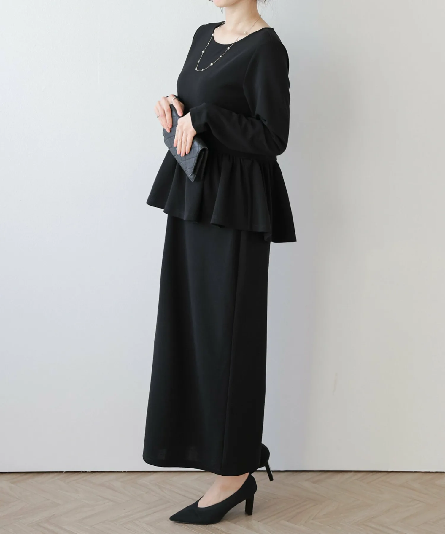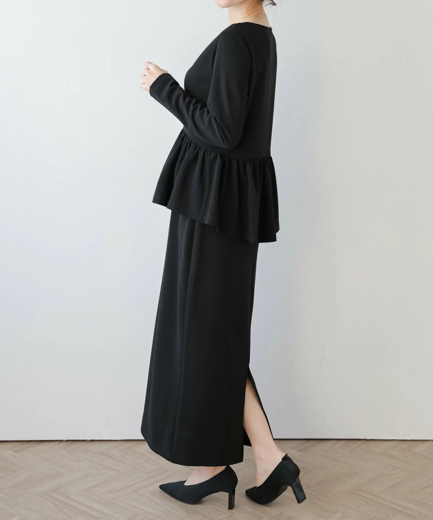 Великолепное длинное платье с баской, которое само по себе выглядит потрясающе.