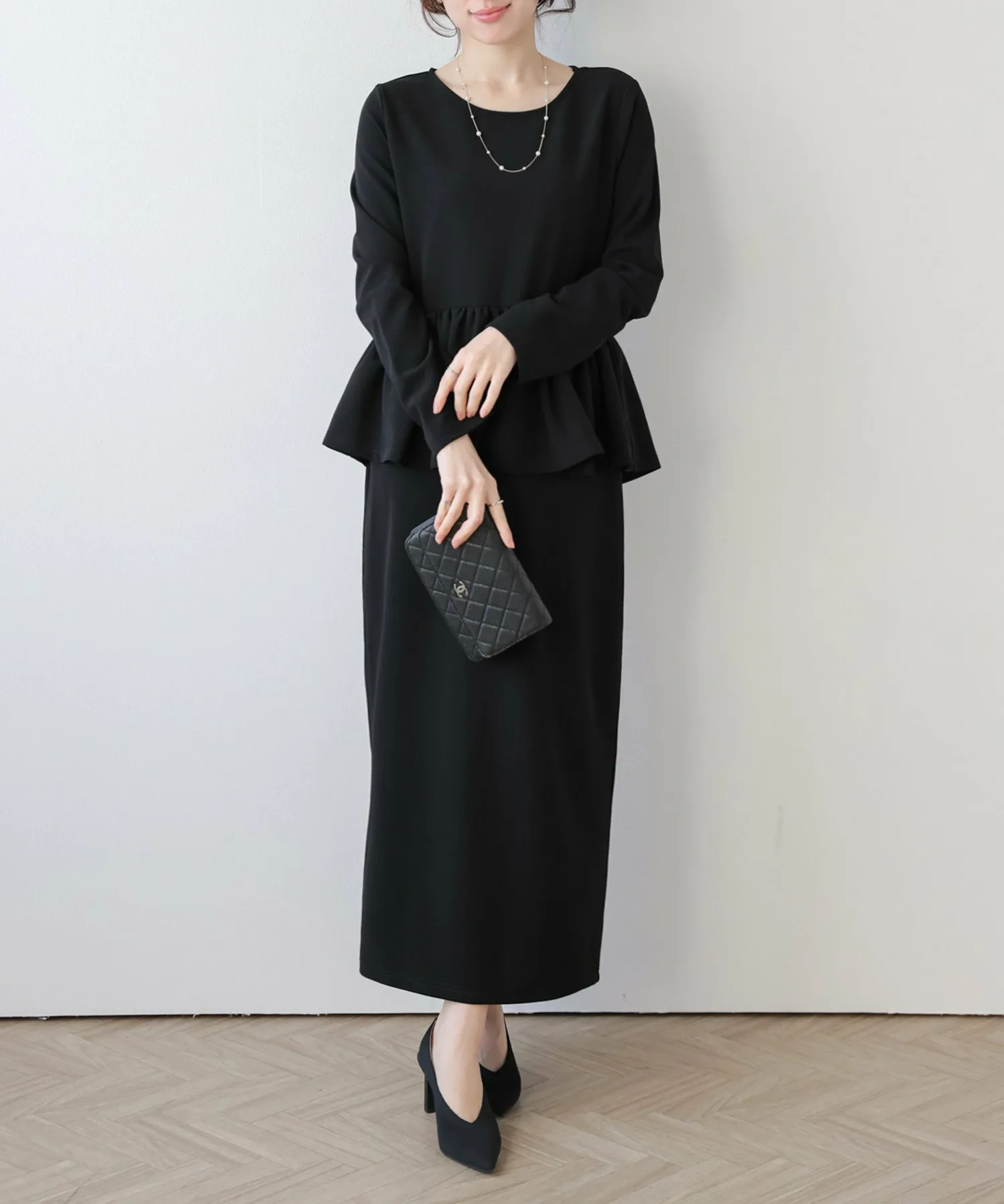 Это платье сочетает в себе топ с баской и длинную юбку,