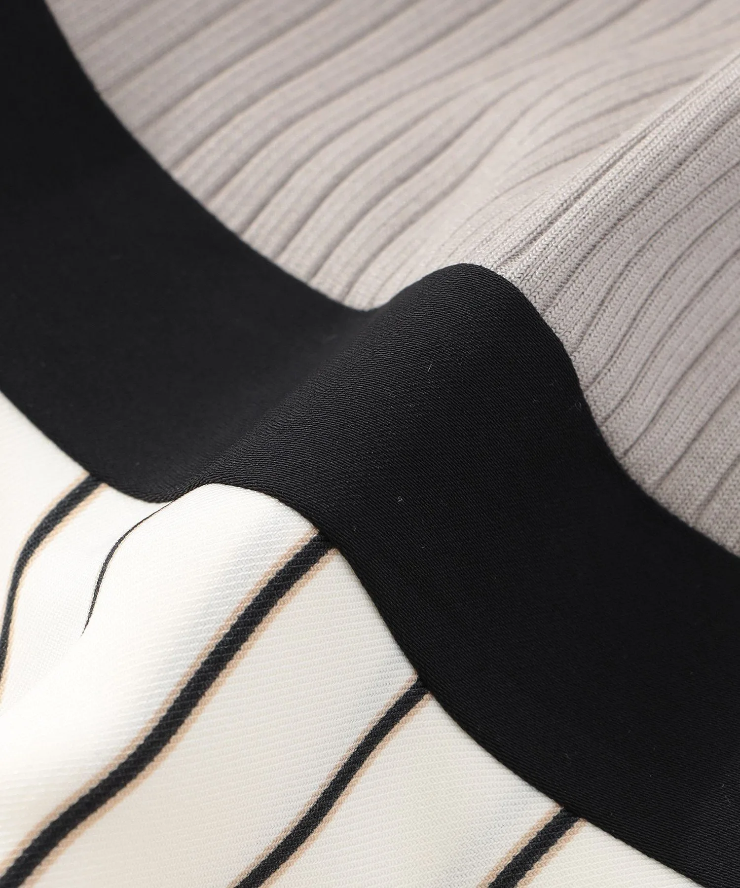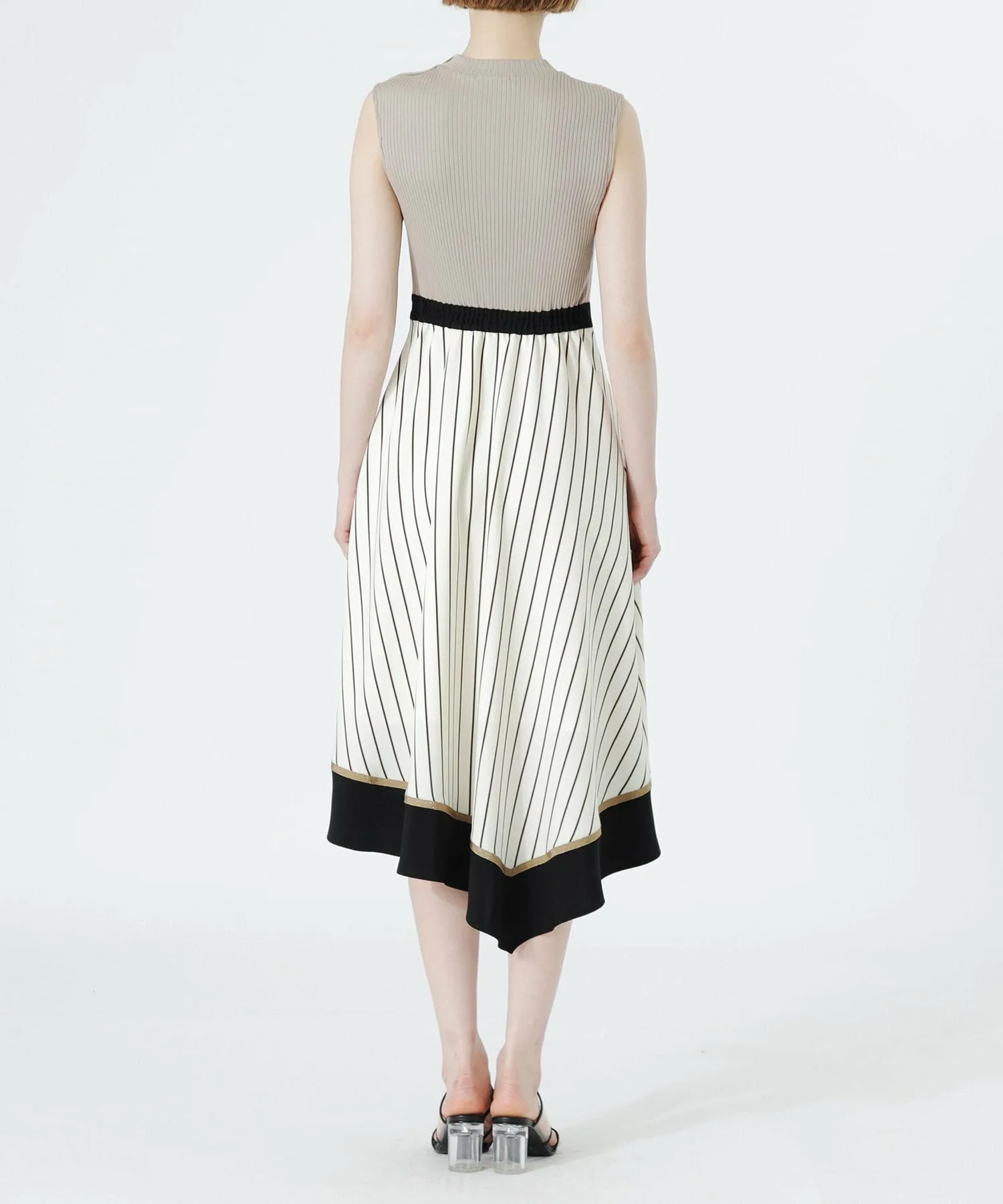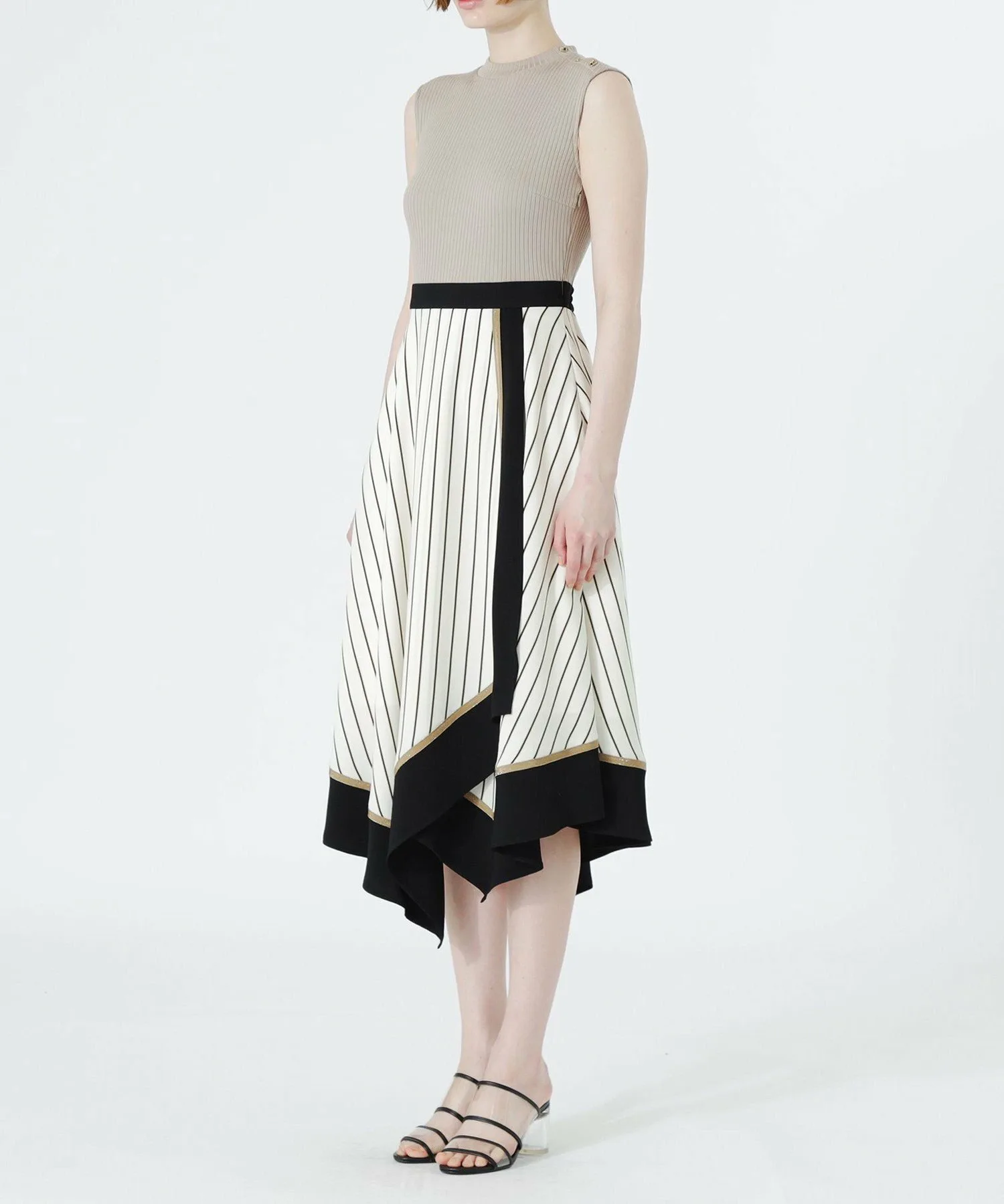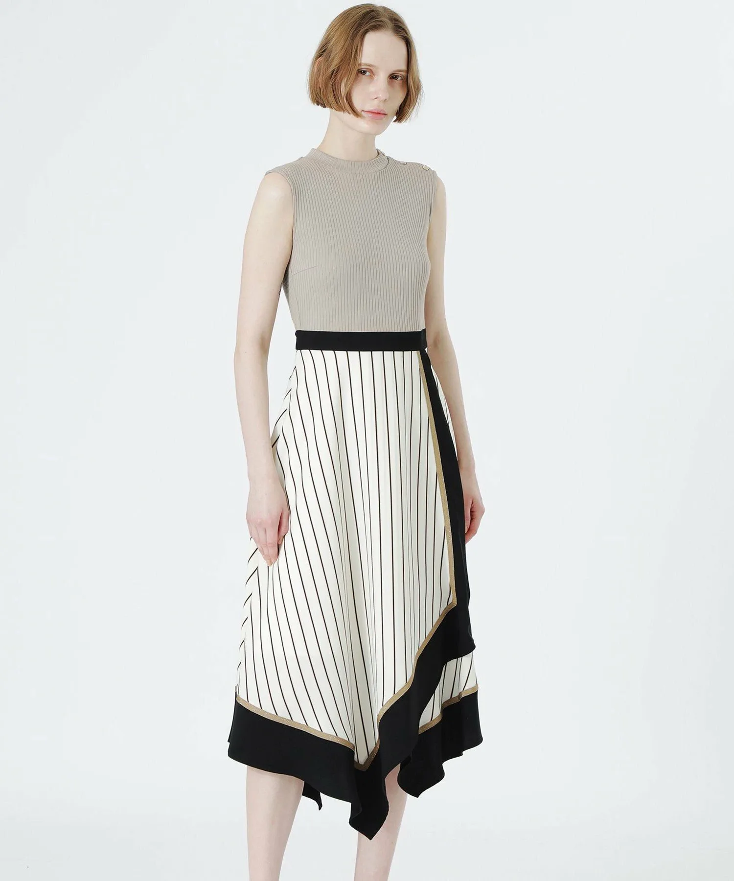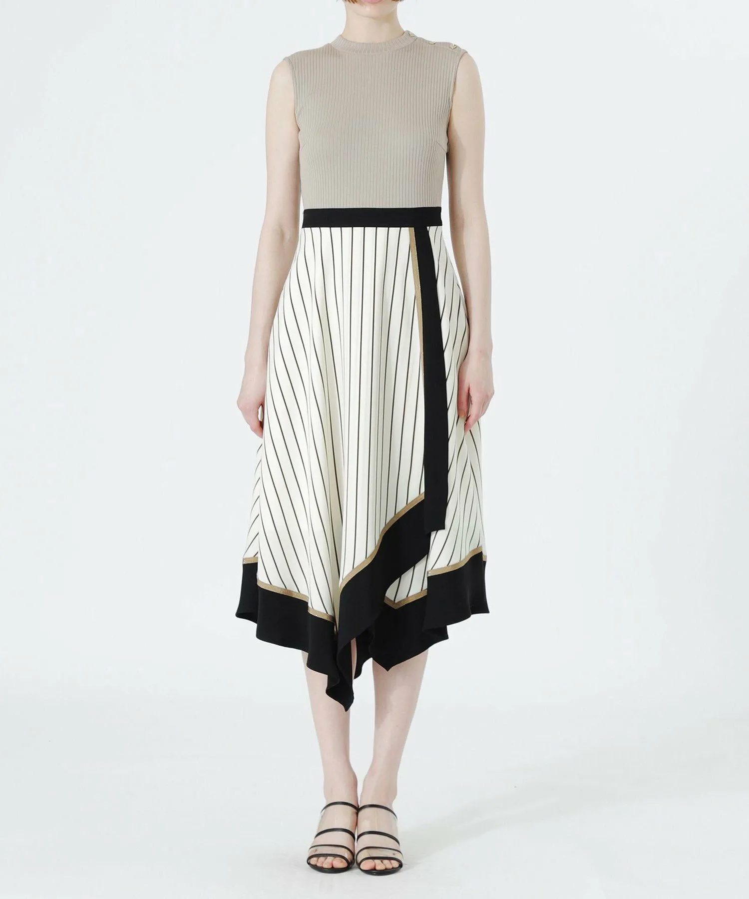 Это платье без рукавов отличается асимметричным дизайном и цветовыми блоками, популярными в каждом сезоне. Начиная с сезона весна-лето 2025, длина юбки была увеличена для еще более элегантного вида. В этом сезоне юбка доступна в трех уникальных материалах: полосатый, летний твид и с цветочным принтом. Материал: Верхняя часть выполнена из блестящего трикотажа, обеспечивающего комфортную посадку и создающего изысканное впечатление. Юбка украшена сухим, утонченным полосатым узором для стильного образа. Еще одно замечательное преимущество – возможность ручной стирки в домашних условиях. Силуэт/Дизайн: Компактный силуэт и юбка имеют роскошный расклешенный дизайн, напоминающий шарф. Полосатый узор создает эффектный дизайн, воплощающий фирменный стиль LOVELESS.