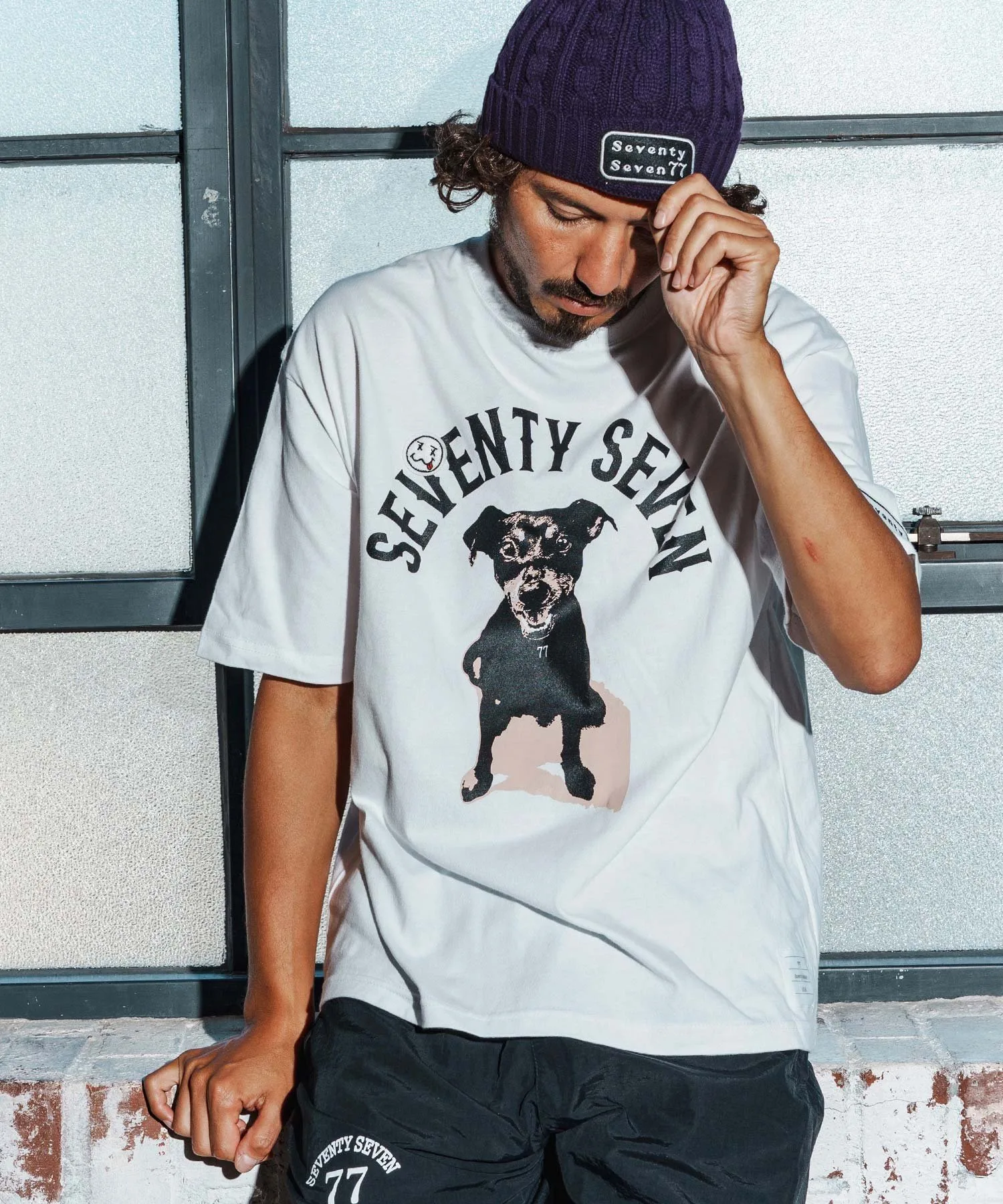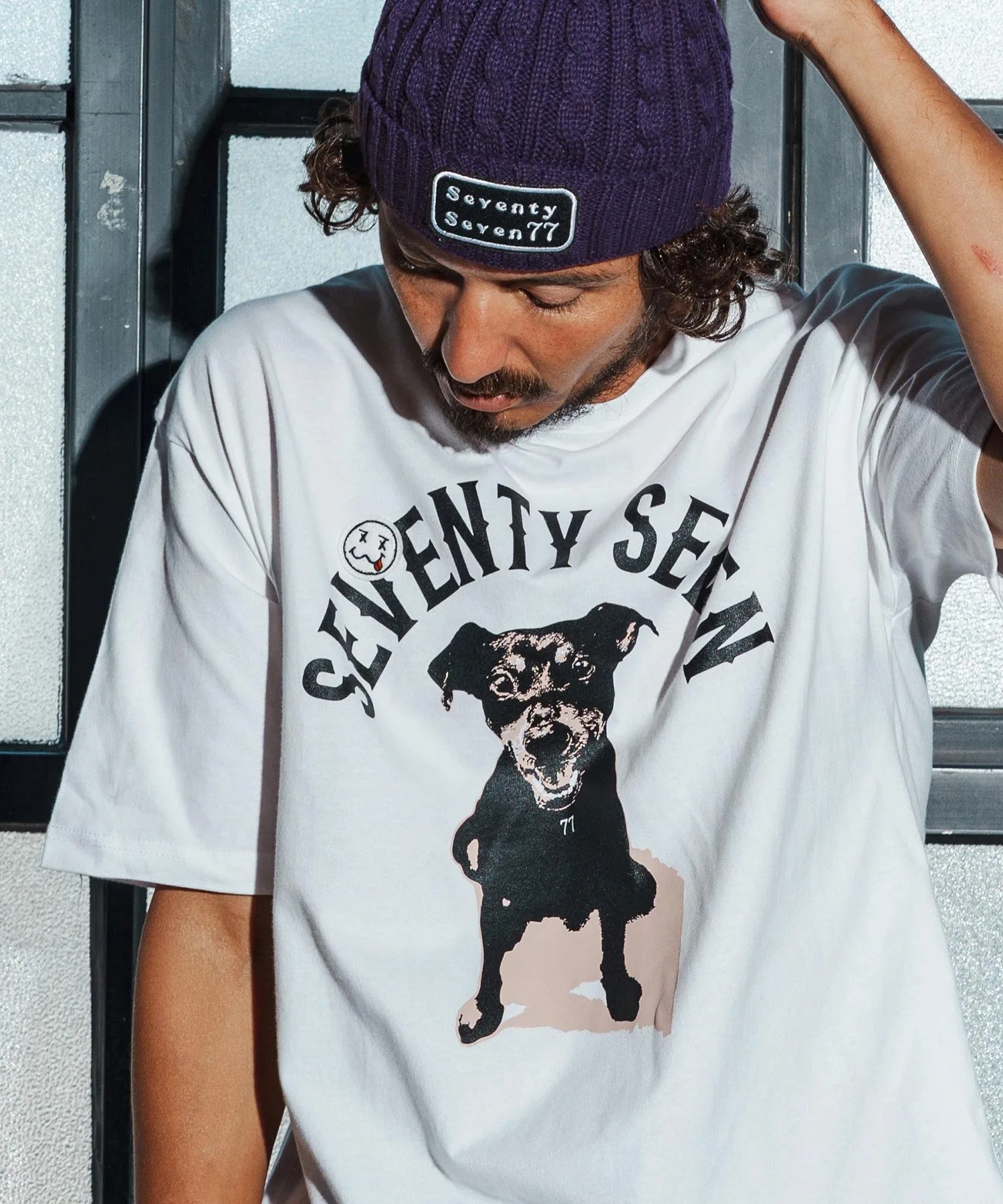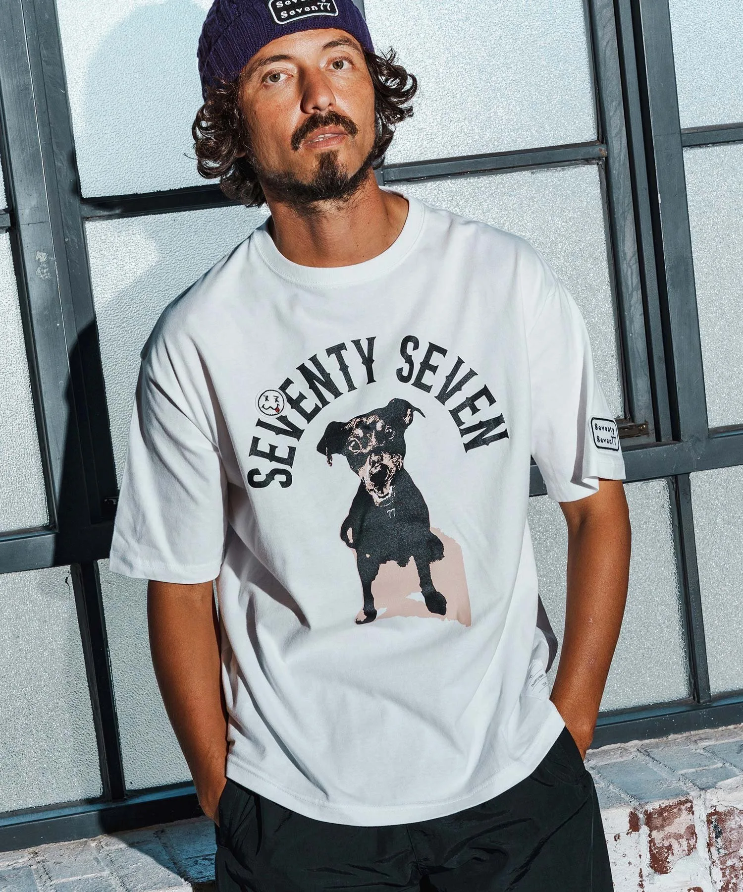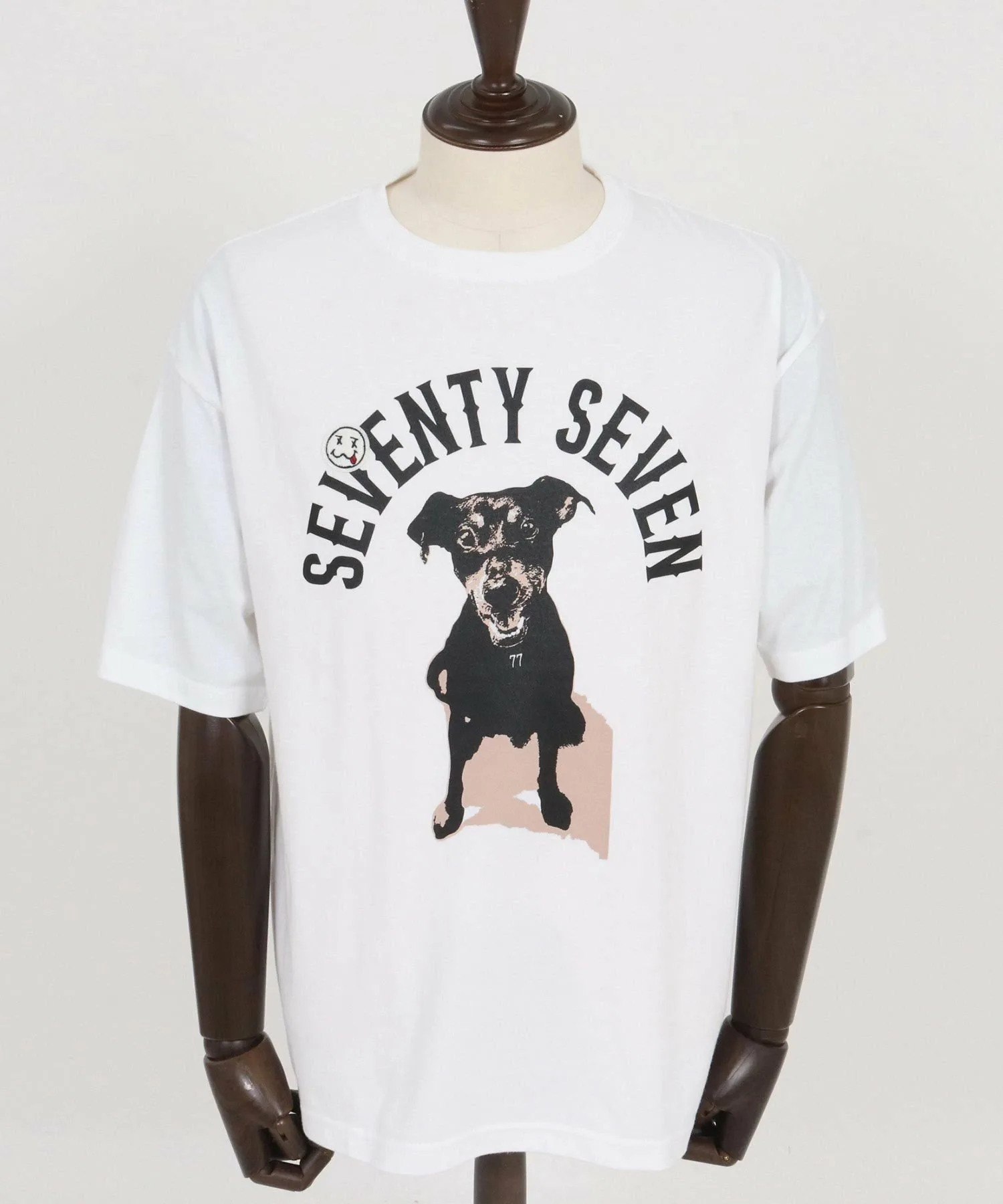 Шелковый принт на основной части, поверх которого нашита нашивка 77 Smile.