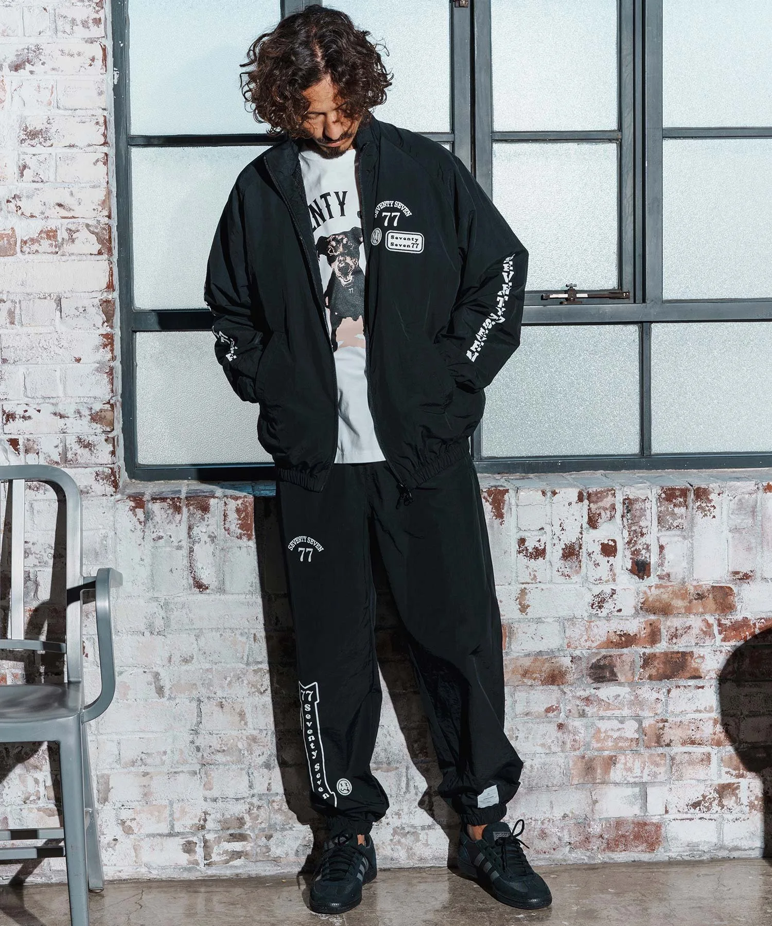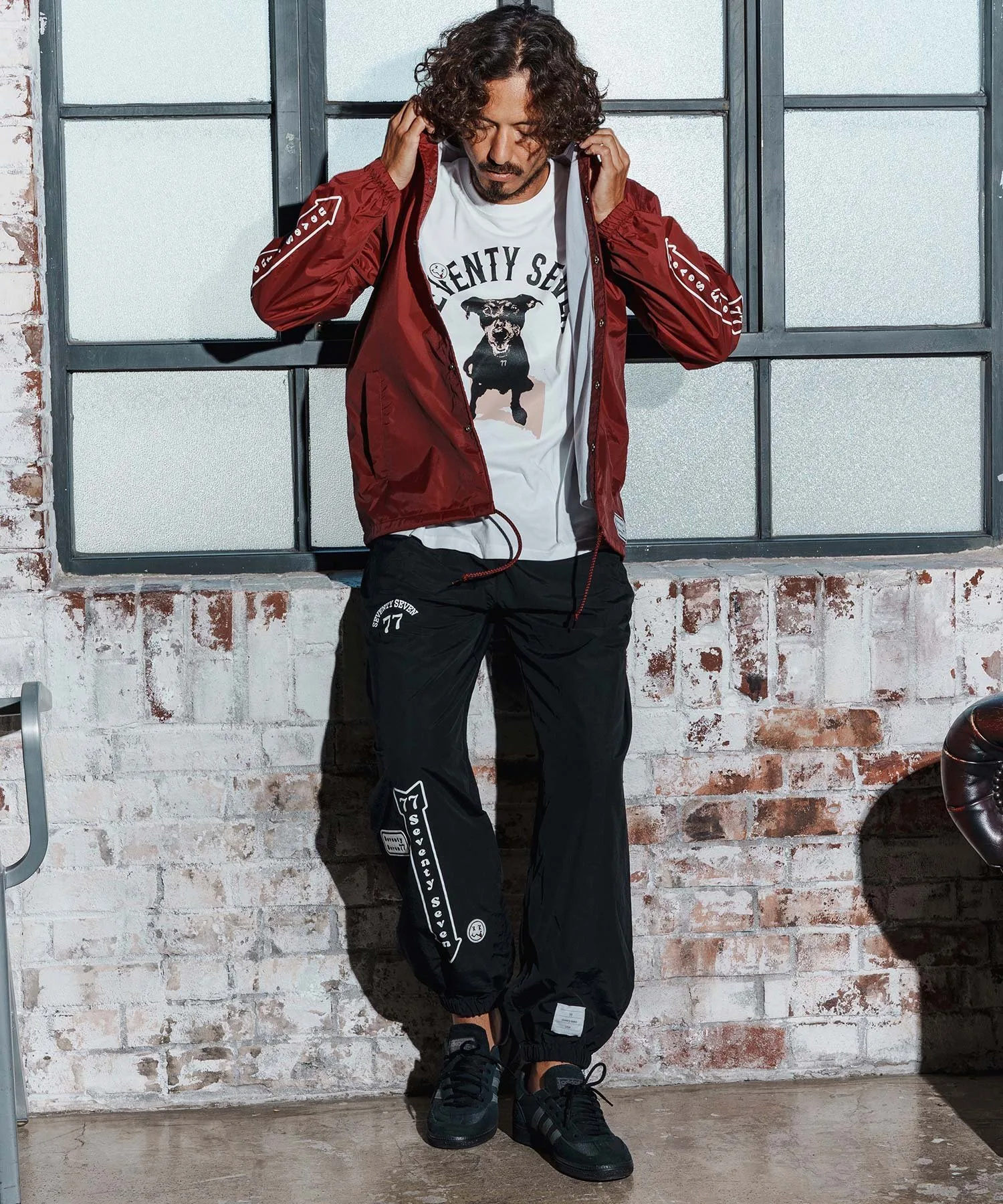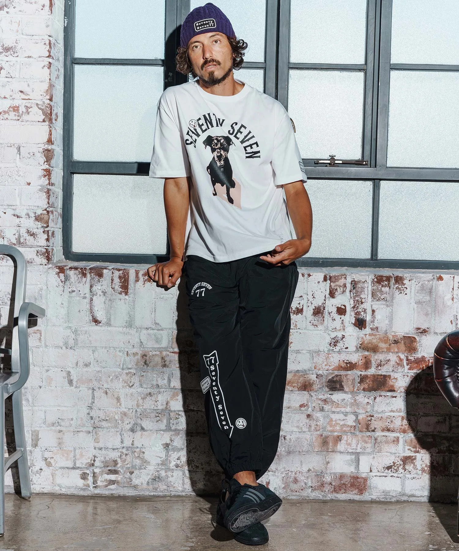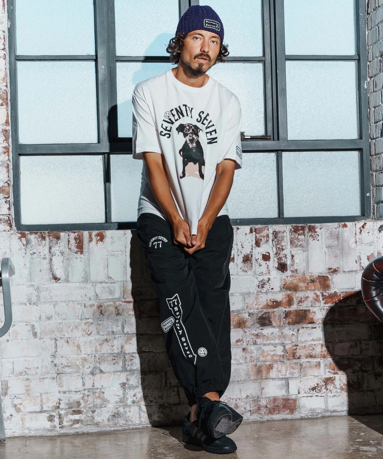 Шелковый принт на основной части, поверх которого нашита нашивка 77 Smile.
