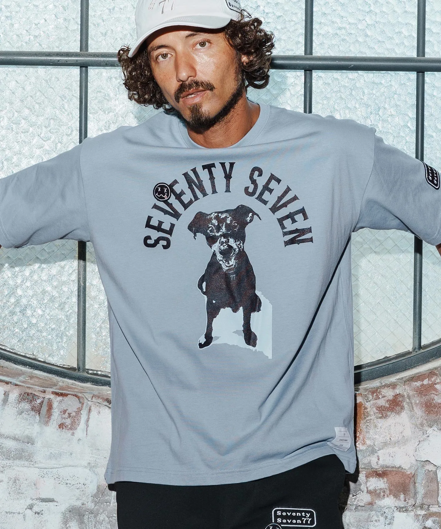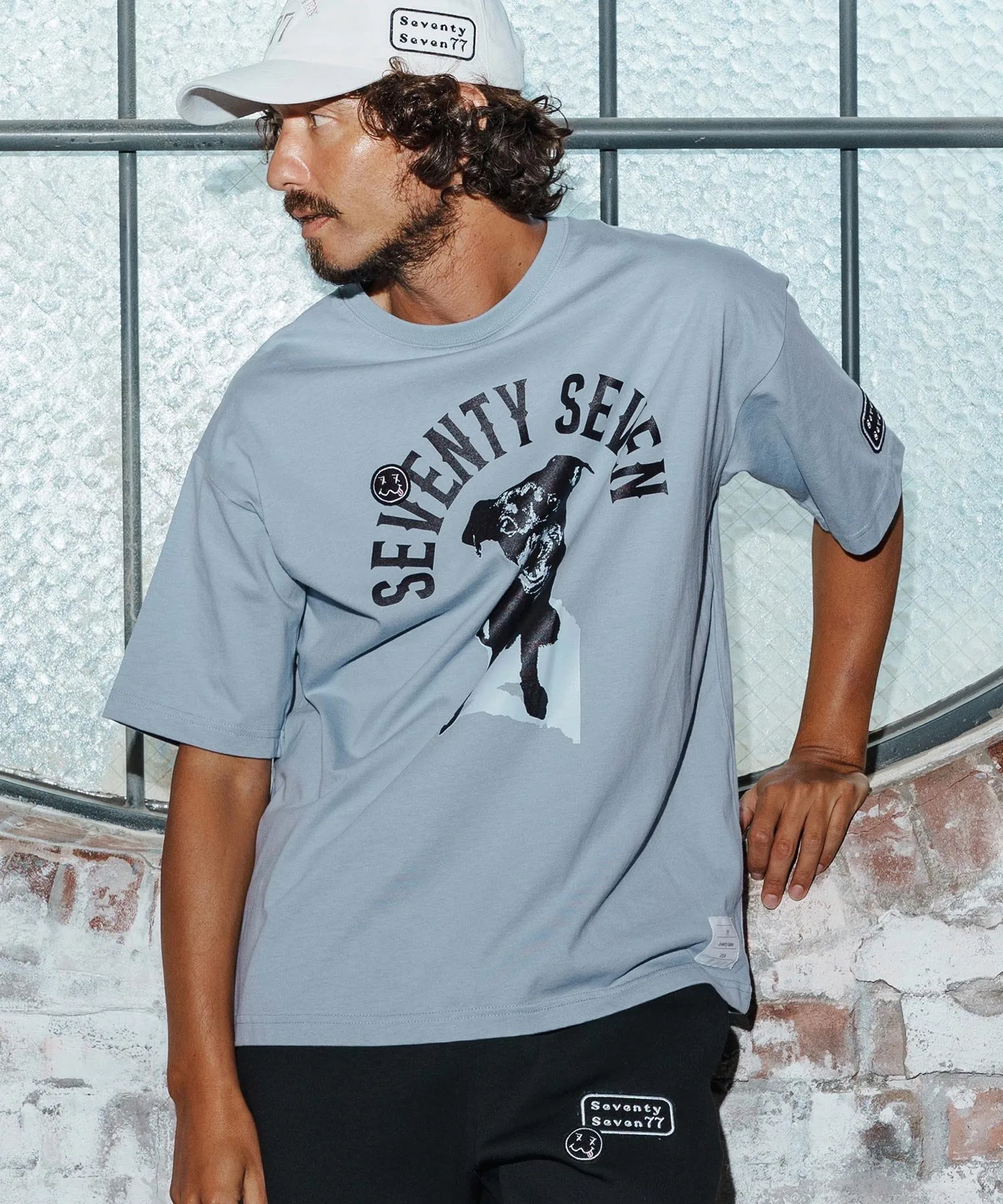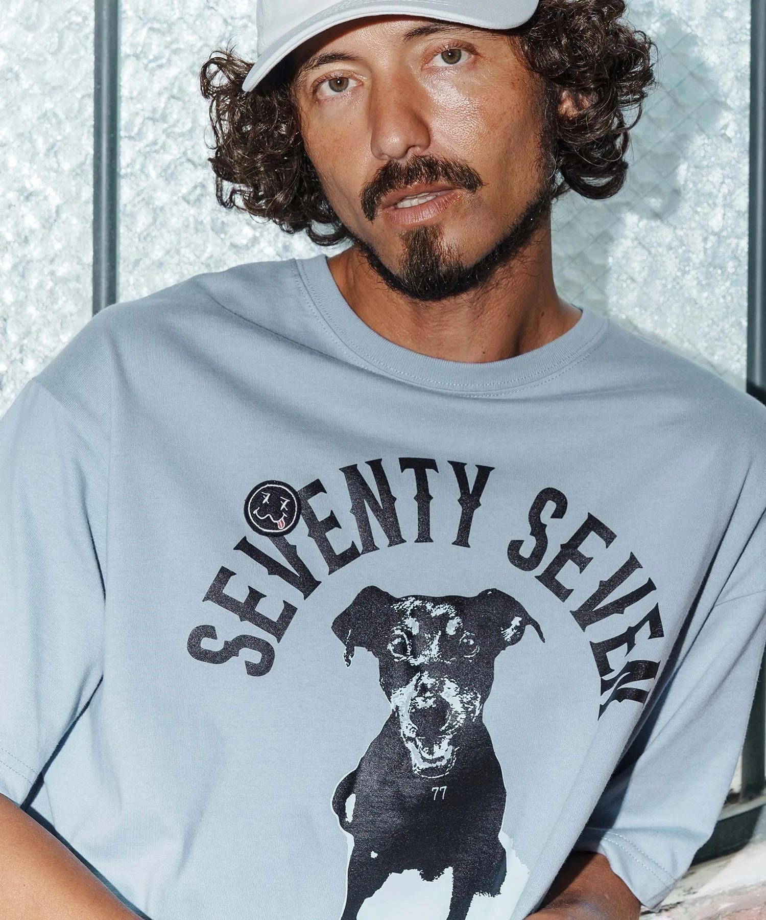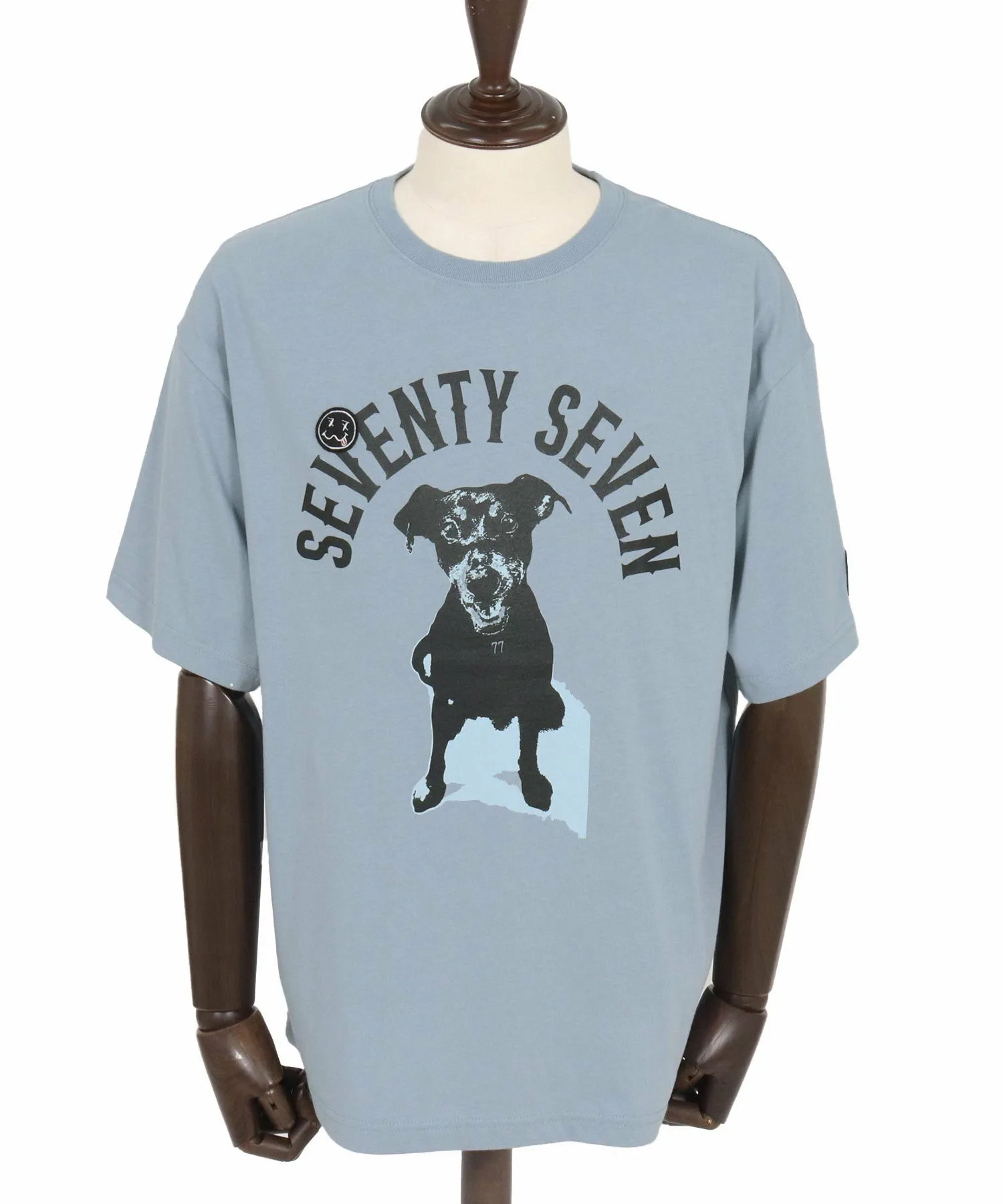 Шелковый принт на основной части, поверх которого нашита нашивка 77 Smile.