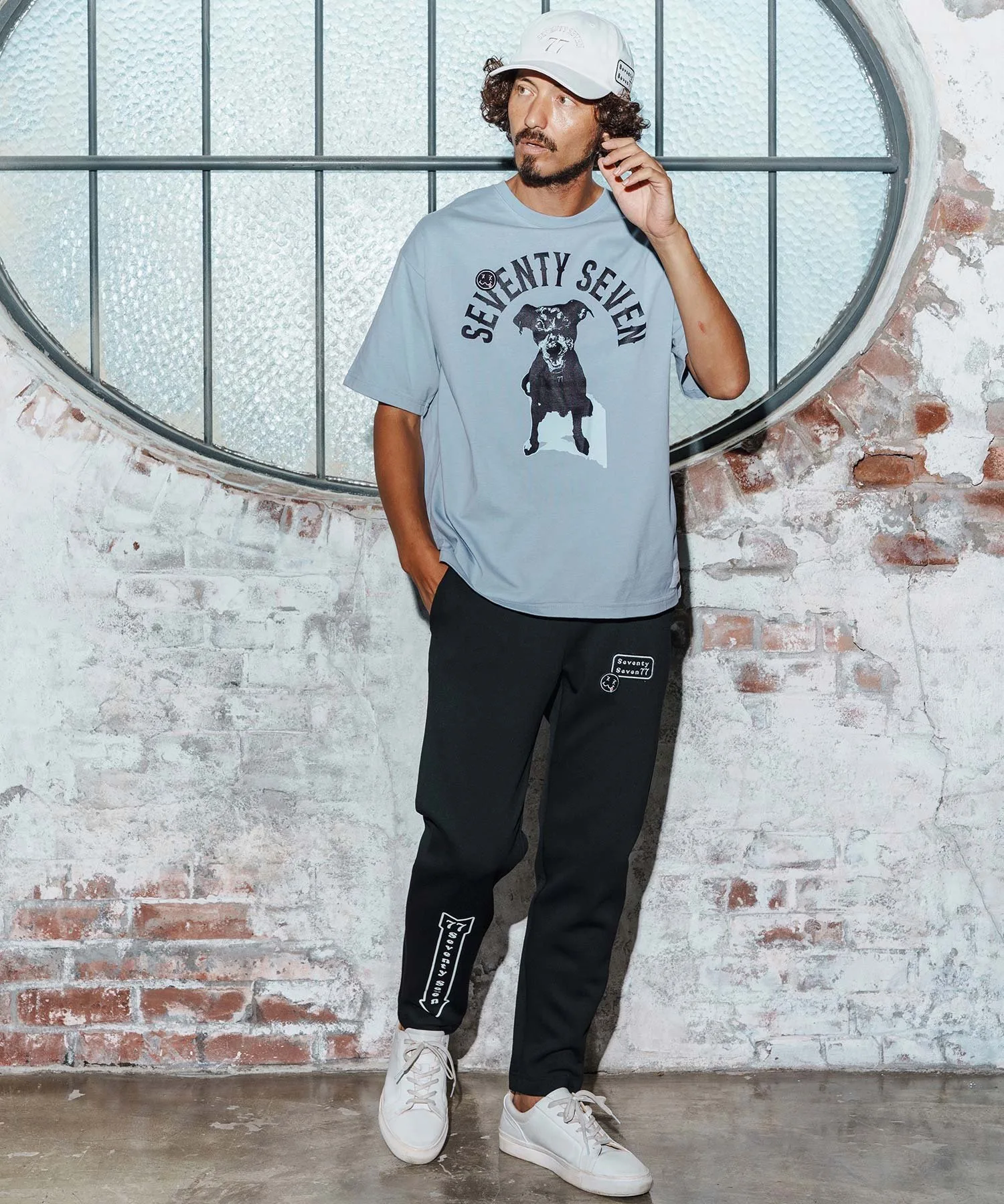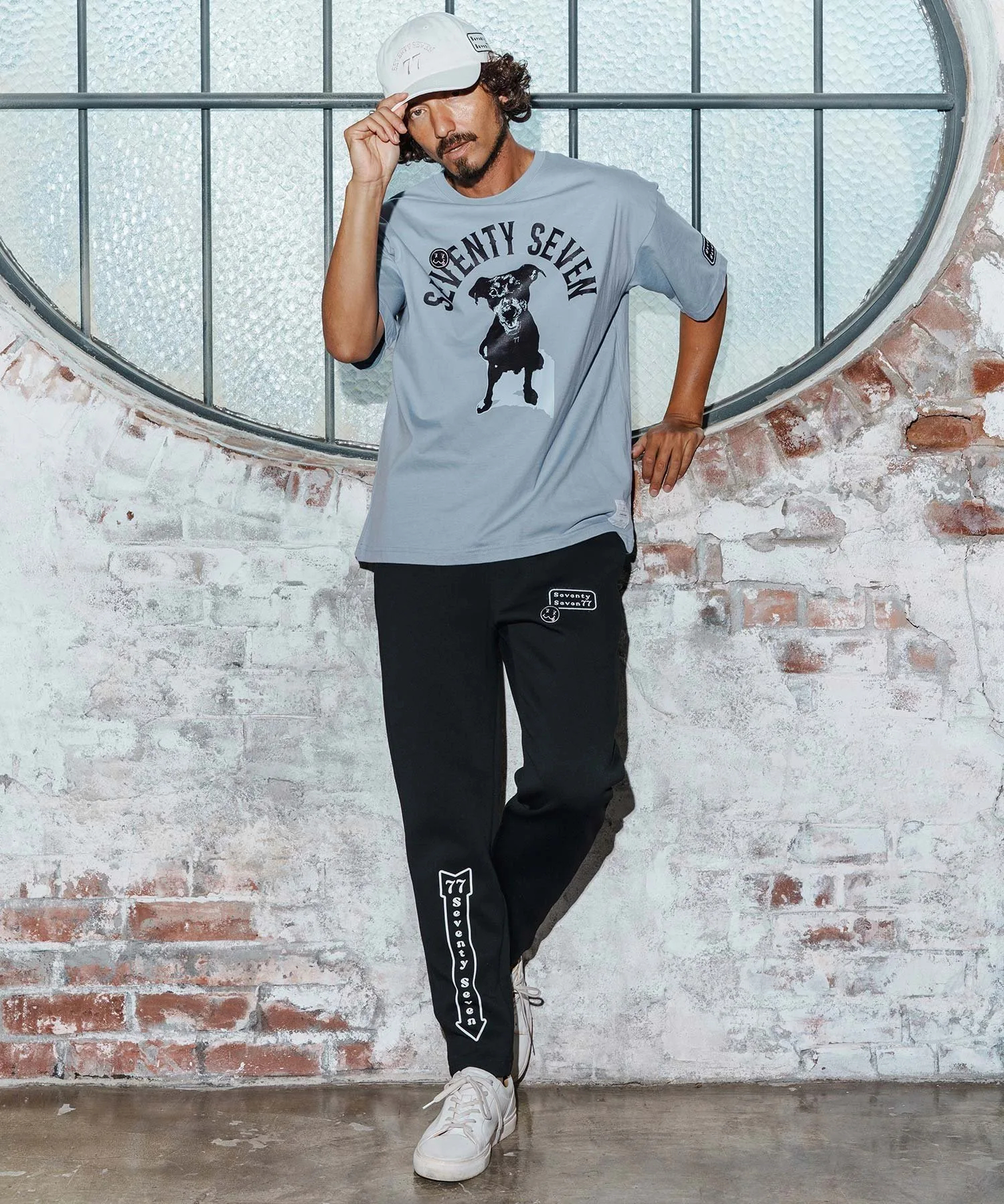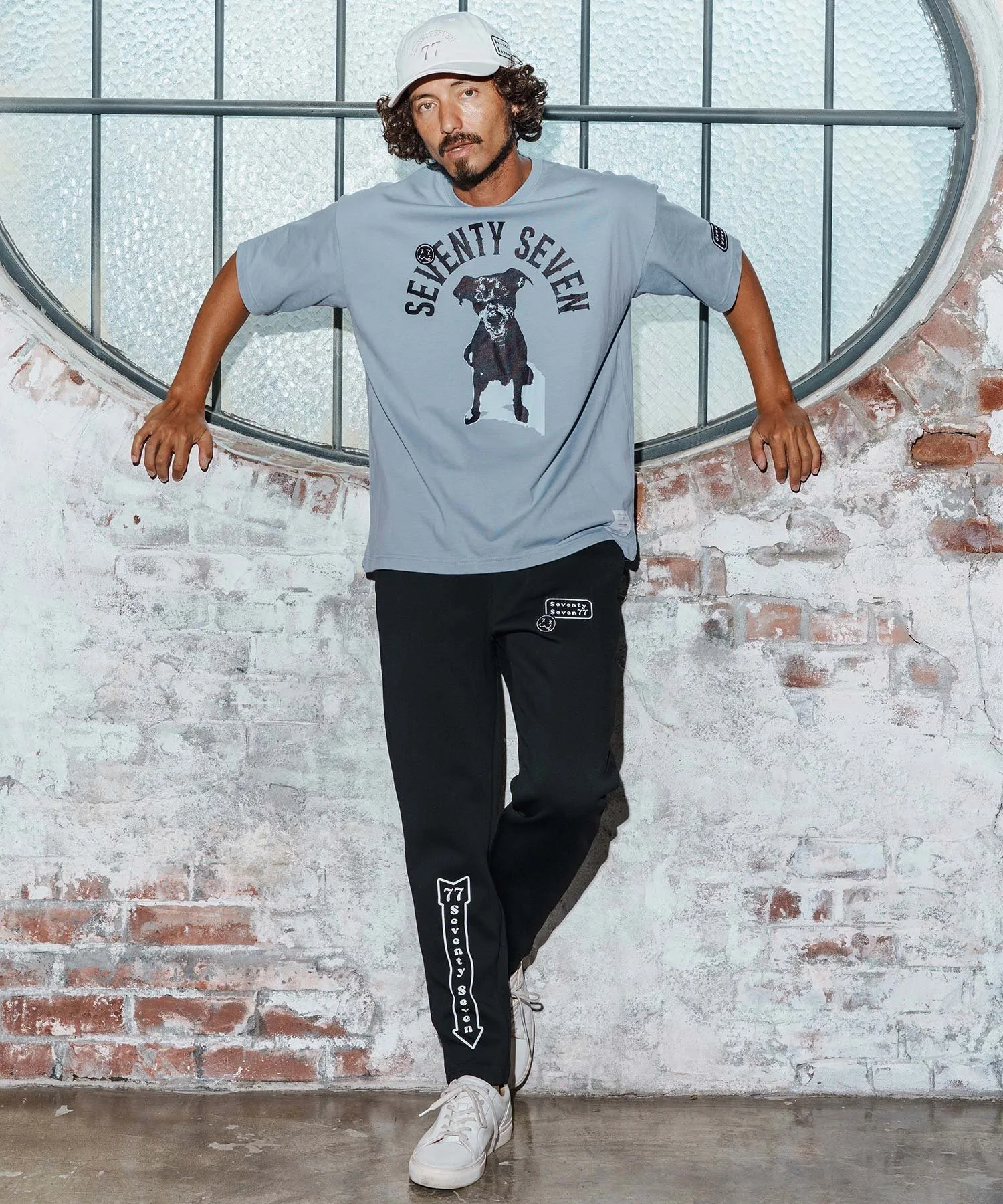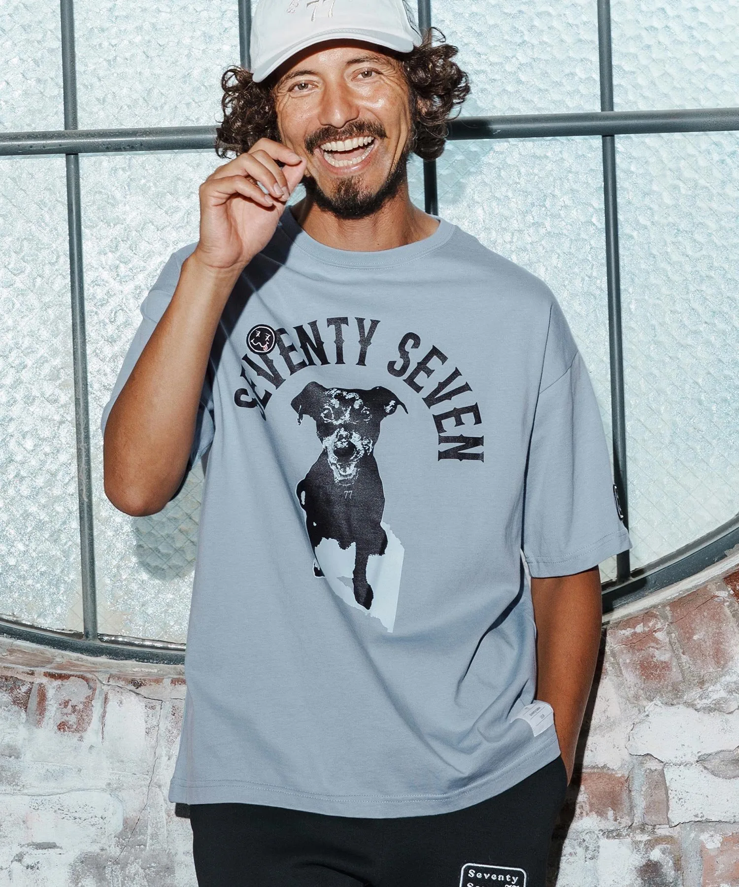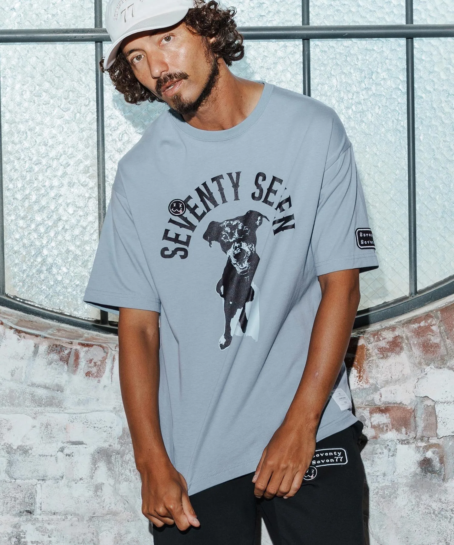 Шелковый принт на основной части, поверх которого нашита нашивка 77 Smile.