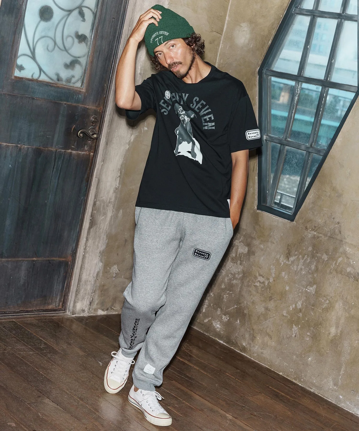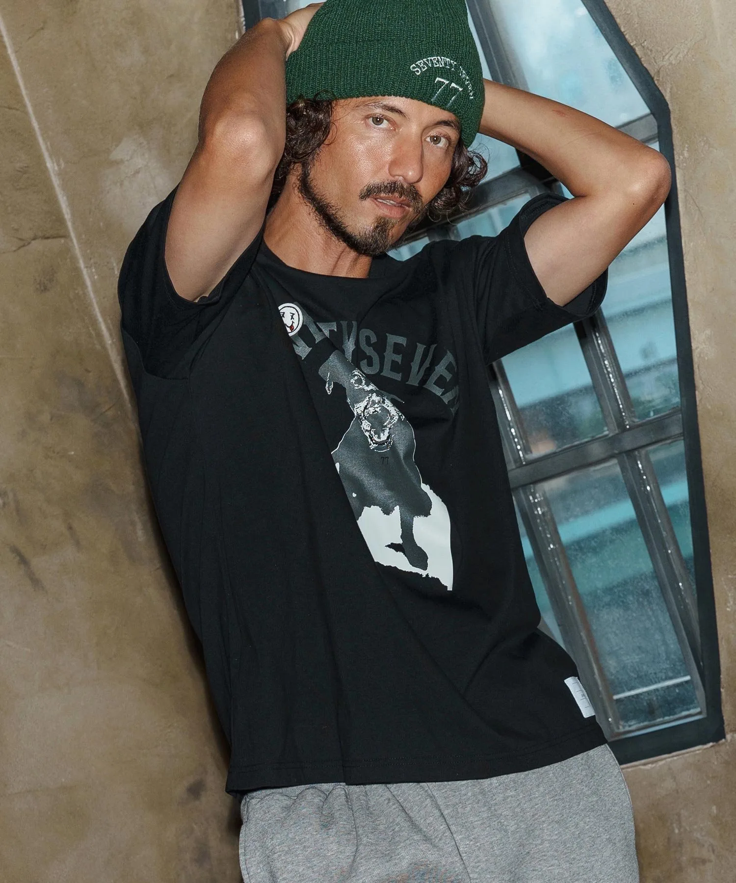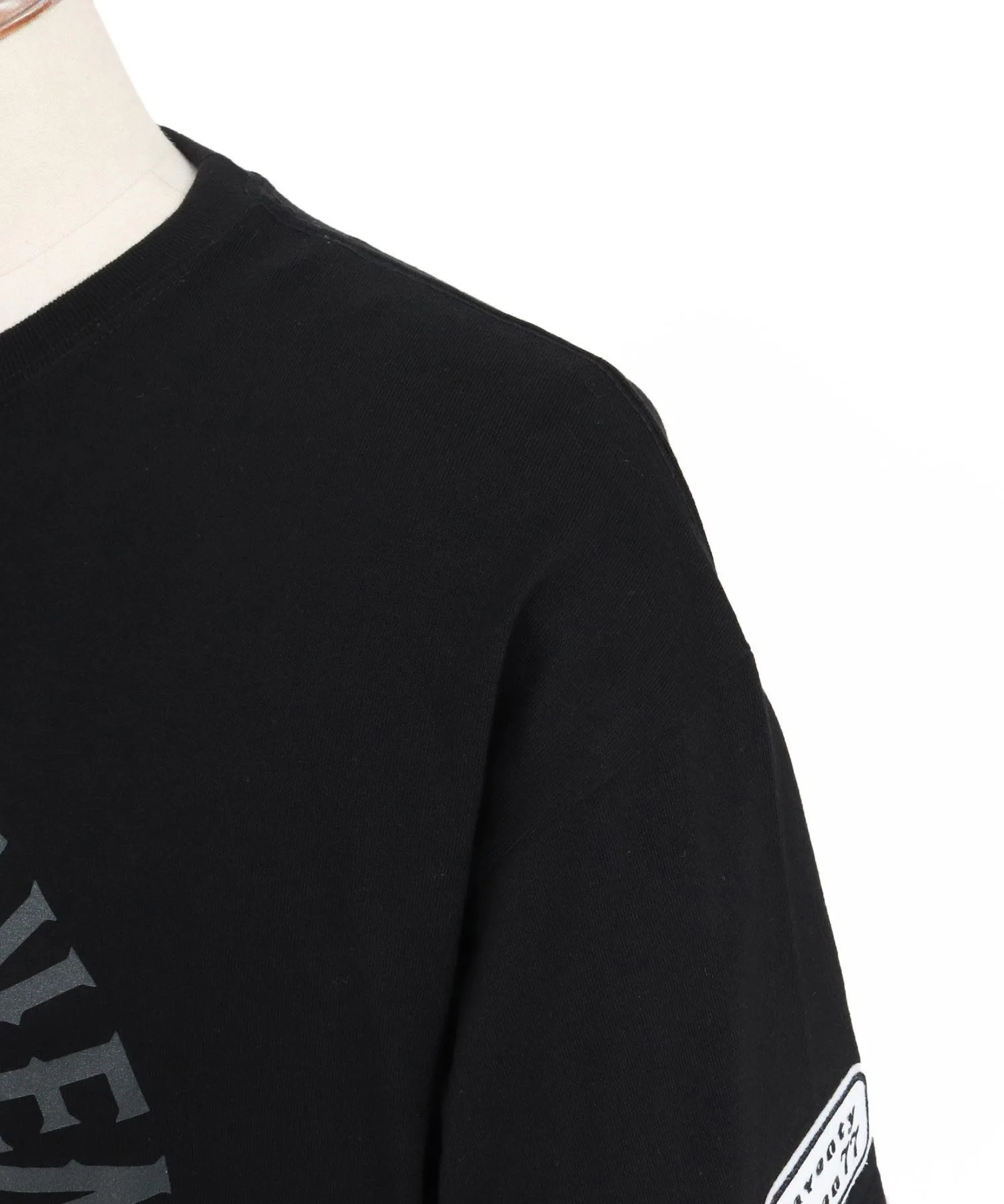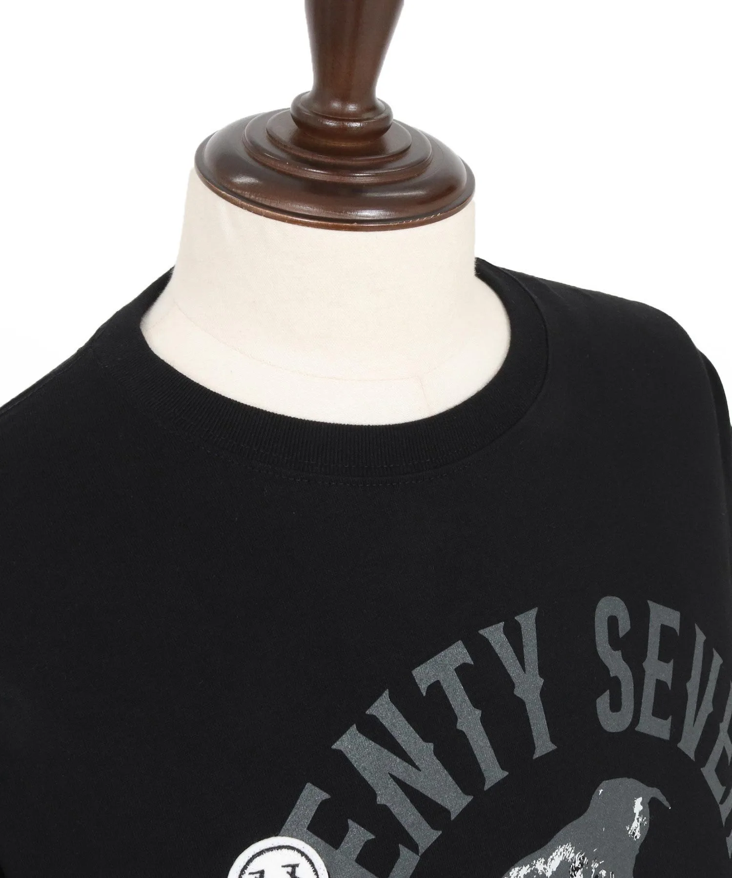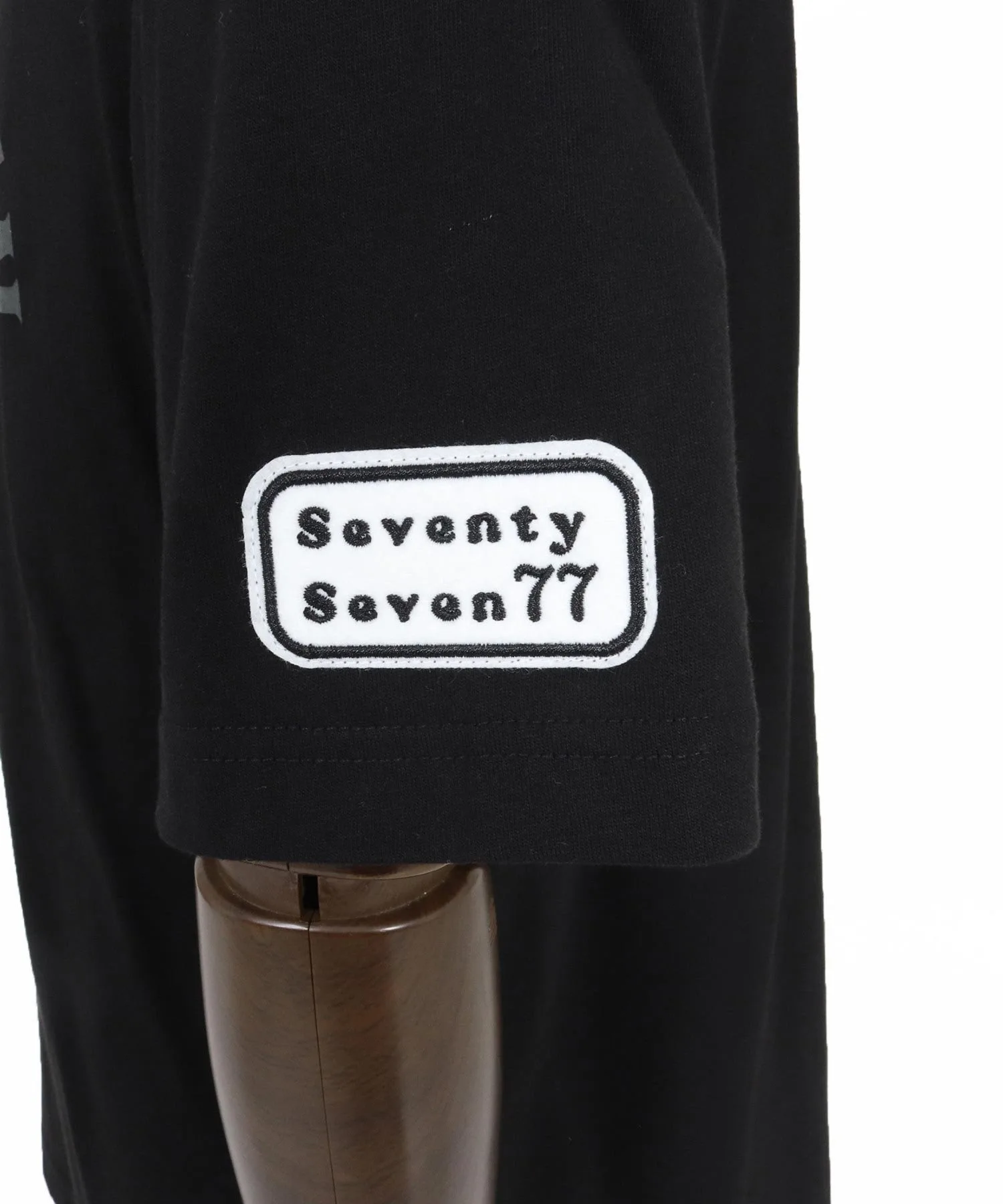 Шелковый принт на основной части, поверх которого нашита нашивка 77 Smile.