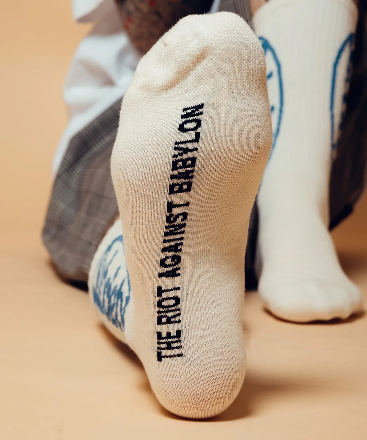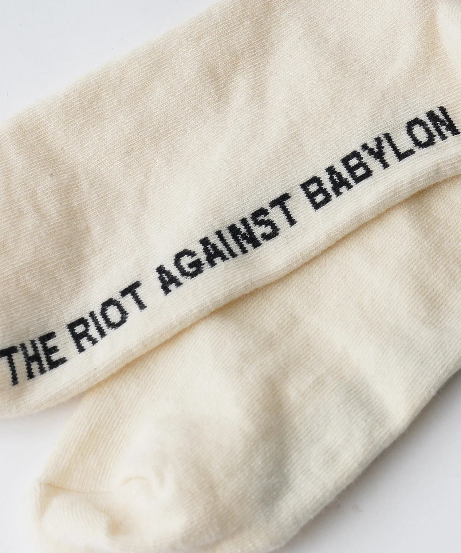 На подошве жаккардовым способом нанесена надпись "THERIOTAGAINSTBABYLON".