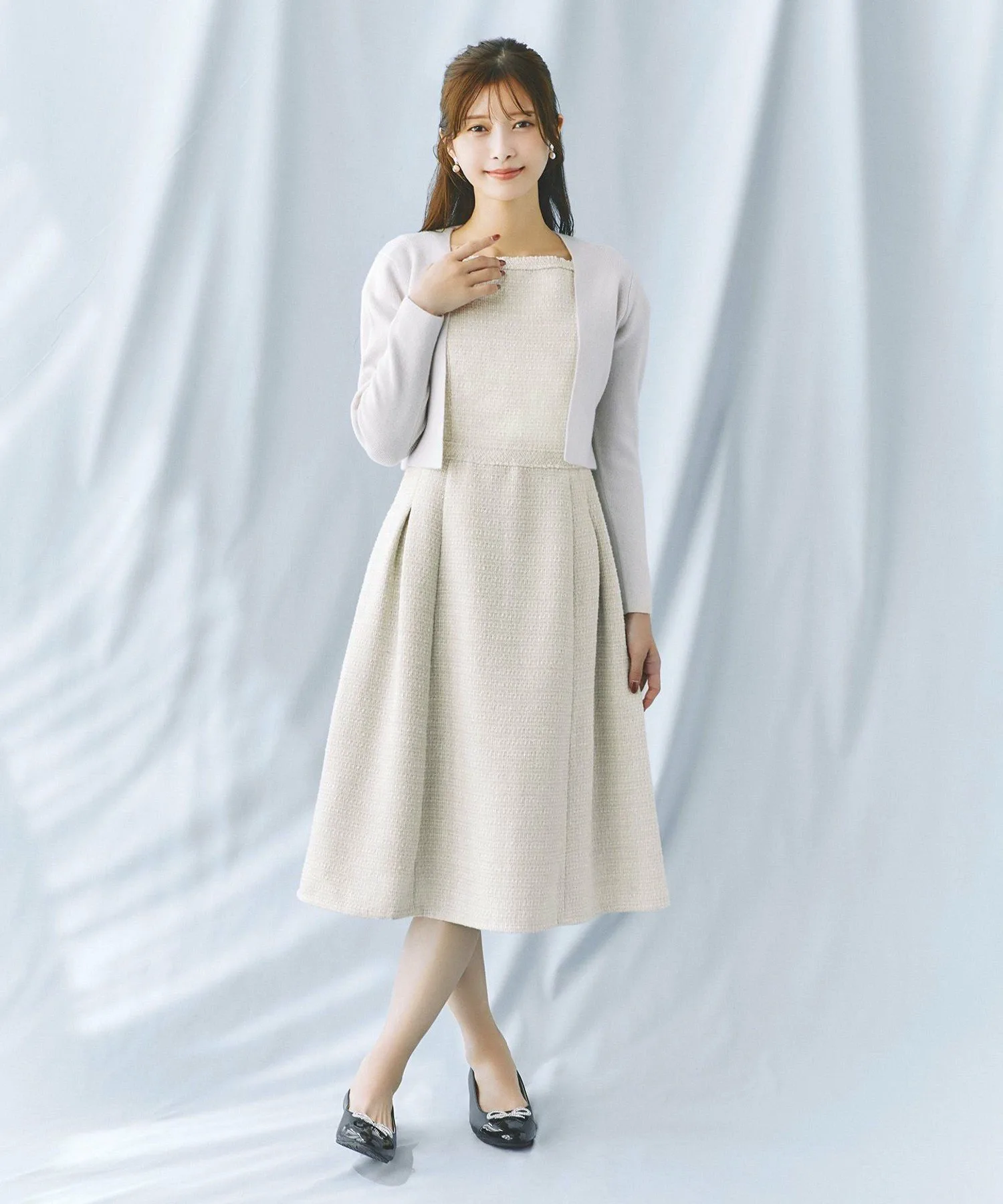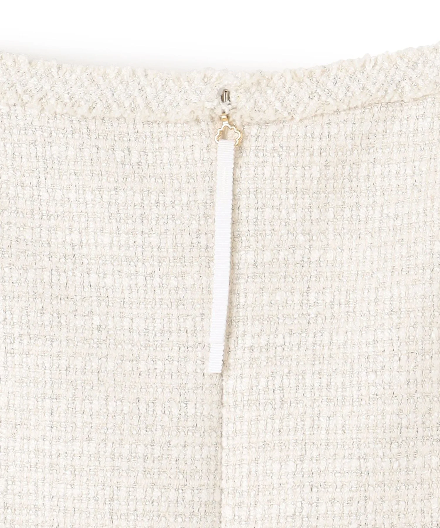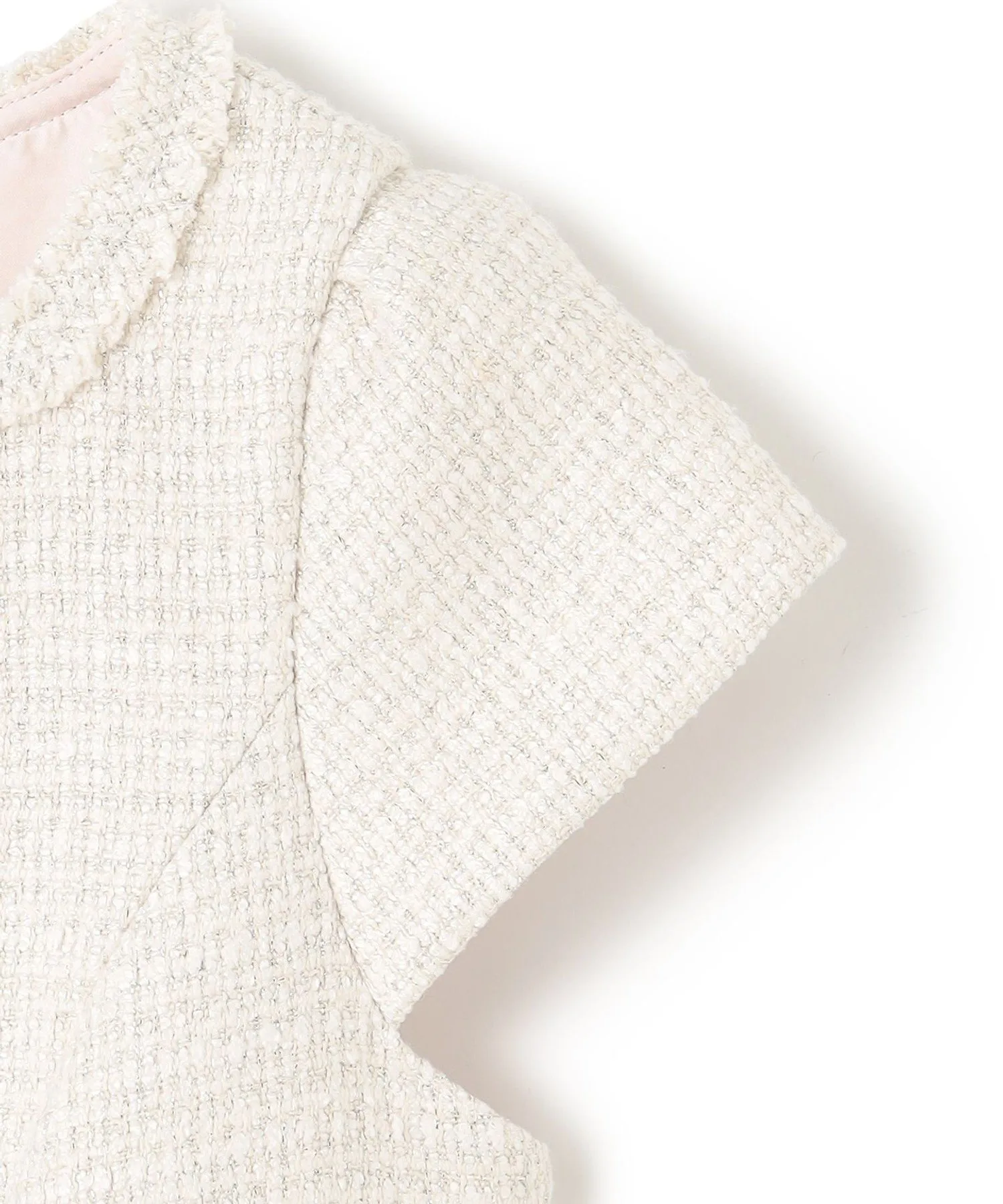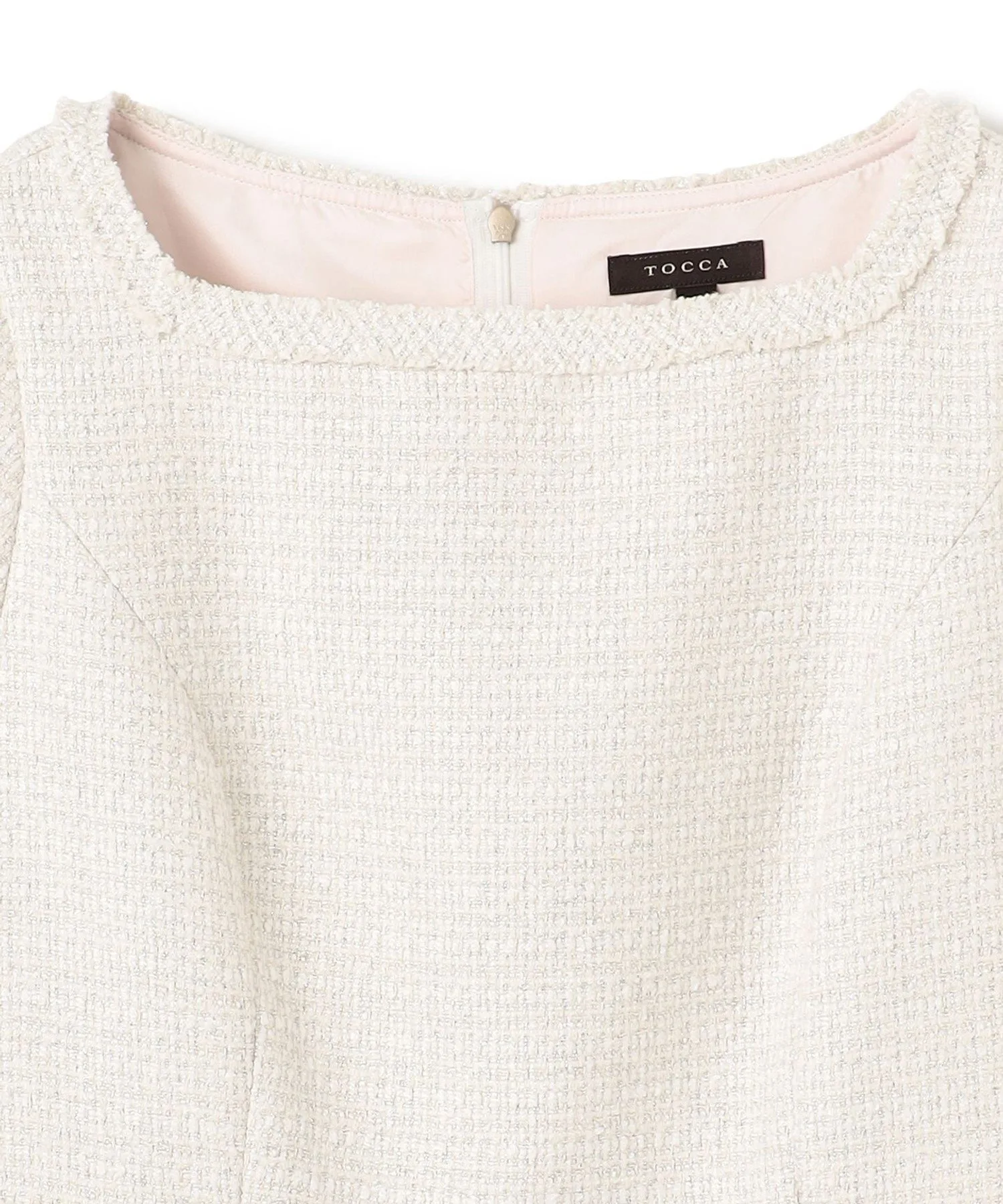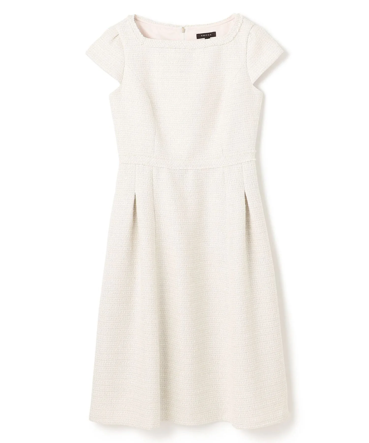 Это платье сшито из элегантного и гламурного твида с едва заметным мерцанием. Неглубокий квадратный вырез подчеркивает декольте, выделяя лицо и создавая мягкий, женственный образ. Кроме того, бахрома на груди, тщательно выполненная вручную из того же материала, добавляет нотку гламура при каждом легком движении. Силуэт умеренно приталенный и расклешенный, но не слишком расширяющийся, создавая нежный и женственный образ, характерный для TOCCA.