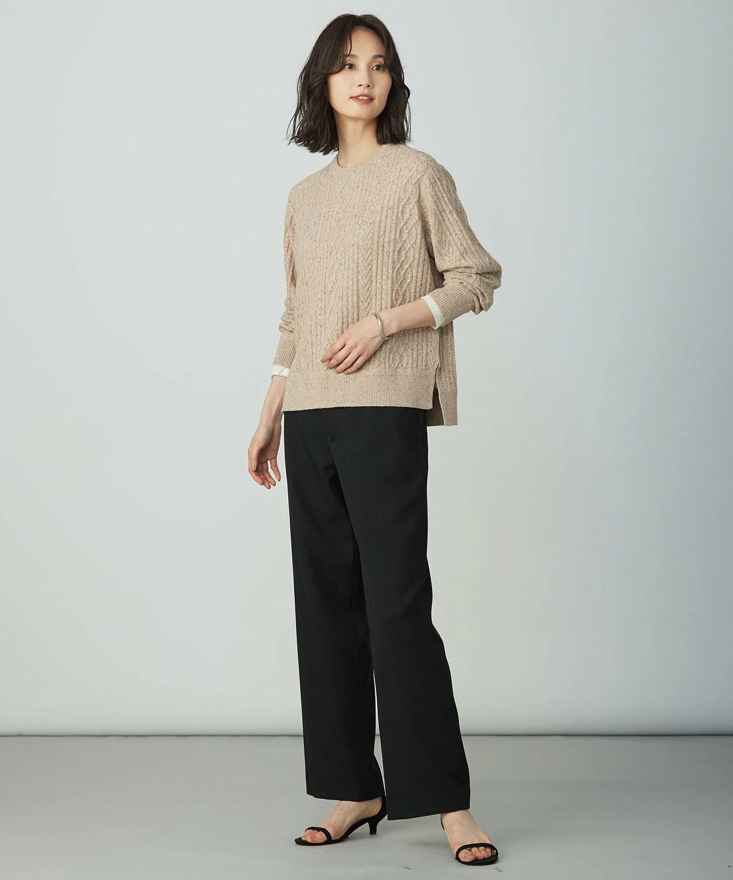 Этот вязаный свитер с круглым вырезом и косами отличается эффектным, смешанным дизайном, идеально подходящим для осени и зимы. Дизайн: Этот свитер с круглым вырезом и косами отличается классическим, но эффектным дизайном. Сохраняя четкий силуэт, трехмерный узор добавляет тепла и элегантности. Он дополняет как традиционные, так и женственные наряды, позволяя создавать разнообразные образы. Доступен в трех цветах: приглушенный светло-серый (#003), натуральный и мягкий бежевый (#033) и изысканный синий (#070). Материал: Эта ткань представляет собой смесь шерсти и шелкового непа, что создает привлекательный смешанный вид. Роскошная текстура шелкового непа дополняет гладкое, нежное прикосновение вискозы, создавая элегантную и комфортную текстуру.