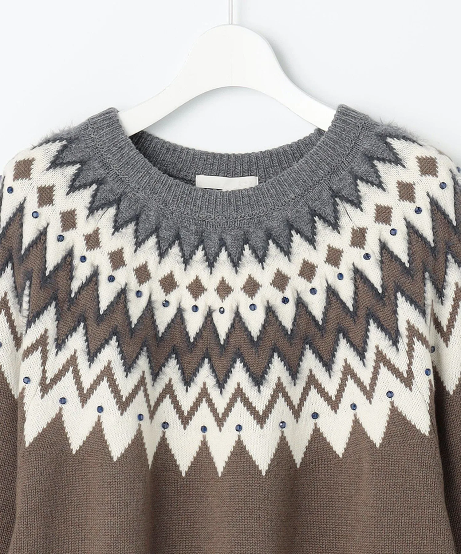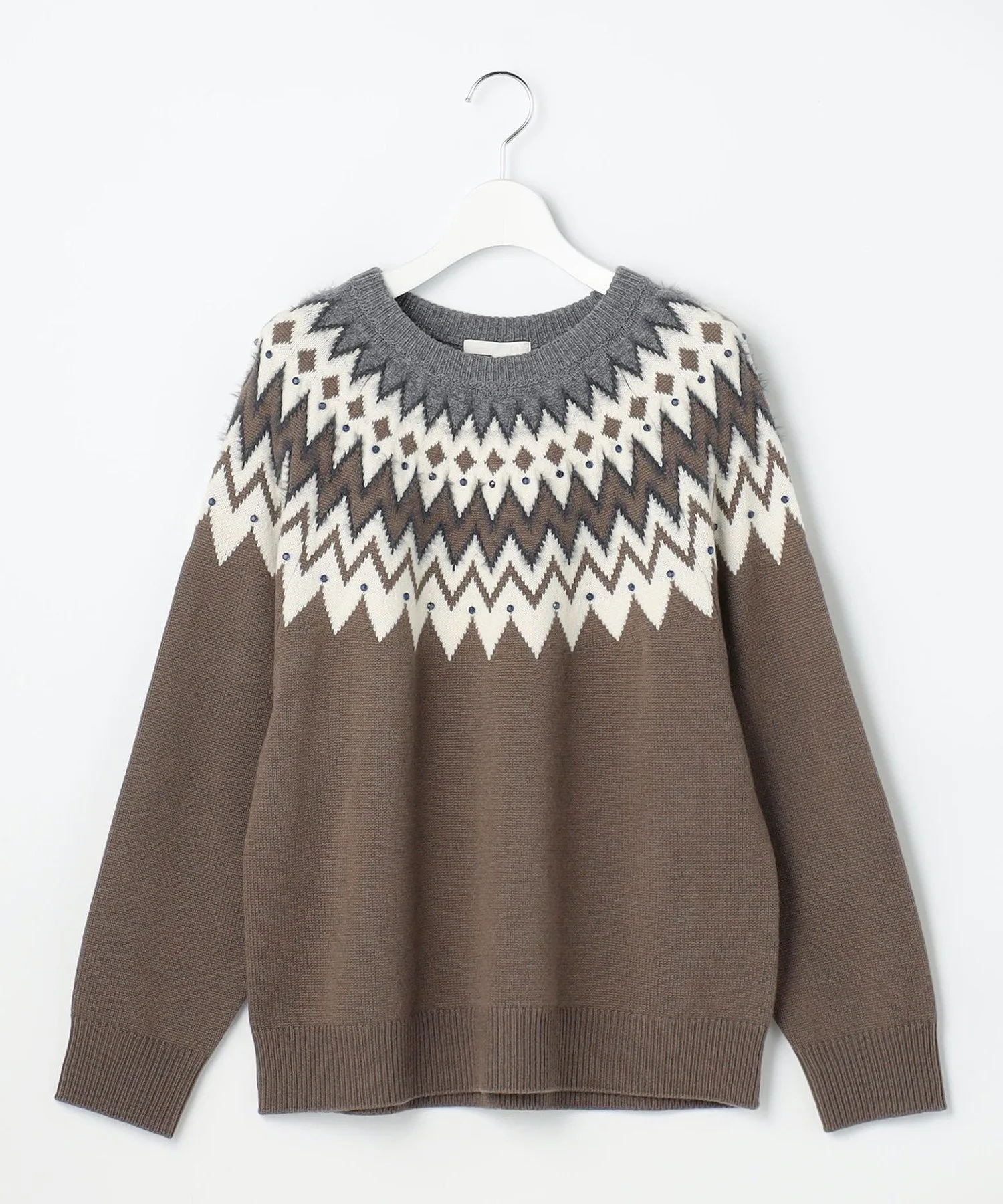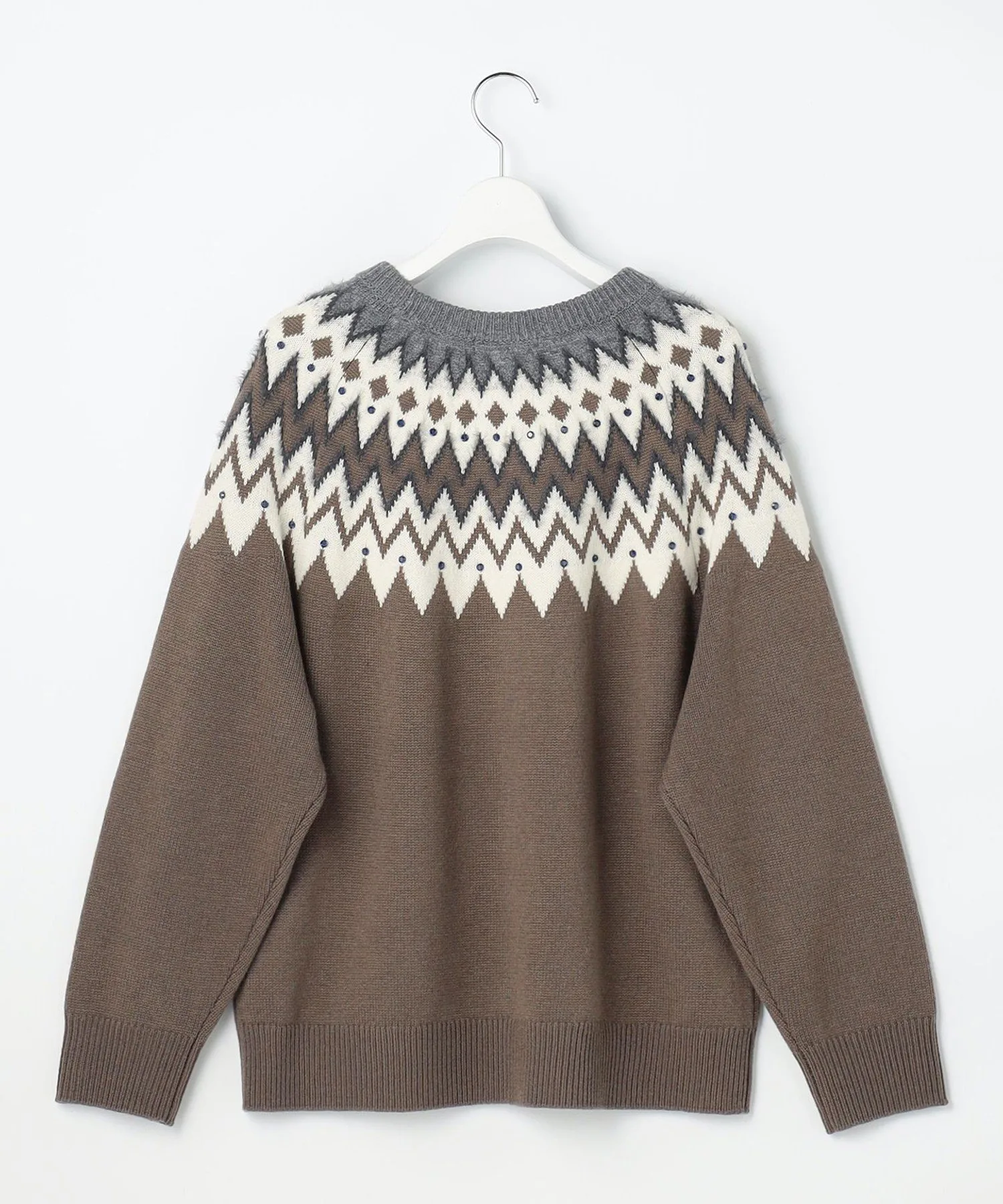 Мягкий и женственный трикотаж в стиле Fair Isle Дизайн Этот трикотаж в стиле Fair Isle сочетает в себе повседневные элементы с утонченным стилем, типичным для Jiyuku. Узор создан путем смешивания ворсистых материалов с различной текстурой, что создает трехмерный эффект. Кроме того, разбросанные стразы добавляют сверкающий, женственный элемент, делая этот трикотаж более изысканным. Материал Изготовлен из тонкой шерсти толщиной 19 микрон или менее, которая спрядена в прочную шерсть с помощью специальной прядильной машины. Сама пряжа пушистая и воздушная, с оптимальной текстурой, сохраняющей мягкость и естественное ощущение шерсти. Этот шерстяной материал воздушный и теплый, поэтому его легко носить даже в середине зимы.