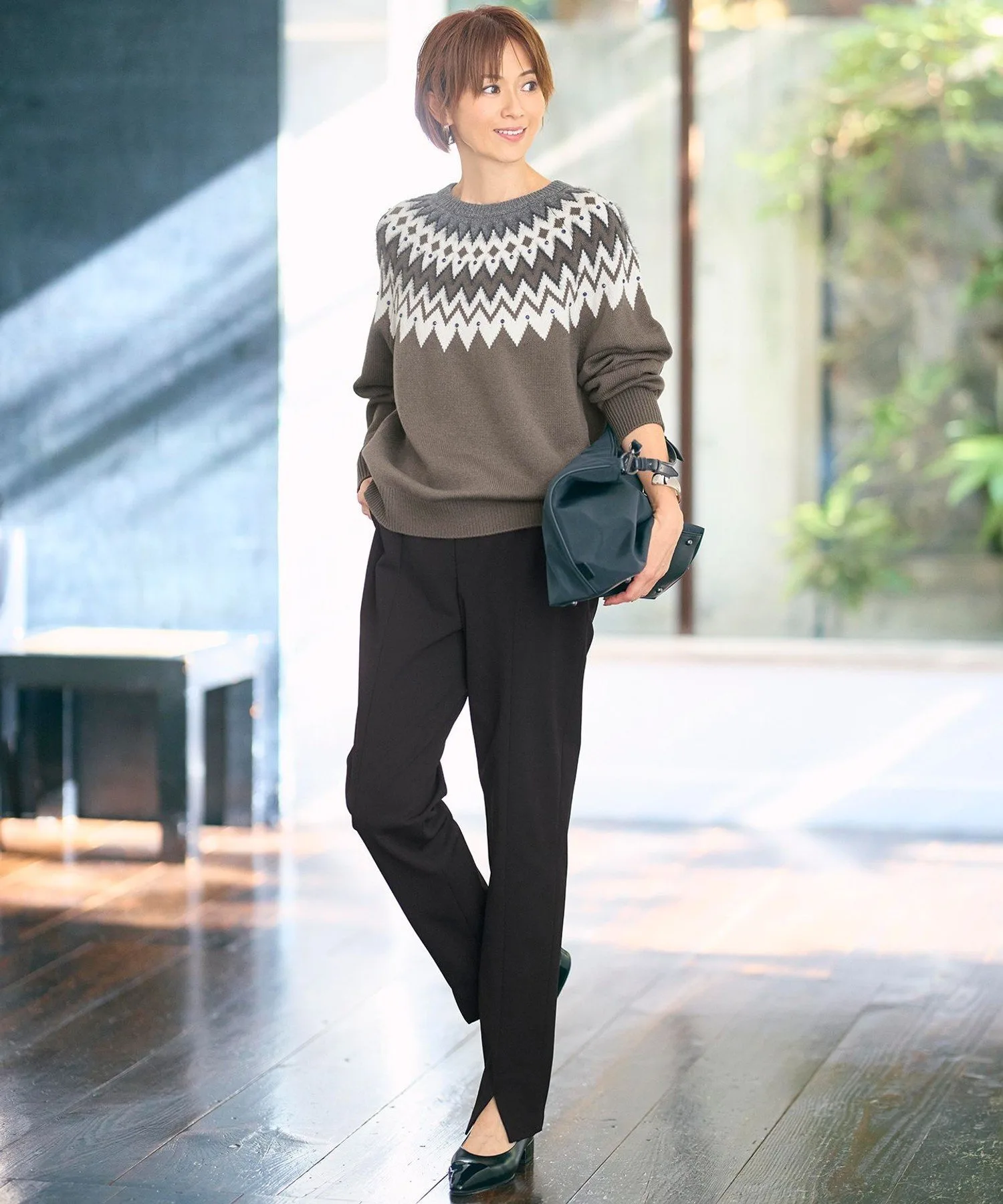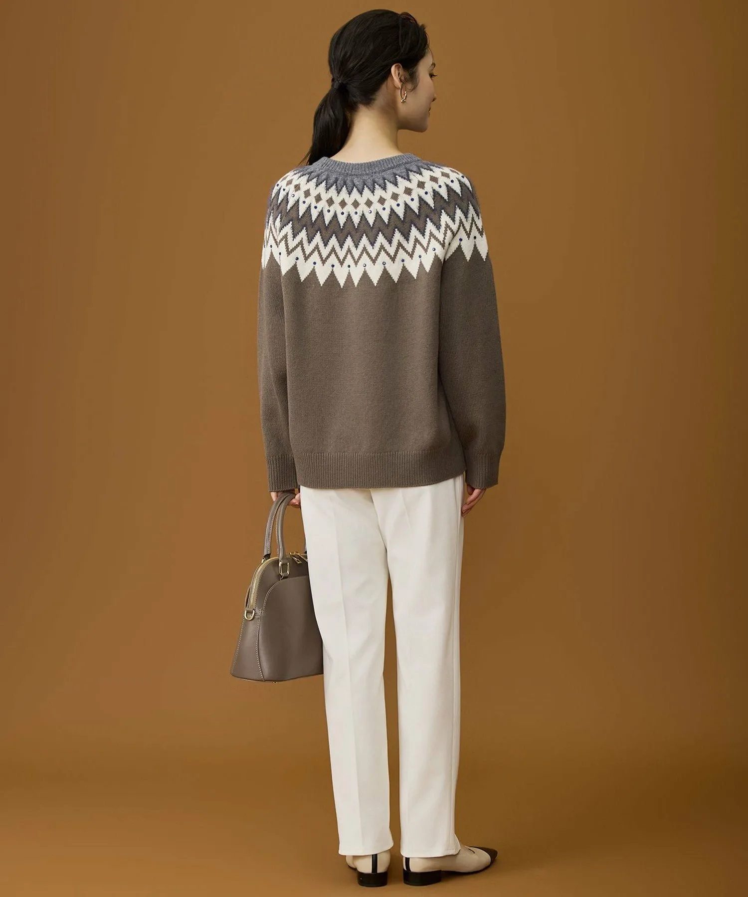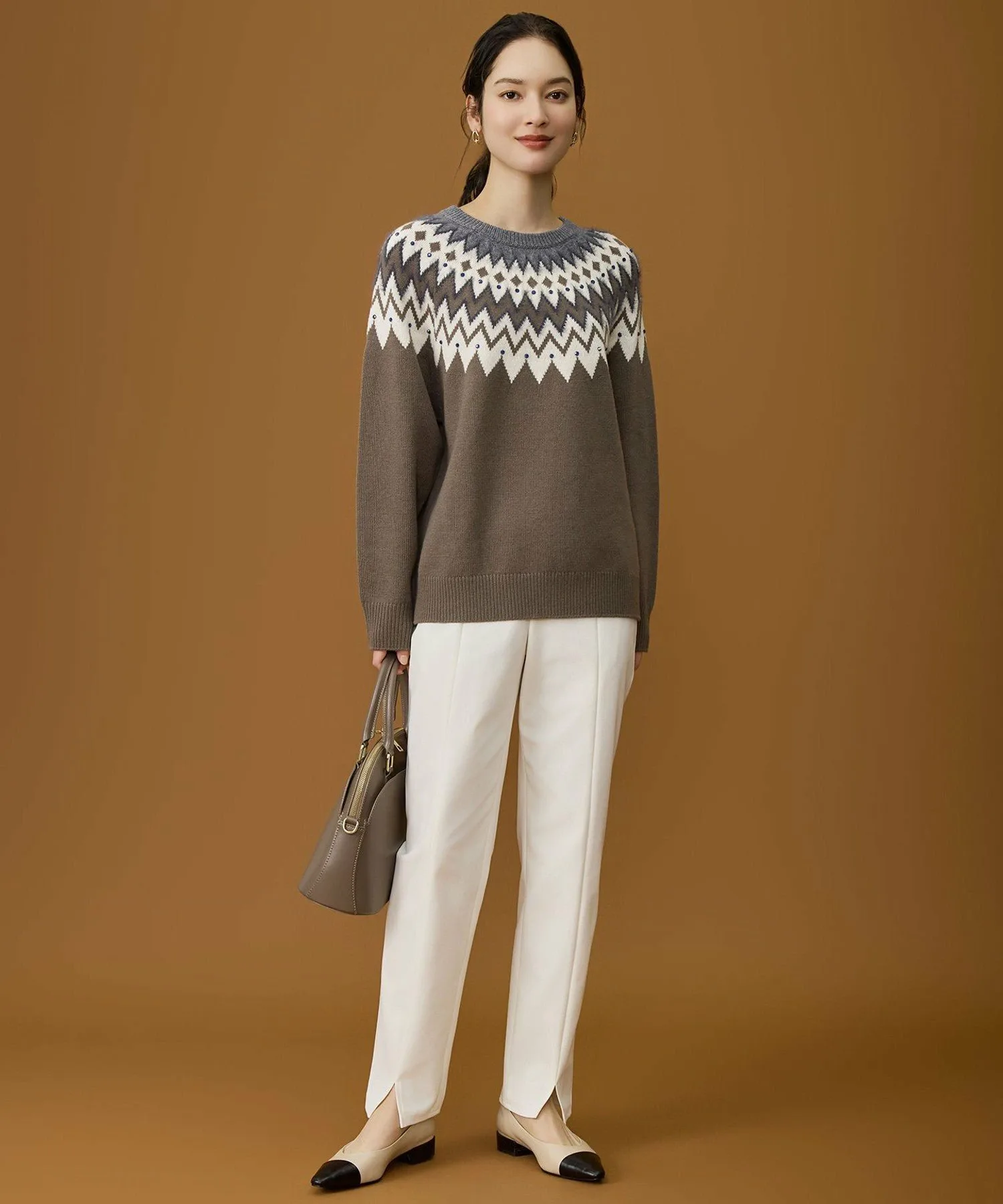 Мягкий и женственный трикотаж в стиле Fair Isle Дизайн Этот трикотаж в стиле Fair Isle сочетает в себе повседневные элементы с утонченным стилем, типичным для Jiyuku. Узор создан путем смешивания ворсистых материалов с различной текстурой, что создает трехмерный эффект. Кроме того, разбросанные стразы добавляют сверкающий, женственный элемент, делая этот трикотаж более изысканным. Материал Изготовлен из тонкой шерсти толщиной 19 микрон или менее, которая спрядена в прочную шерсть с помощью специальной прядильной машины. Сама пряжа пушистая и воздушная, с оптимальной текстурой, сохраняющей мягкость и естественное ощущение шерсти. Этот шерстяной материал воздушный и теплый, поэтому его легко носить даже в середине зимы.