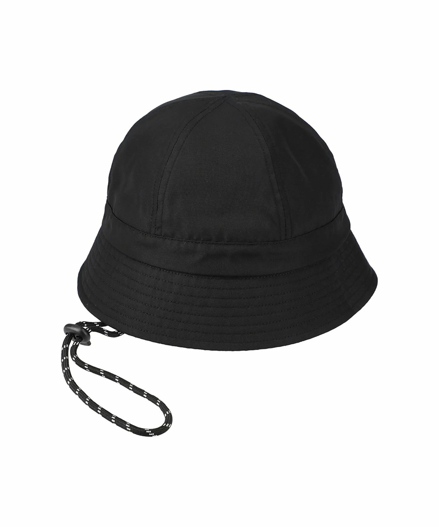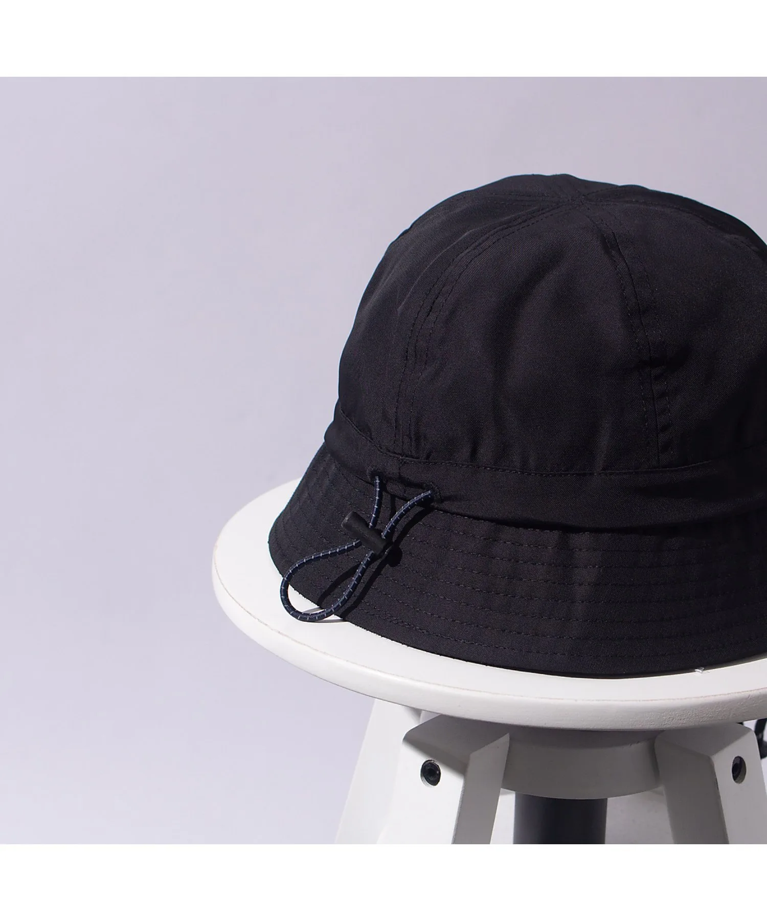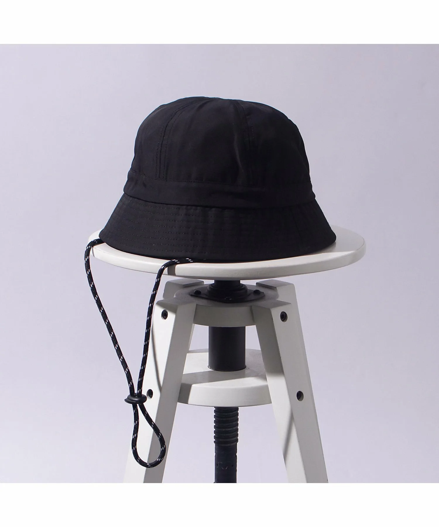 Шляпа с простым силуэтом и изящным ремешком под подбородком из веревки.