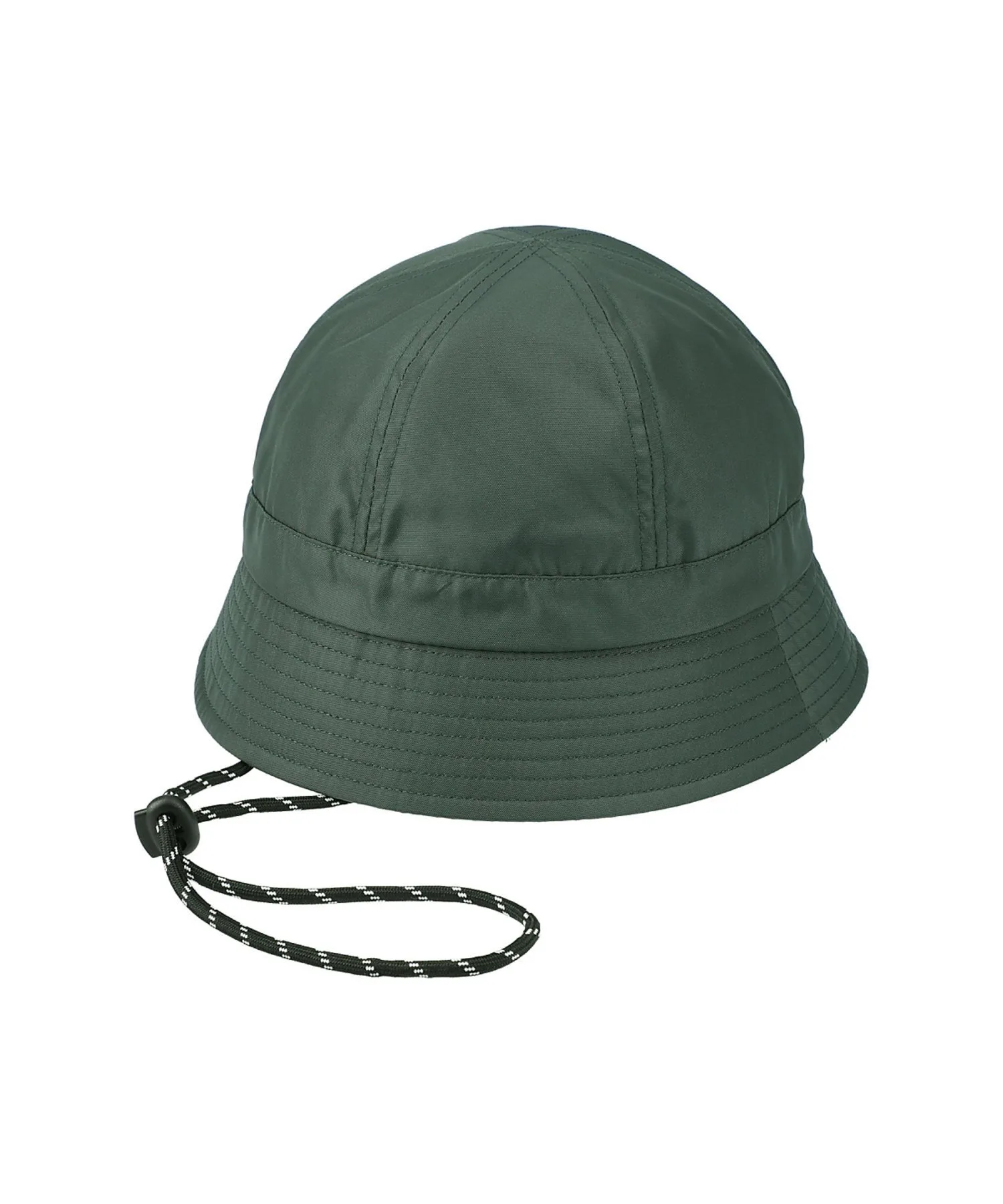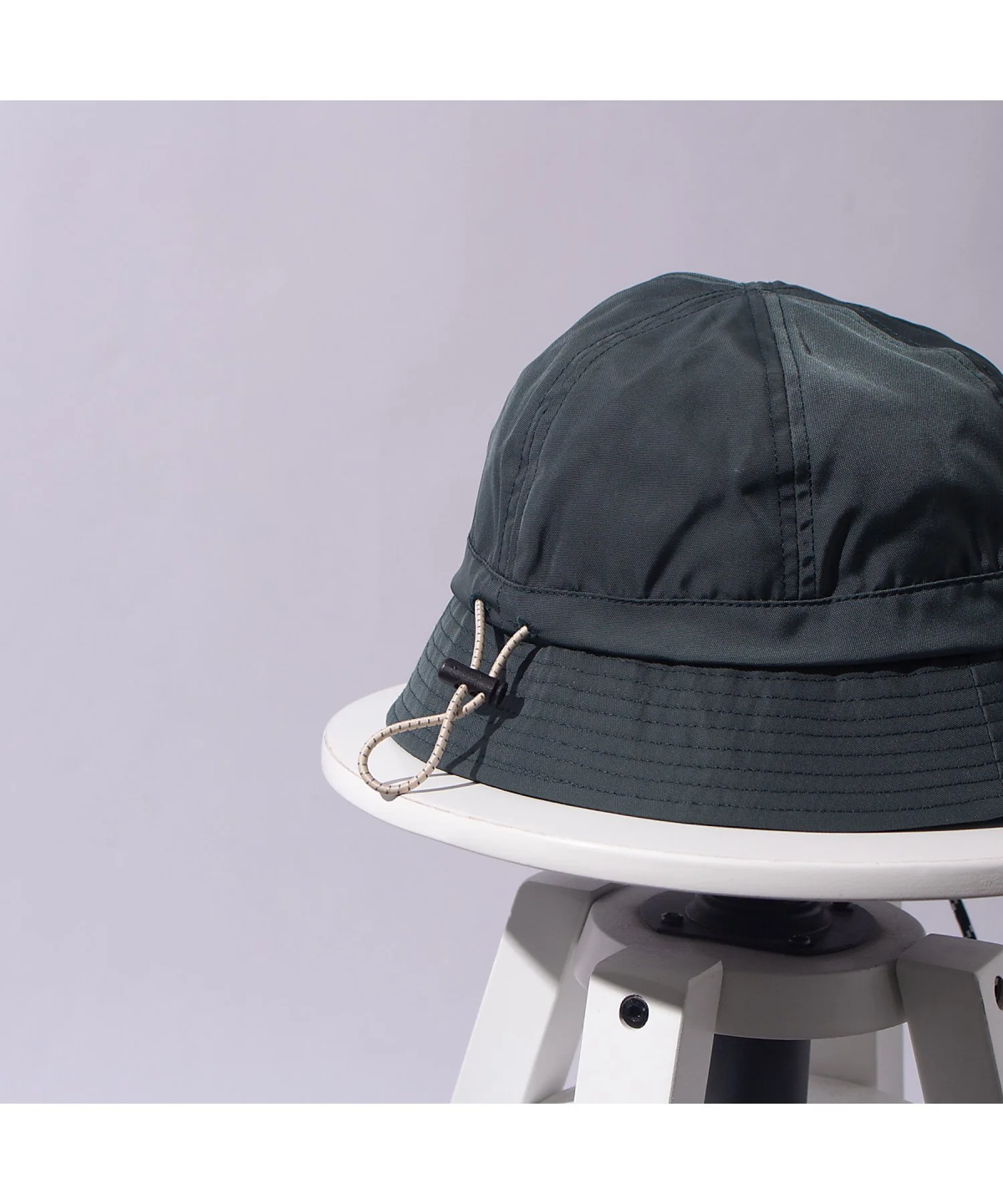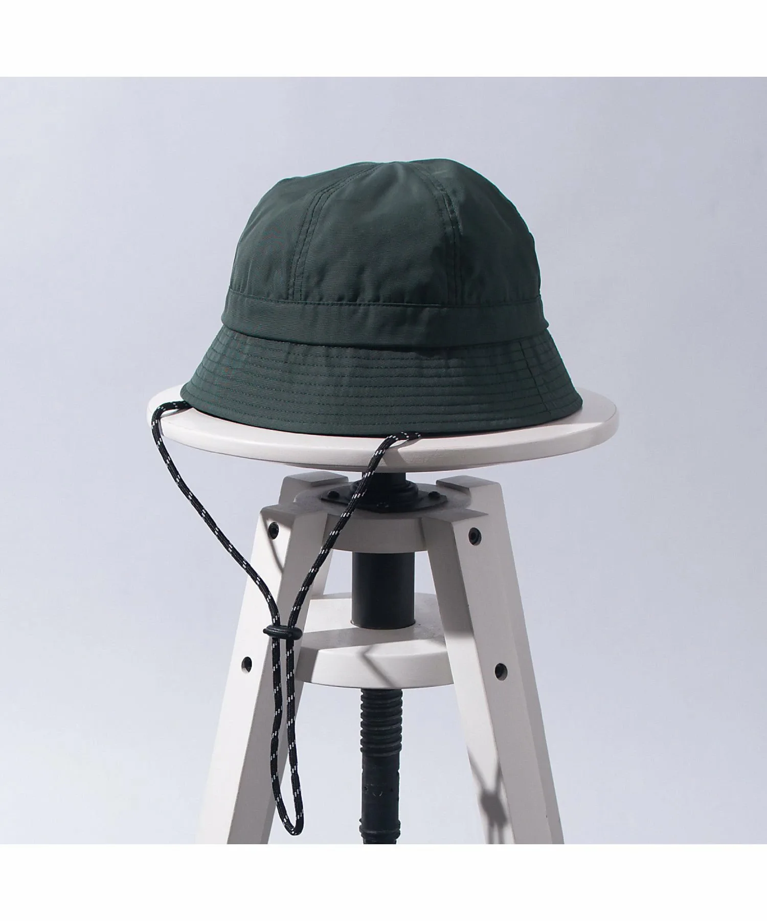 Шляпа с простым силуэтом и изящным ремешком под подбородком из веревки.