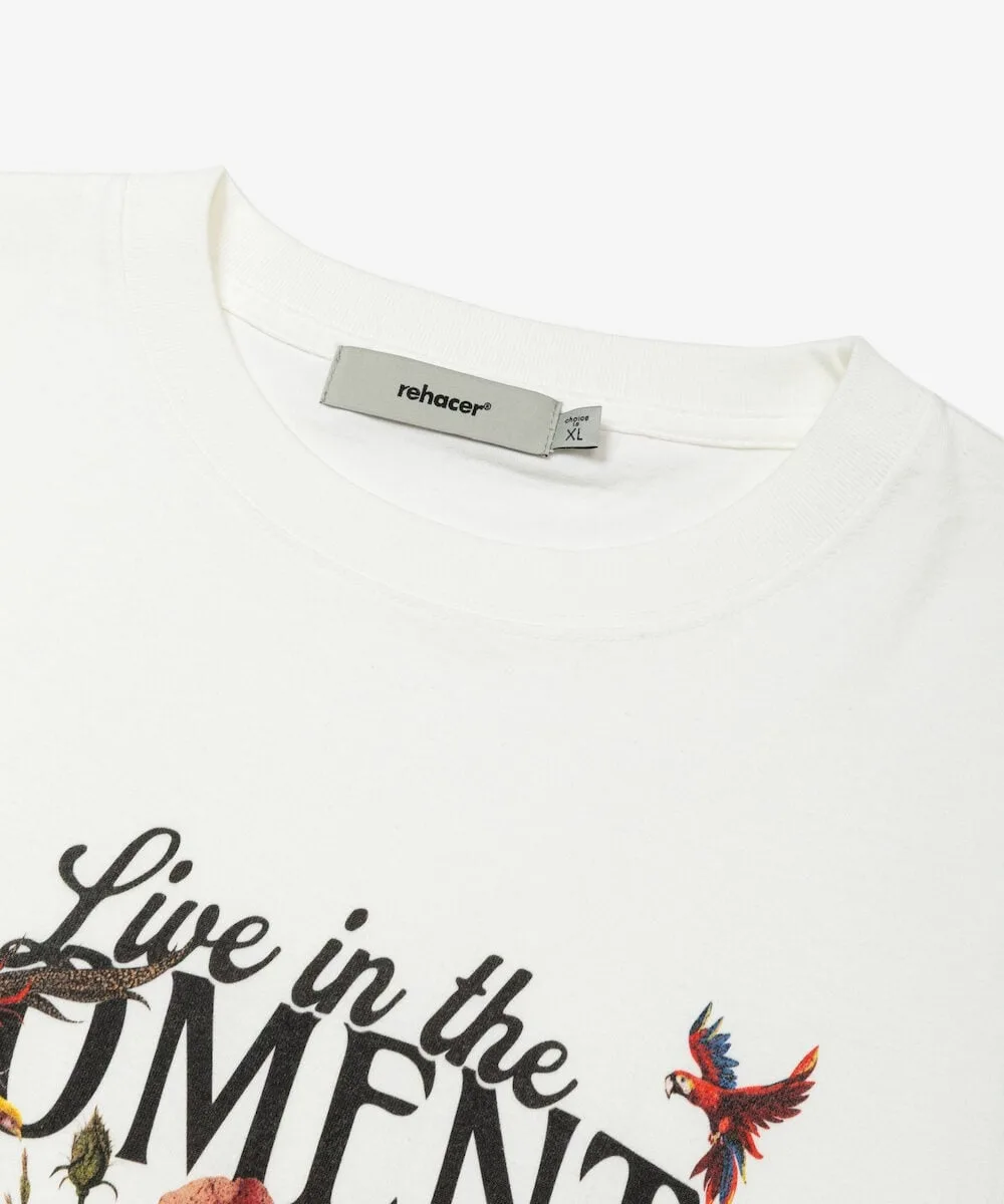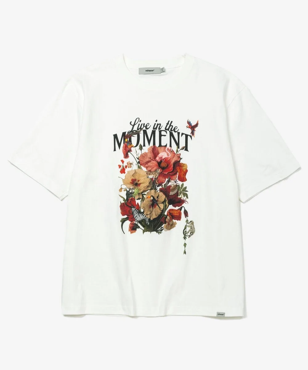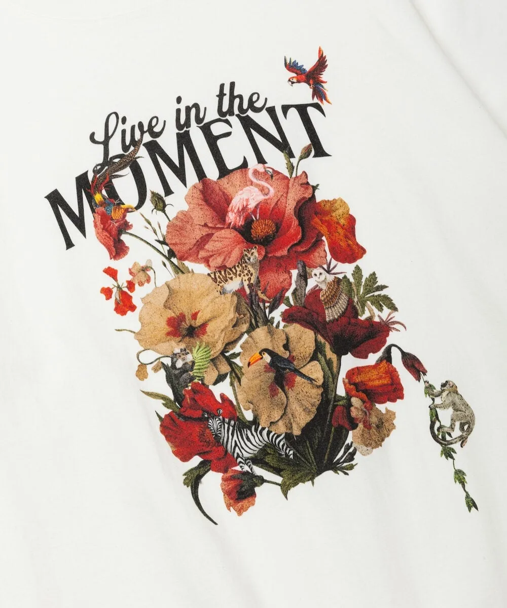 На передней части нанесена струйная печать с мечтательным дизайном, сочетающим яркие цветочные мотивы с животными и птицами, а также надпись «Живи настоящим моментом».