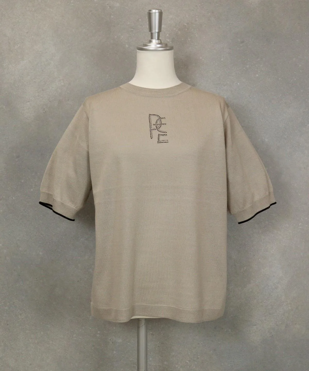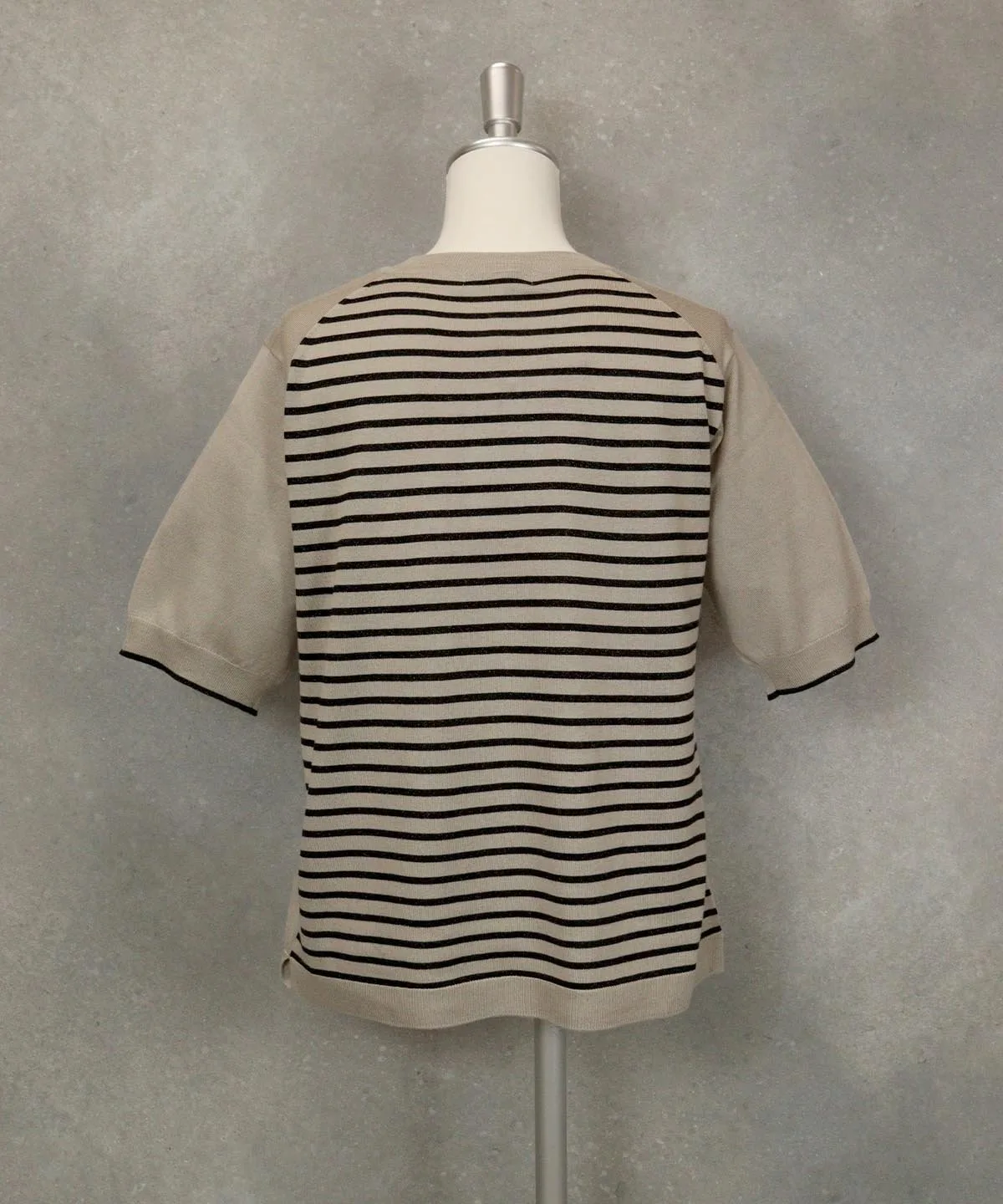 Вязаный пуловер с короткими рукавами из шелковой смеси. Тонкий и гладкий на ощупь. Однотонная передняя часть, полосатая задняя. Полосатая задняя часть имеет блестящую поверхность. Элегантный логотип в виде камня в центре передней части.