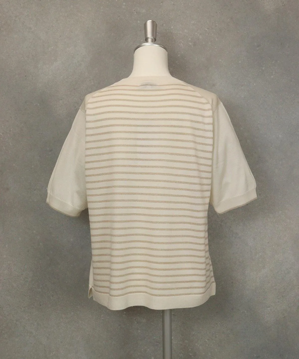 Вязаный пуловер с короткими рукавами из шелковой смеси. Тонкий и гладкий на ощупь. Однотонная передняя часть, полосатая задняя. Полосатая задняя часть имеет блестящую поверхность. Элегантный логотип в виде камня в центре передней части.