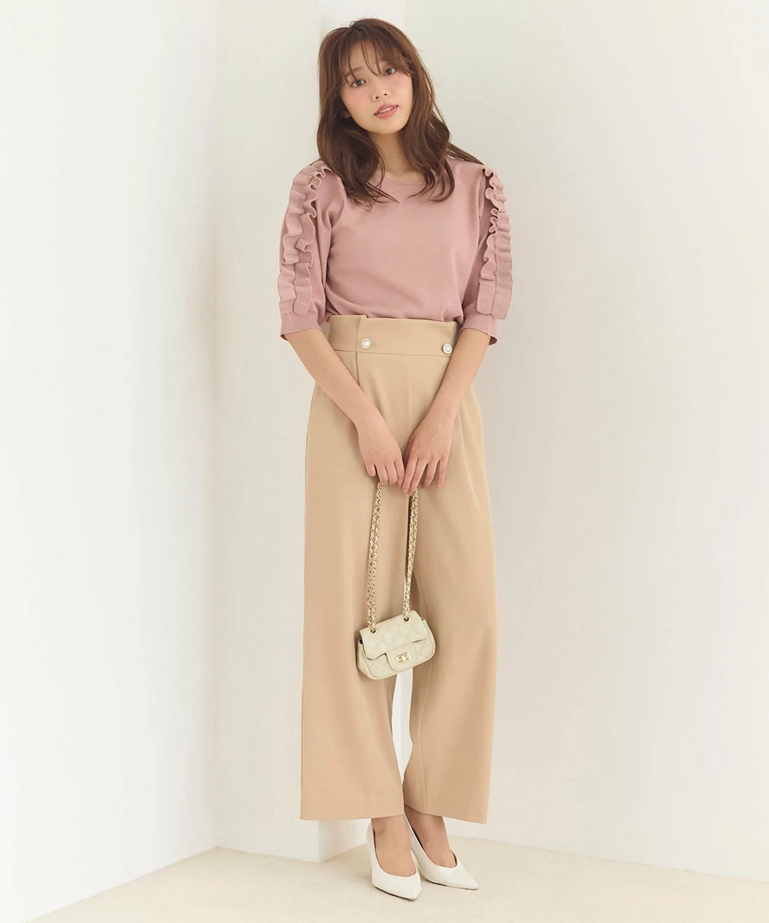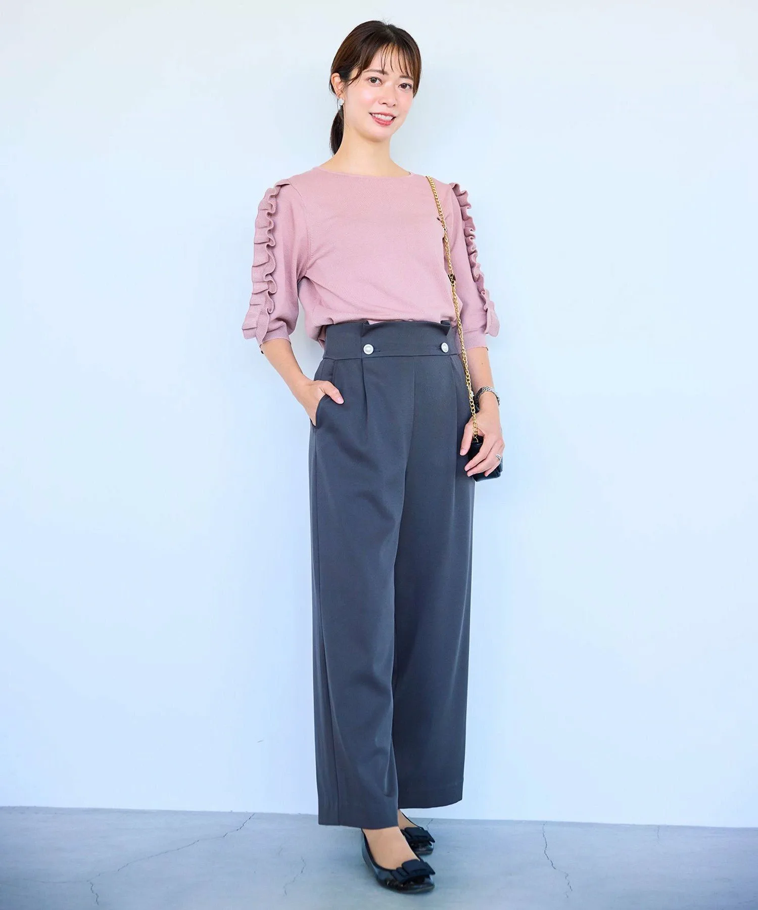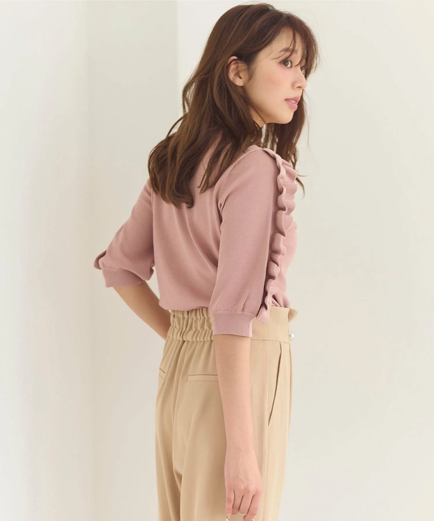 Милый вязаный топ с эффектными оборками на рукавах. Доступен в широком диапазоне сдержанных цветов, включая нежный серо-бежевый, насыщенный розовый и черный, который смягчает сладость. Свободный крой делает его удобным в ношении и хорошо сочетается как с юбками, так и с брюками. Это очень рекомендуемый дизайн вязаного топа, который легко может наскучить.
