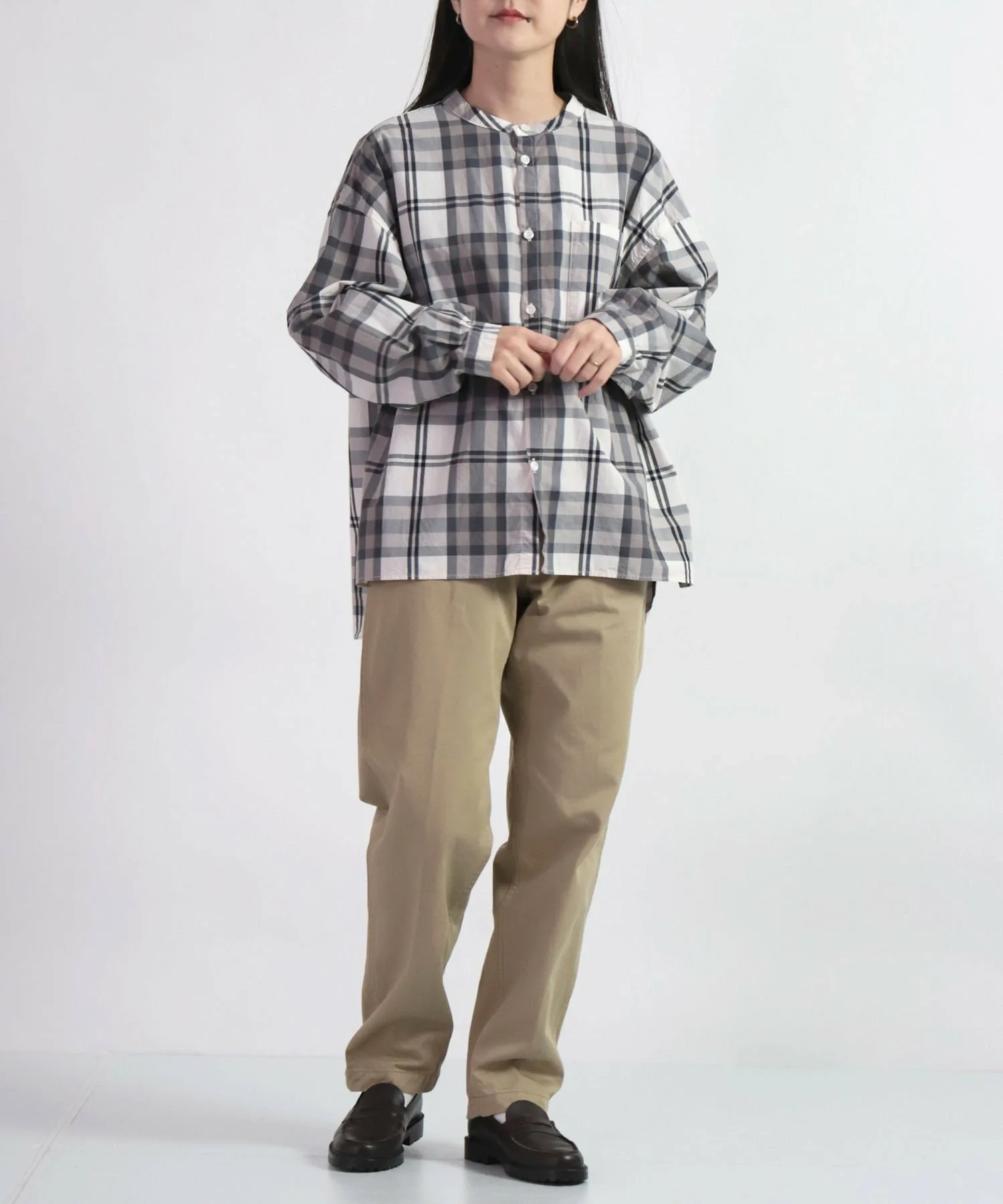 Модель 1: Рост 157 см / Размер SS (Темно-синий: рубашка цвета слоновой кости с высоким воротником, Бежевый: клетчатая рубашка)Модель 2: Рост 160 см / Размер M (Темно-синий: полосатая рубашка, Бежевый: серая толстовка)