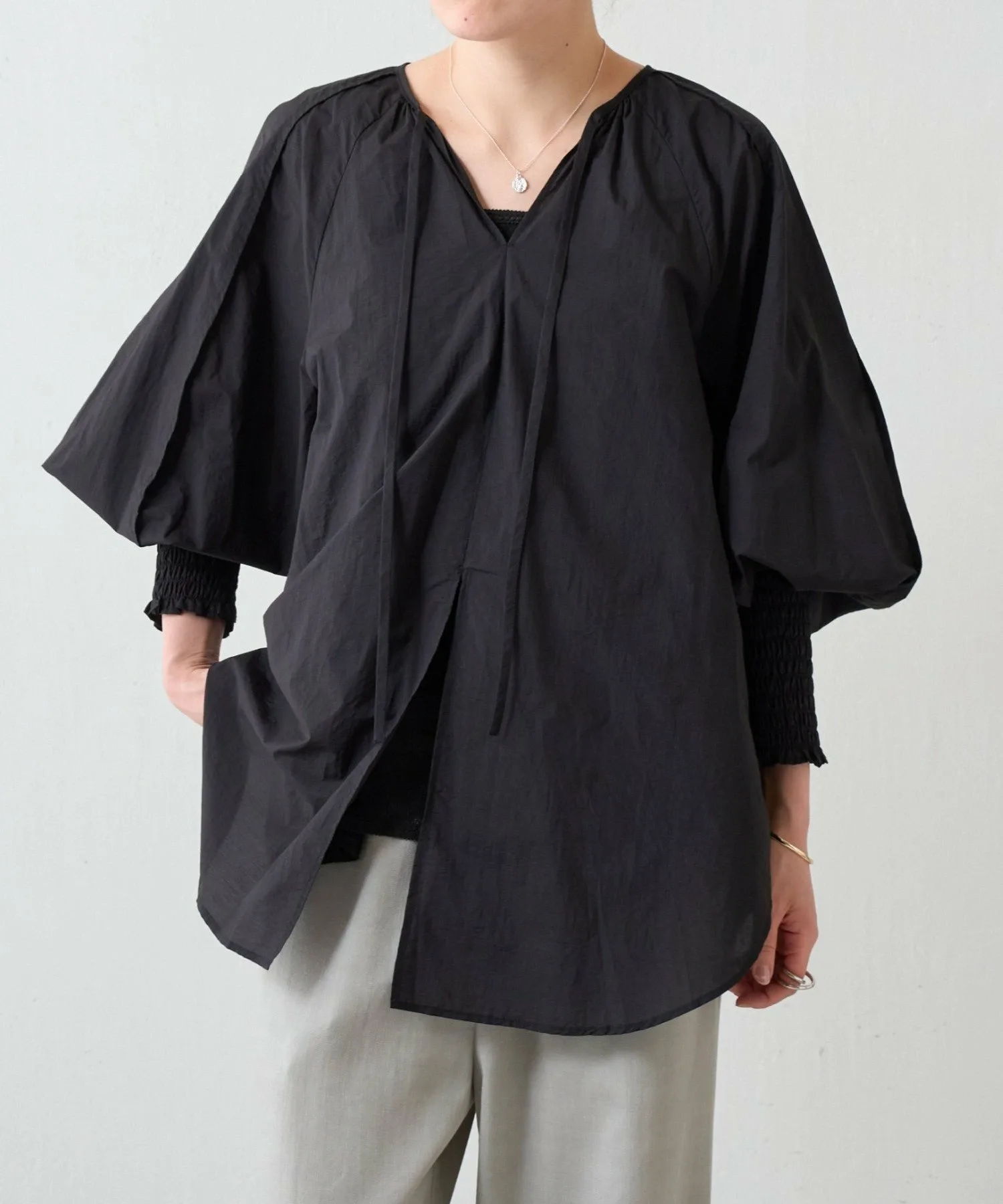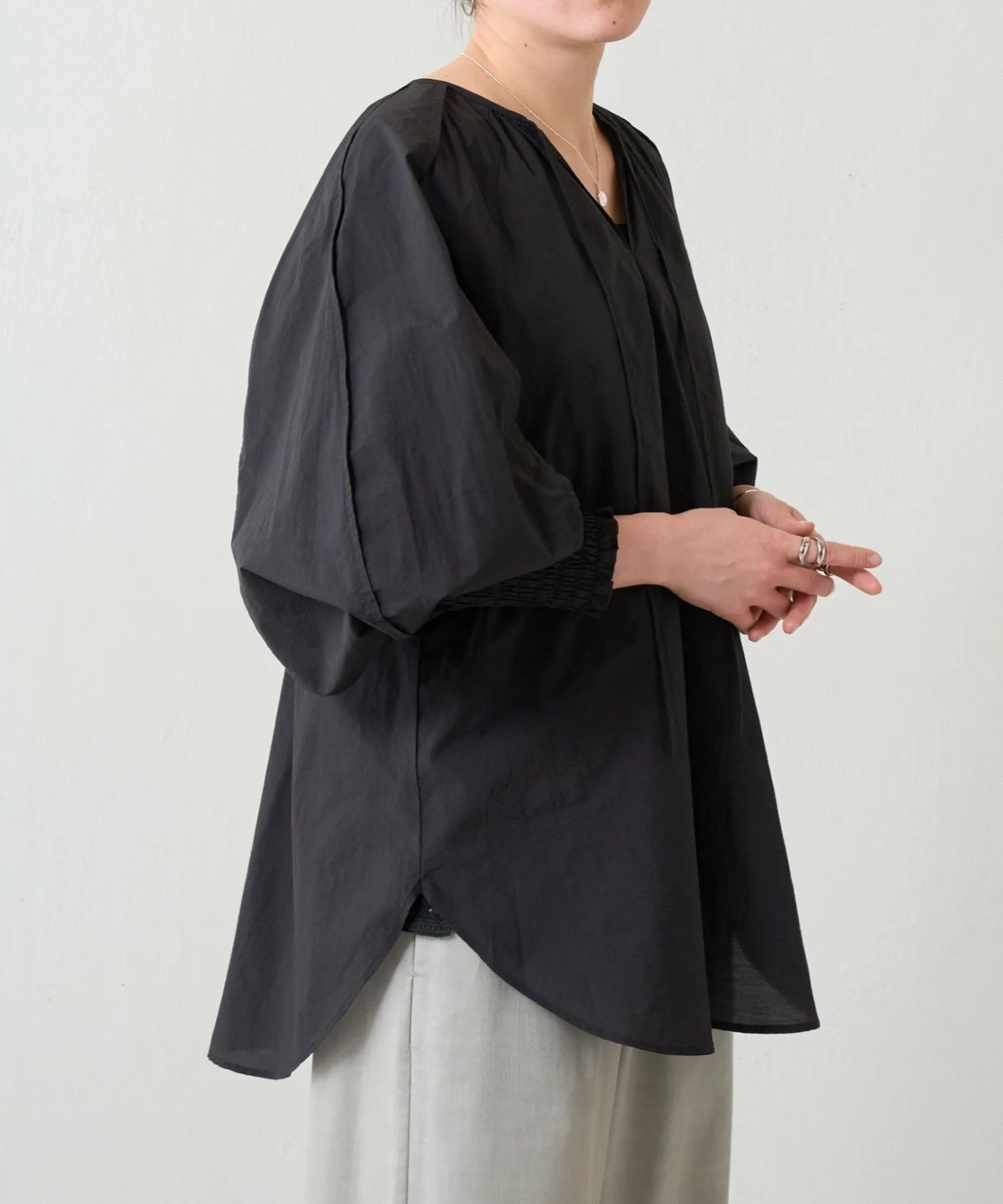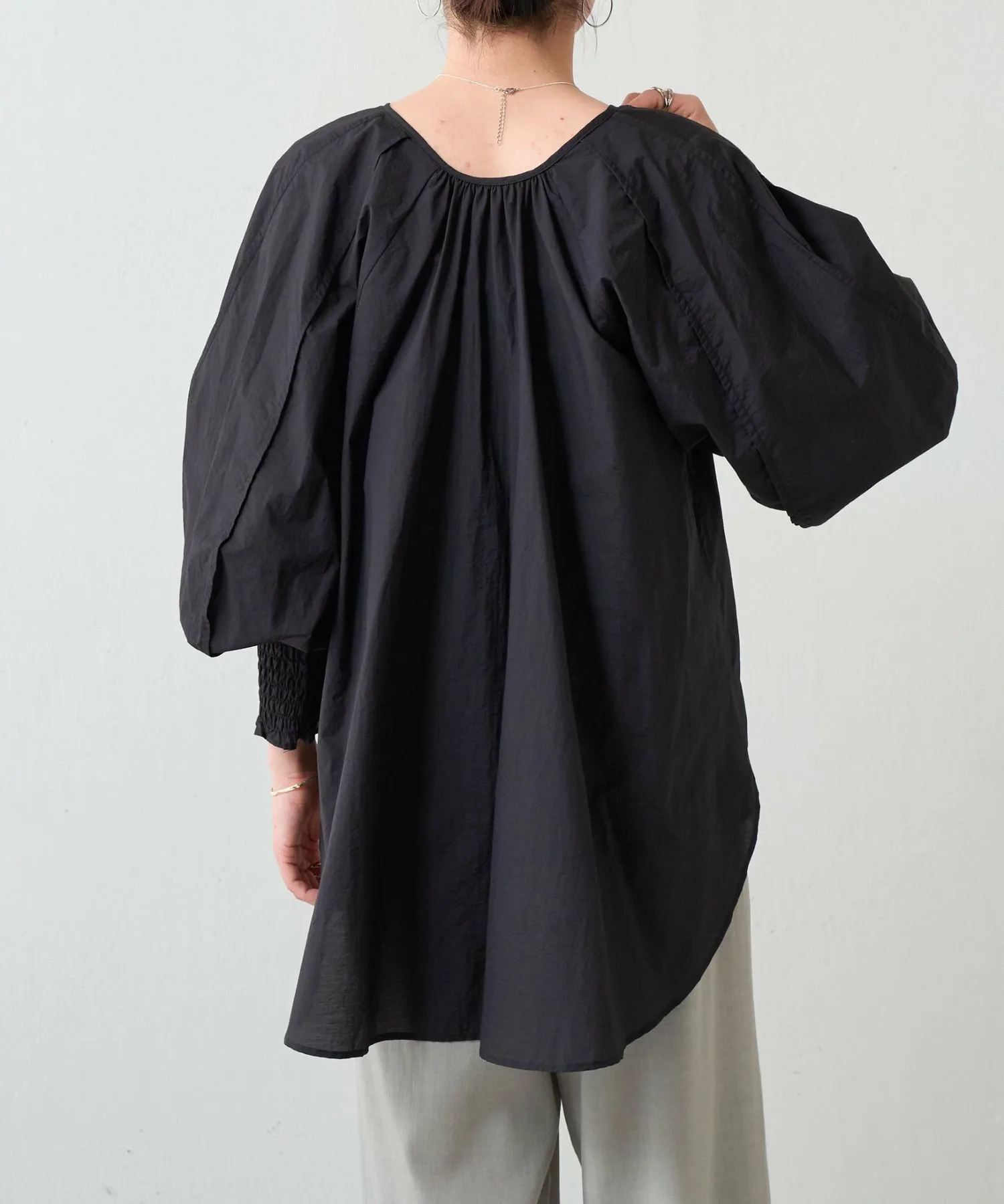 Присборенные манжеты и мягкие, объемные рукава-летучая мышь создают простой, но в то же время непринужденно выразительный дизайн.