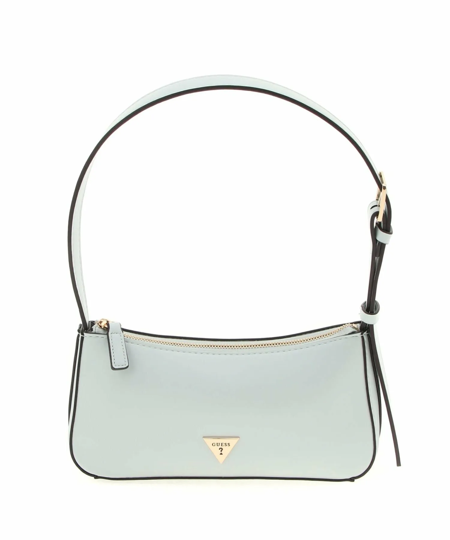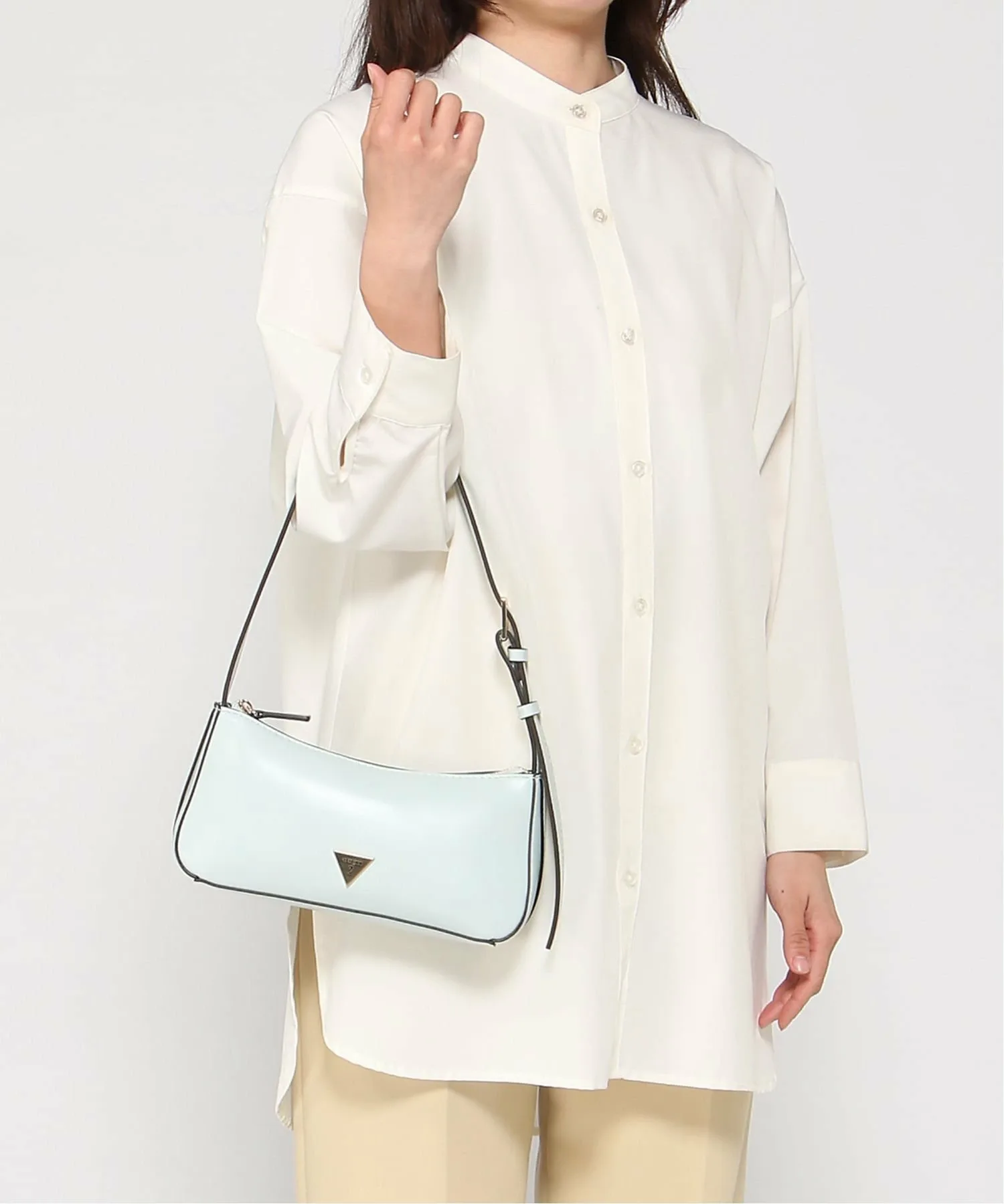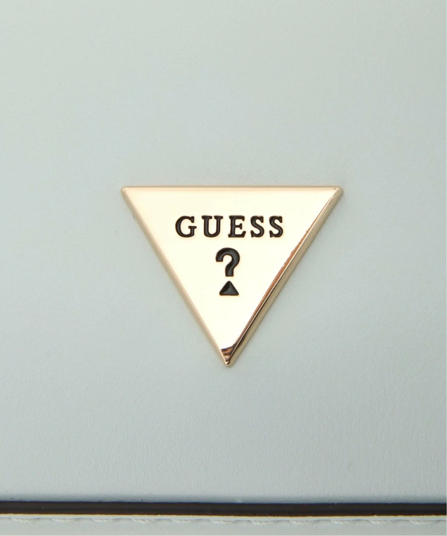 Милая мини-сумочка через плечо нежных пастельных тонов, украшенная золотым треугольным логотипом.