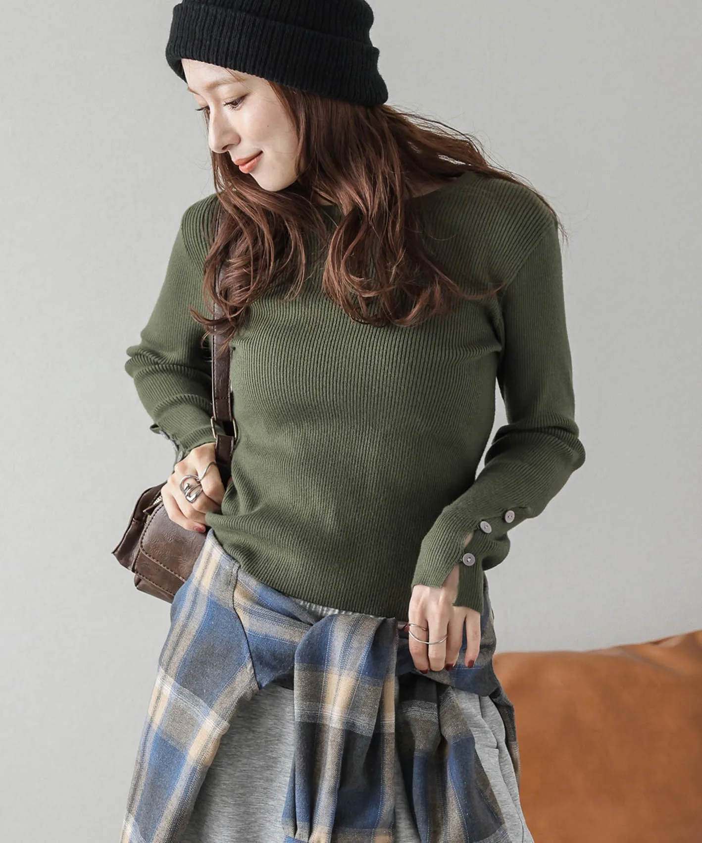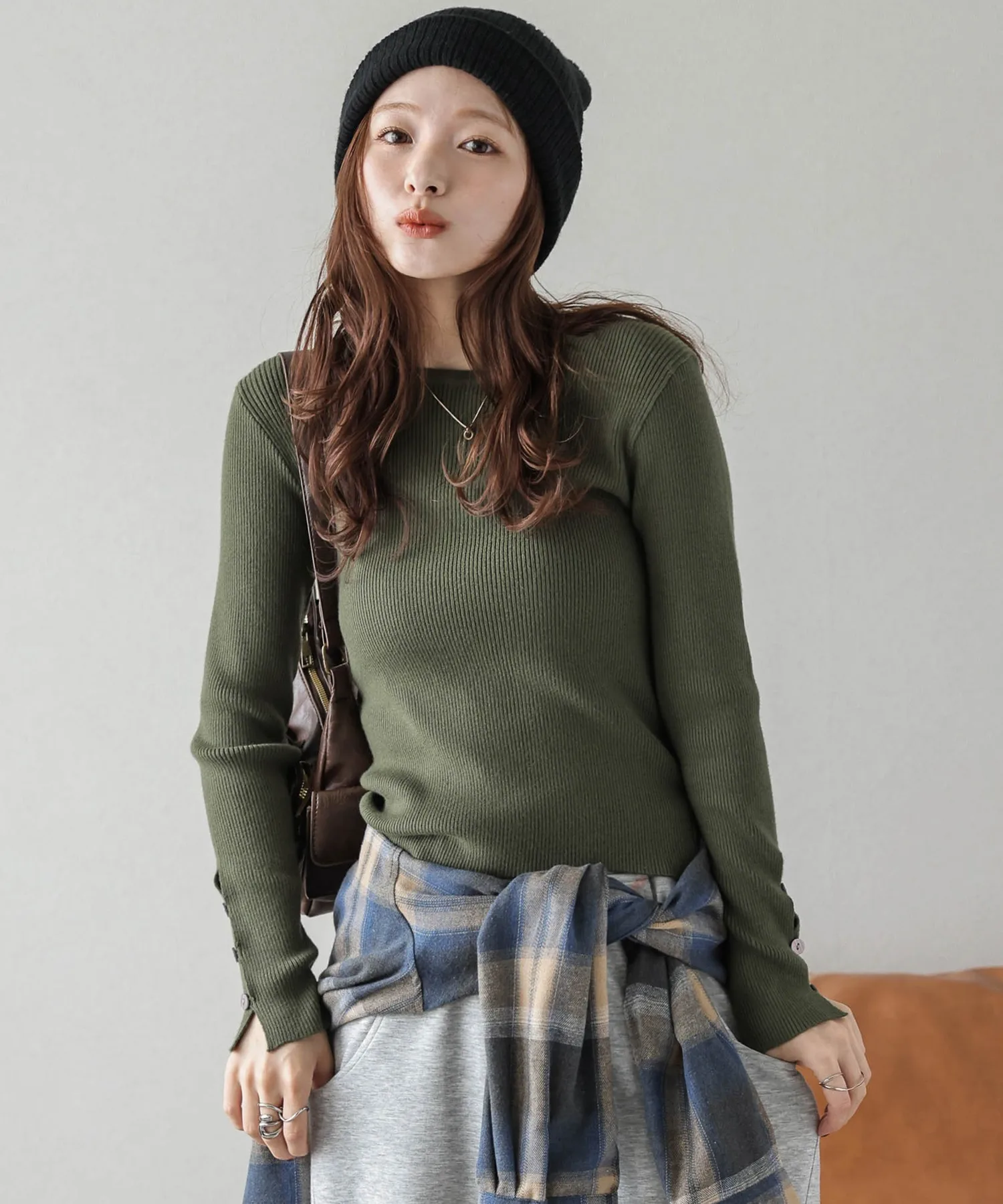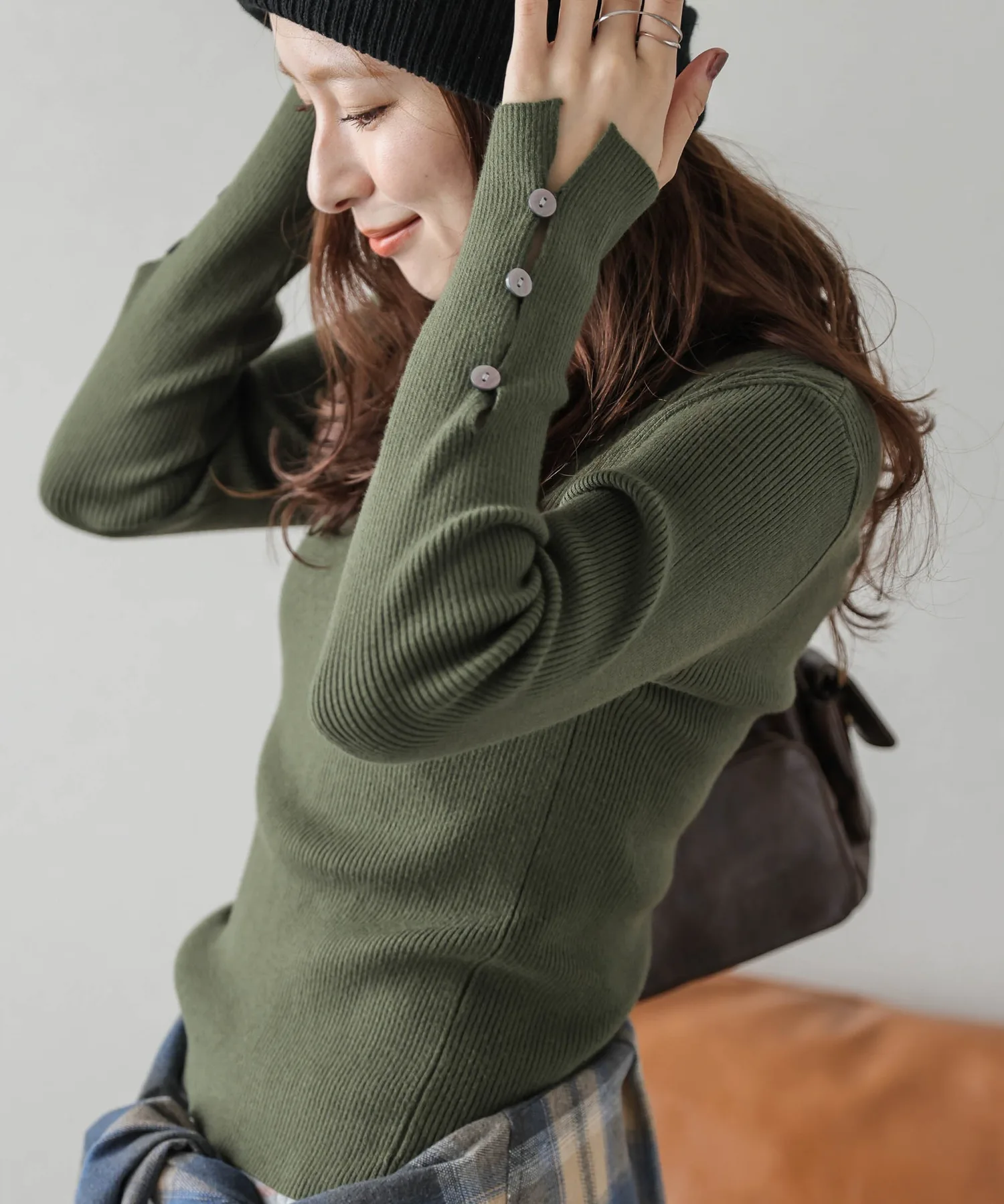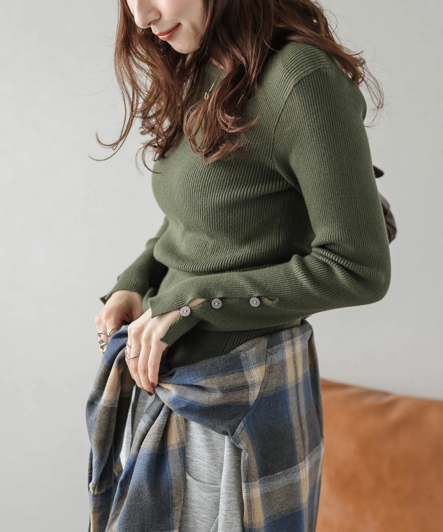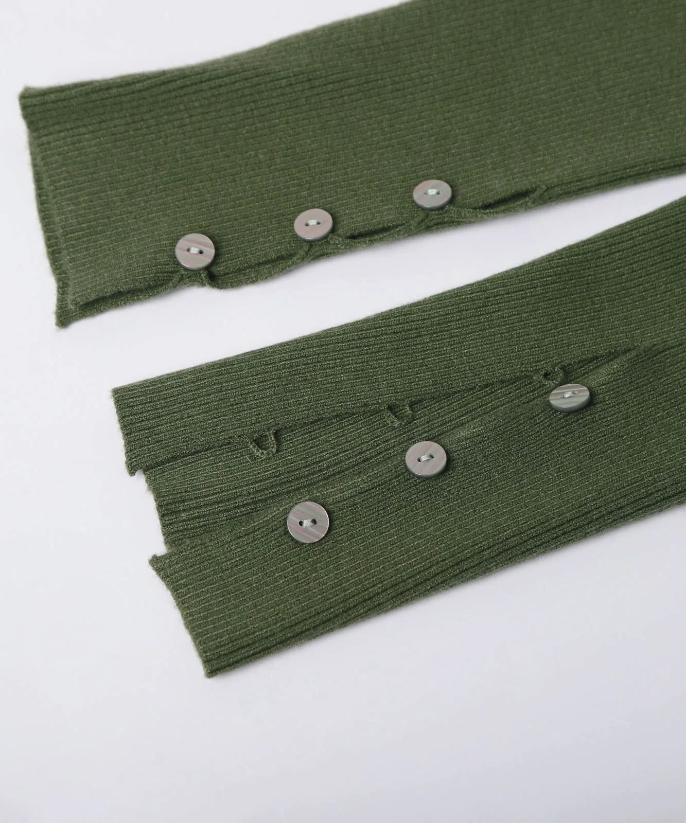 Мы добавили пуговицы на манжеты этого простого, однотонного ребристого трикотажа с круглым вырезом