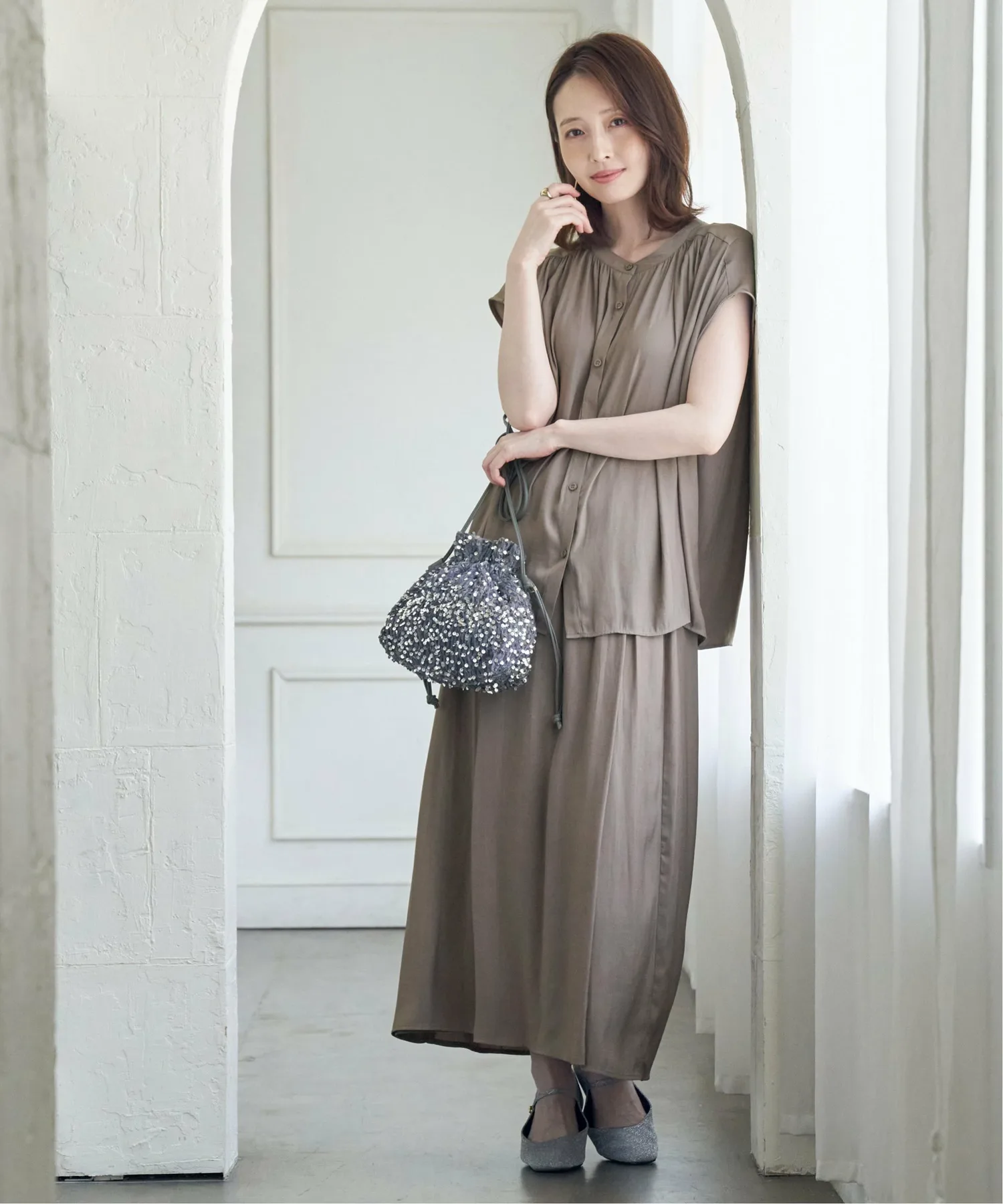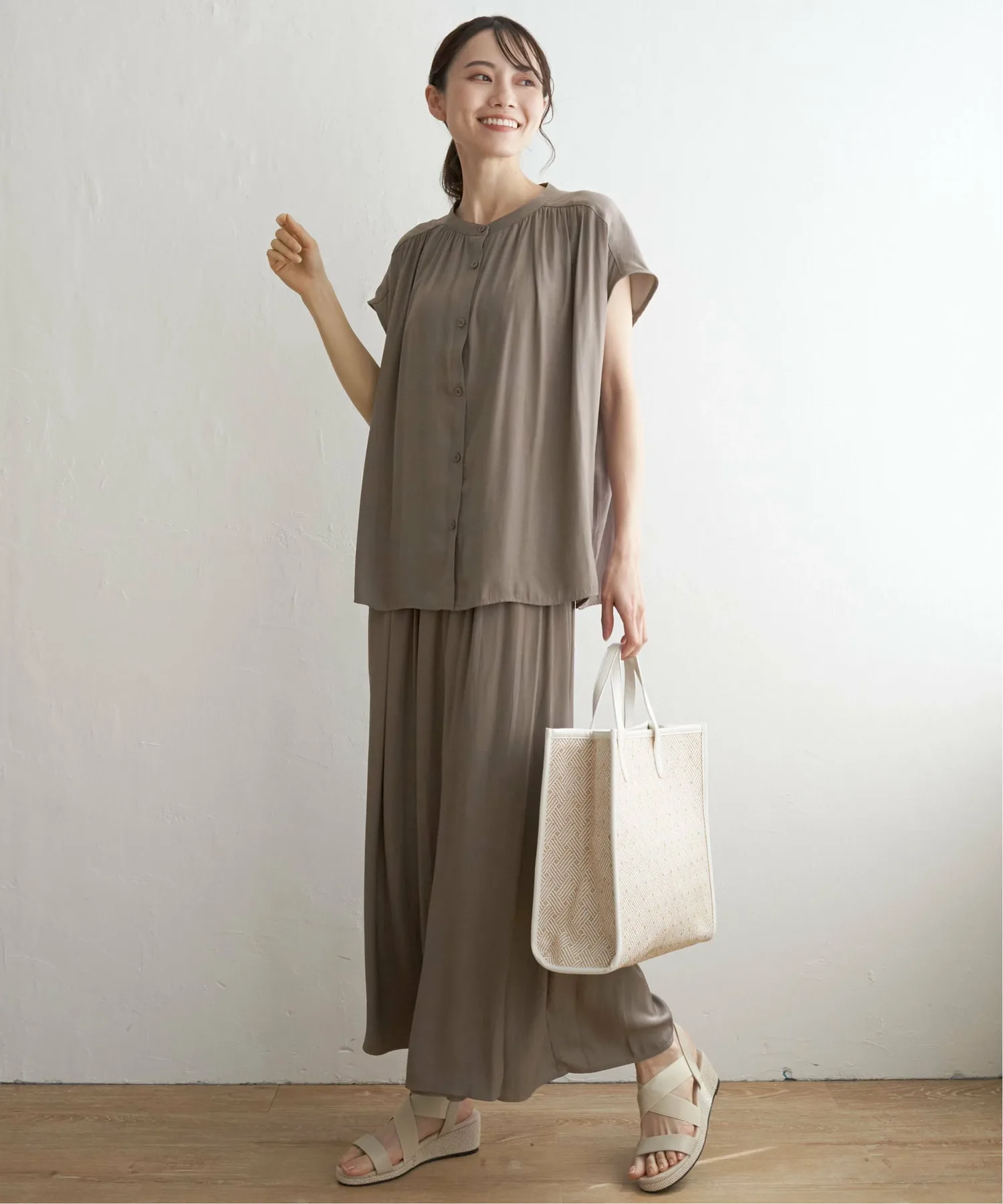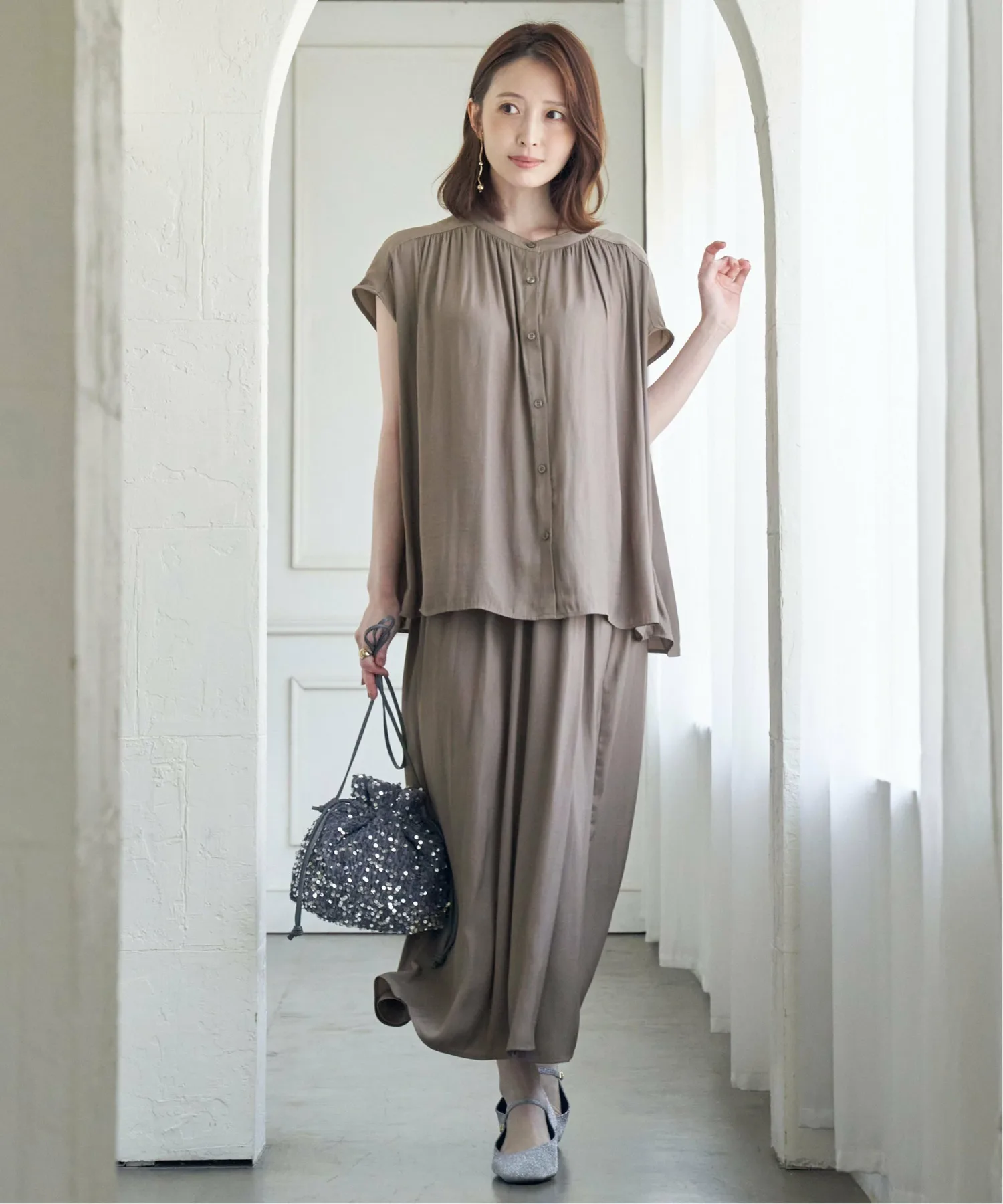 Эти юбки-шорты имеют мягкую, струящуюся текстуру, которая максимально подчеркивает драпировку материала. Их можно носить в комплекте с рубашкой, продающейся отдельно. [Материал] Изготовлены из мягкого, струящегося и элегантно текстурированного материала из расщепленных волокон с умеренным блеском. Они обладают очень драпирующейся текстурой и приятным ощущением. [Дизайн] Эти юбки-шорты выглядят как юбка-обертка спереди и широкие брюки сзади. [Стиль Ikka Point] Эти юбки-шорты имеют обильные сборки, которые позволяют им колыхаться при каждом движении, создавая красивый силуэт. Эластичная резинка делает их удобными в ношении, а спереди они напоминают юбку, что позволяет создать более повседневный образ. [Рекомендуемое сочетание] Также доступна рубашка из того же материала, продающаяся отдельно, что делает их рекомендуемым выбором для более элегантного комплекта.