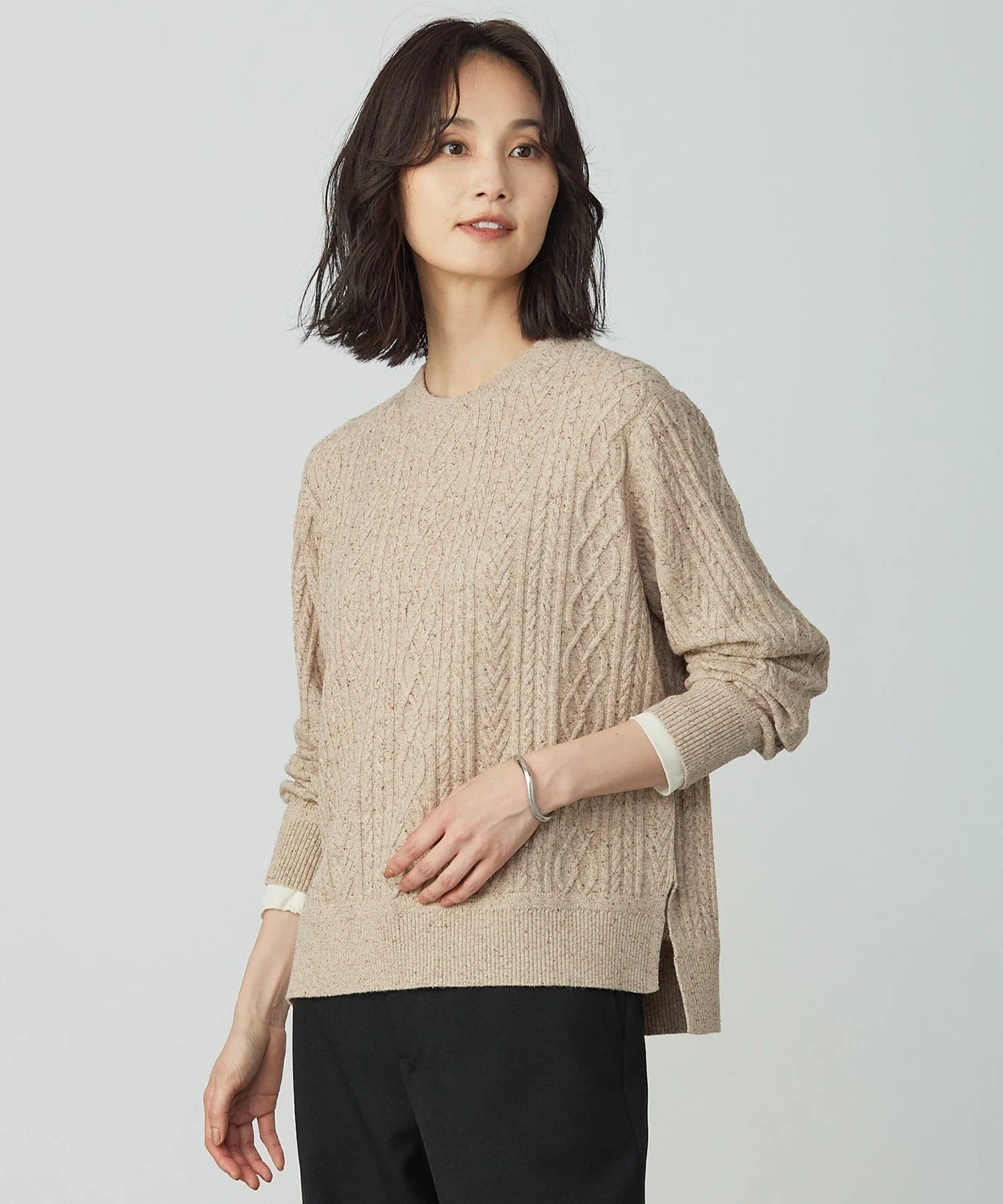 Этот вязаный свитер с круглым вырезом и косами отличается эффектным, смешанным дизайном, идеально подходящим для осени и зимы. Дизайн: Этот свитер с круглым вырезом и косами отличается классическим, но эффектным дизайном. Сохраняя четкий силуэт, трехмерный узор добавляет тепла и элегантности. Он дополняет как традиционные, так и женственные наряды, позволяя создавать разнообразные образы. Доступен в трех цветах: приглушенный светло-серый (#003), натуральный и мягкий бежевый (#033) и изысканный синий (#070). Материал: Эта ткань представляет собой смесь шерсти и шелкового непа, что создает привлекательный смешанный вид. Роскошная текстура шелкового непа дополняет гладкое, нежное прикосновение вискозы, создавая элегантную и комфортную текстуру.
