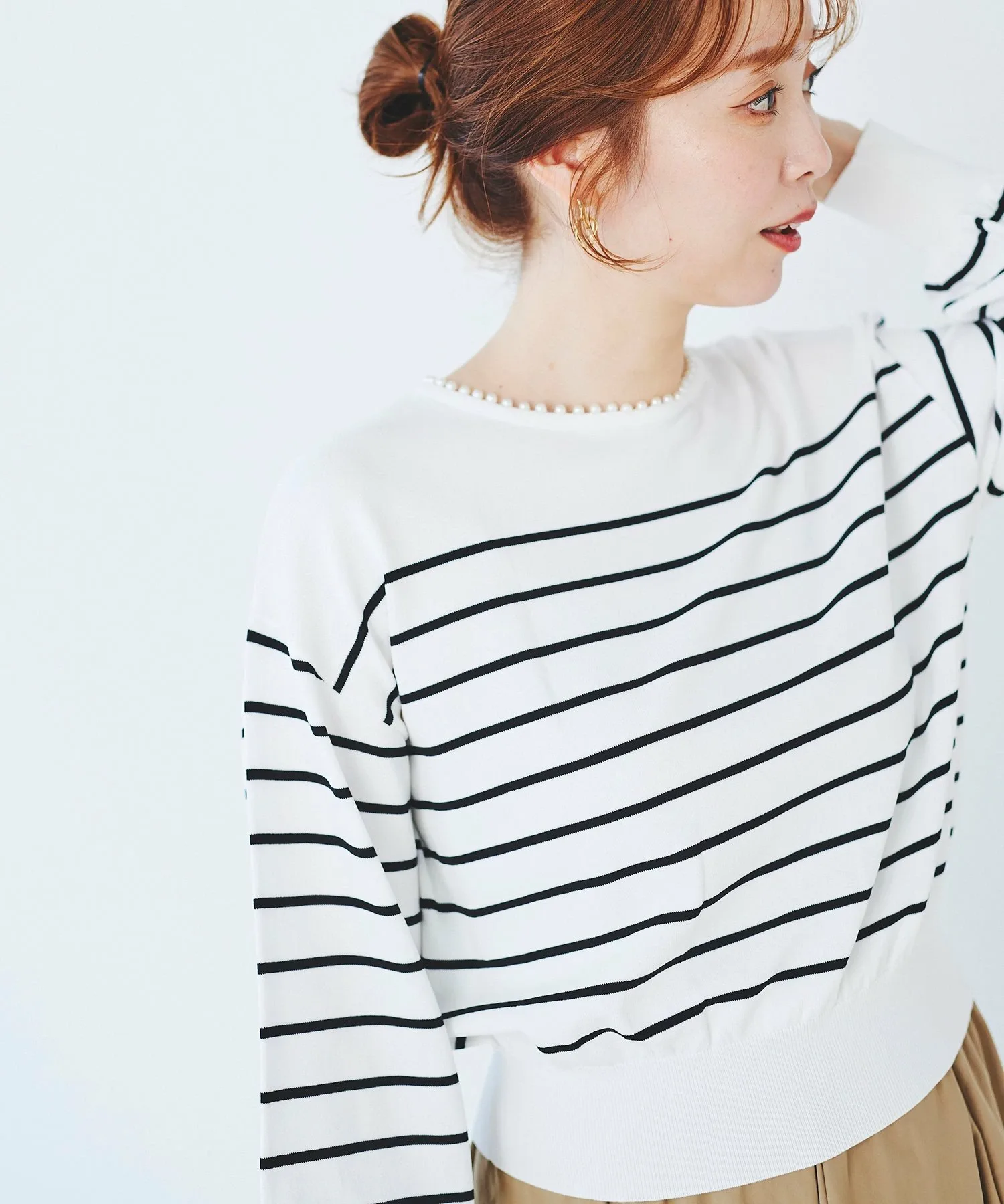 Типовой пуловер с круглым вырезом и жемчужными бусинами на воротнике.