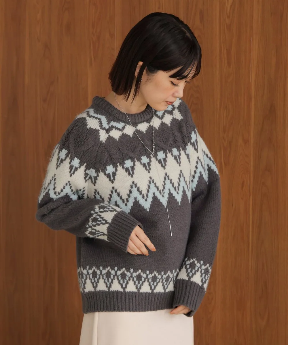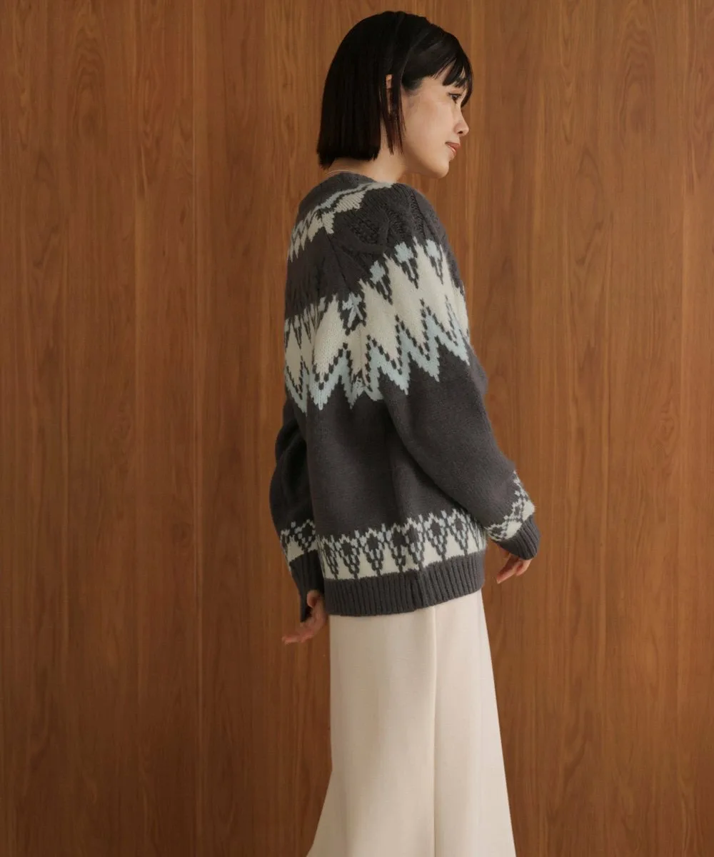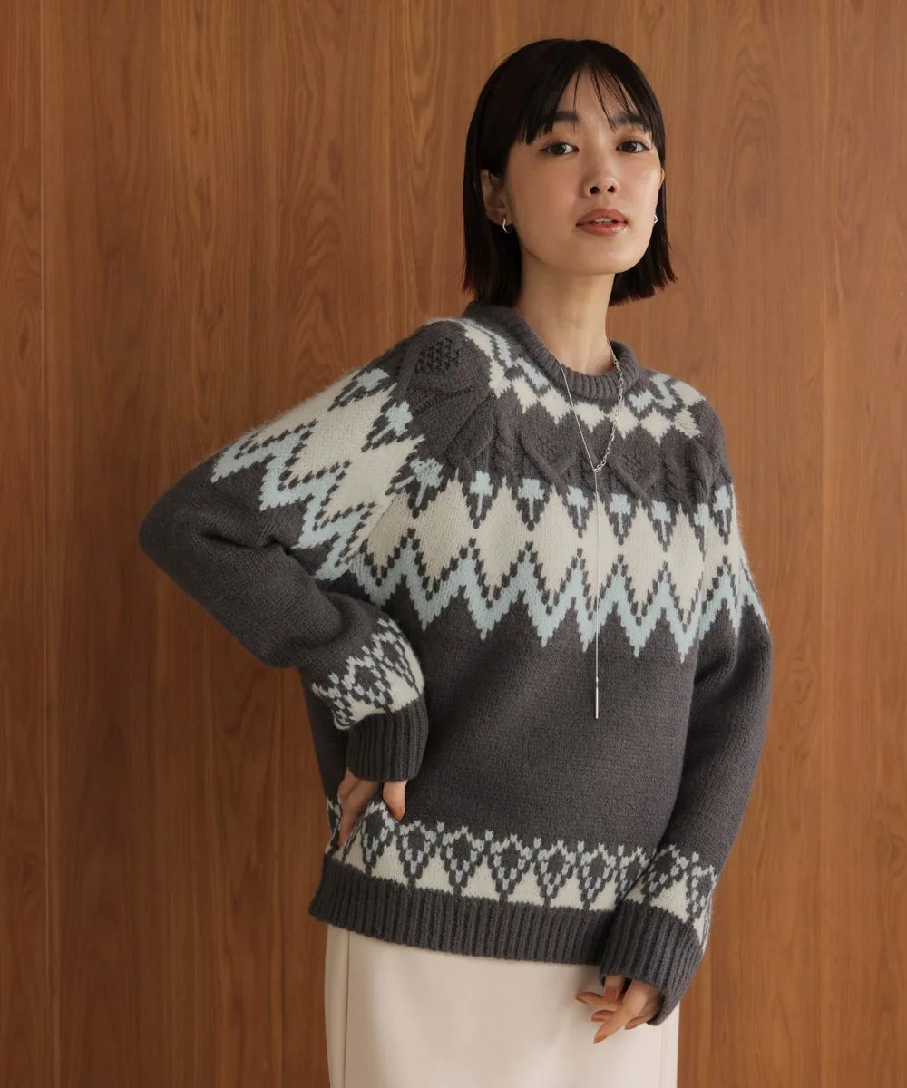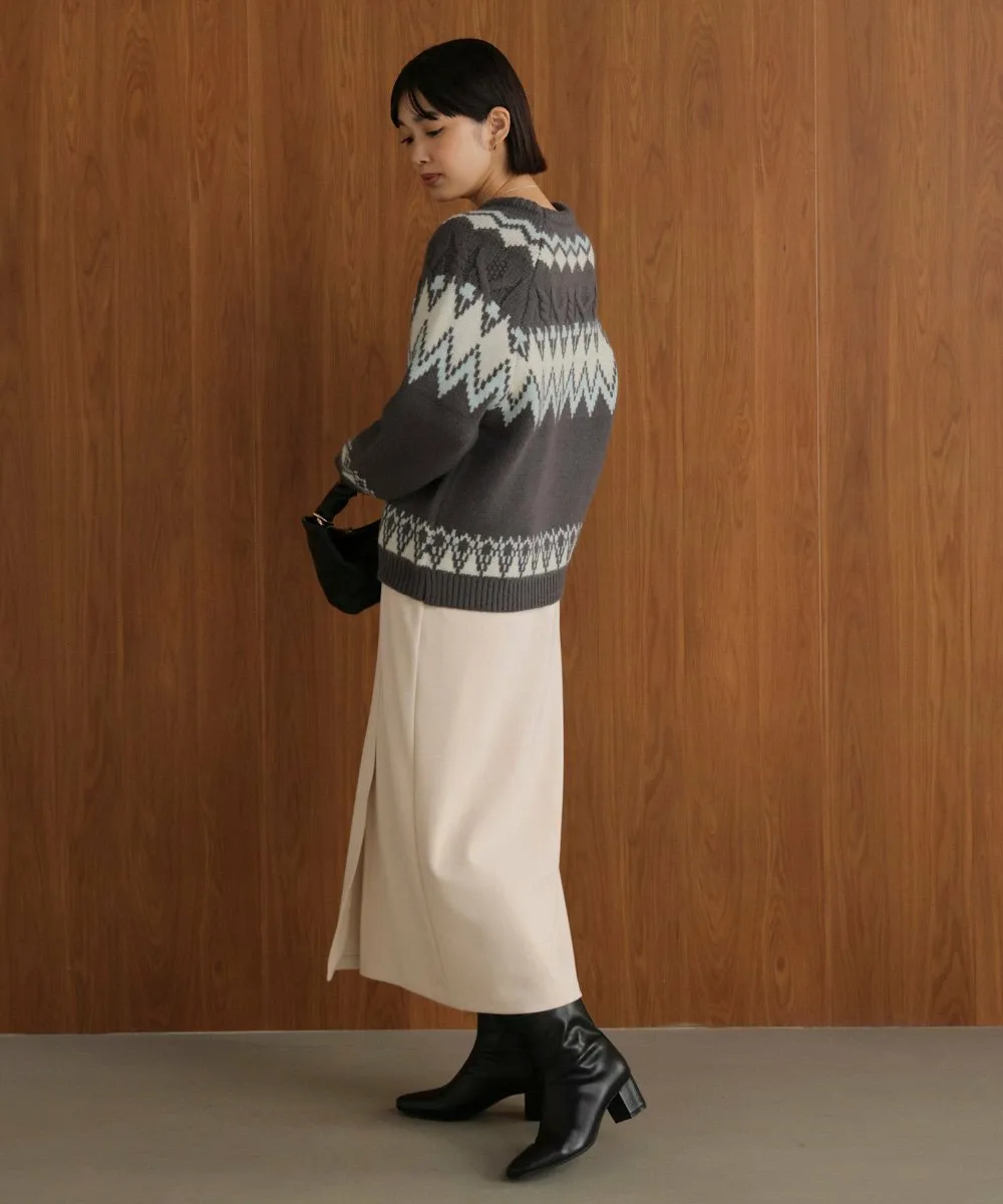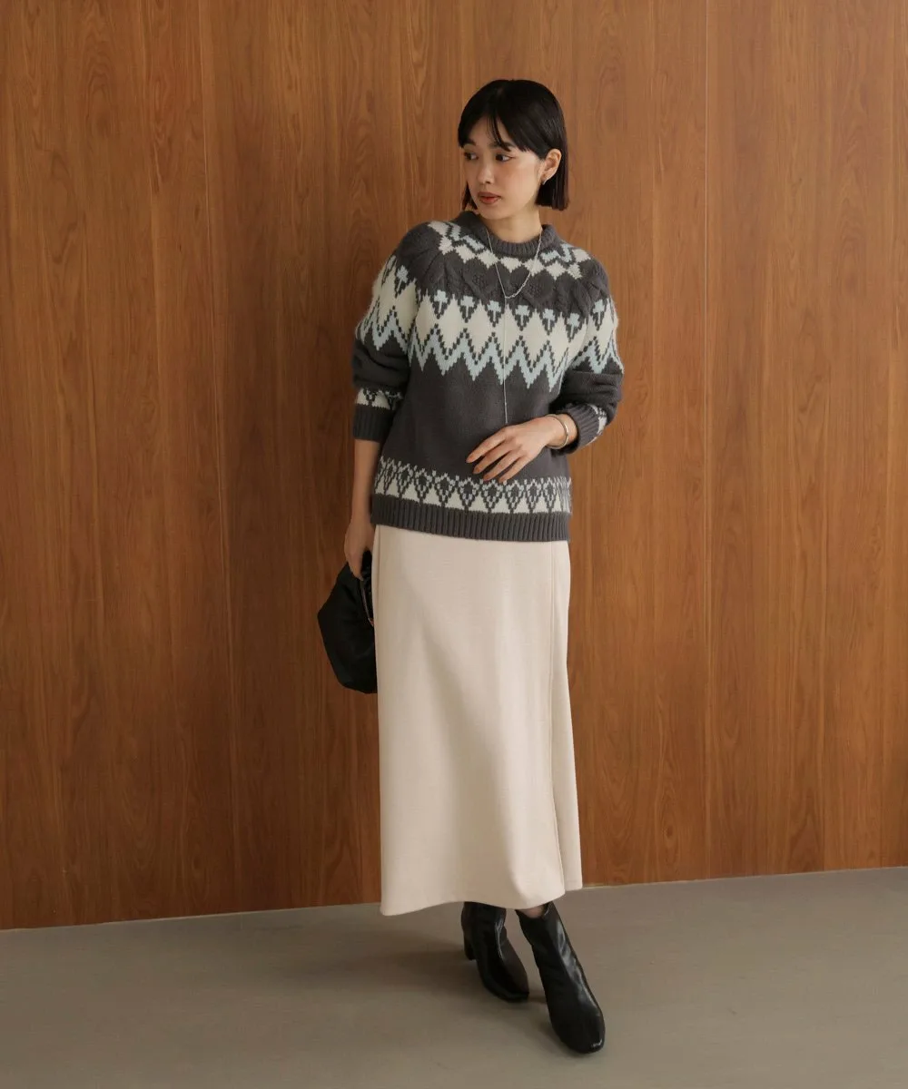 ТОЧКАИзысканный трикотаж с ярким жаккардовым узором. Мягкая, сдержанная цветовая гамма создает элегантное впечатление, не будучи при этом слишком приторной. Свободный силуэт прекрасно подчеркивает фигуру, создавая утонченный образ.