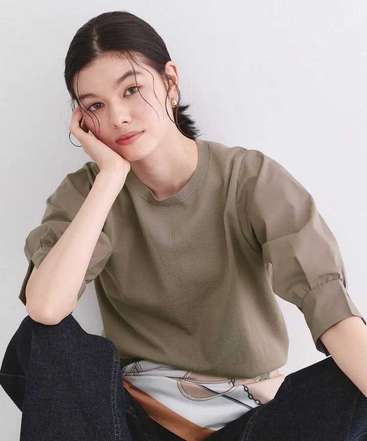 Очень популярный топ-докинг, сочетающий в себе трикотажную основу и рукава с текстурой рубашки.