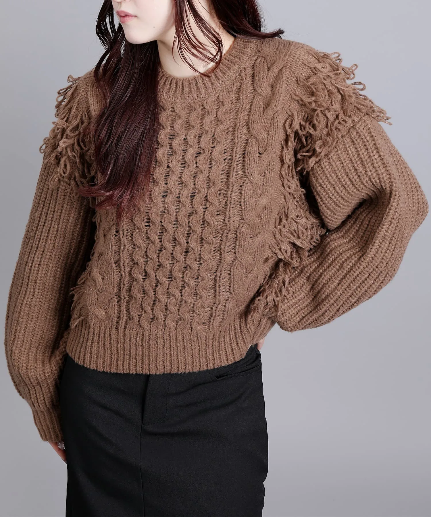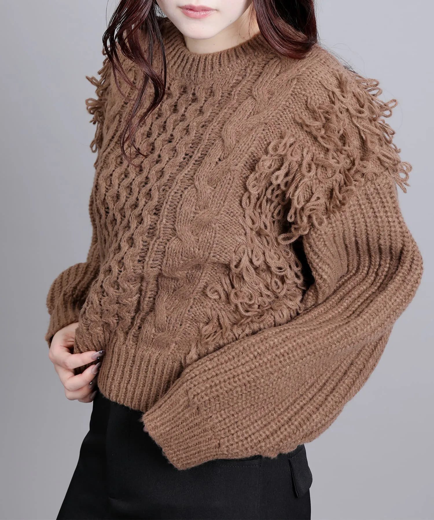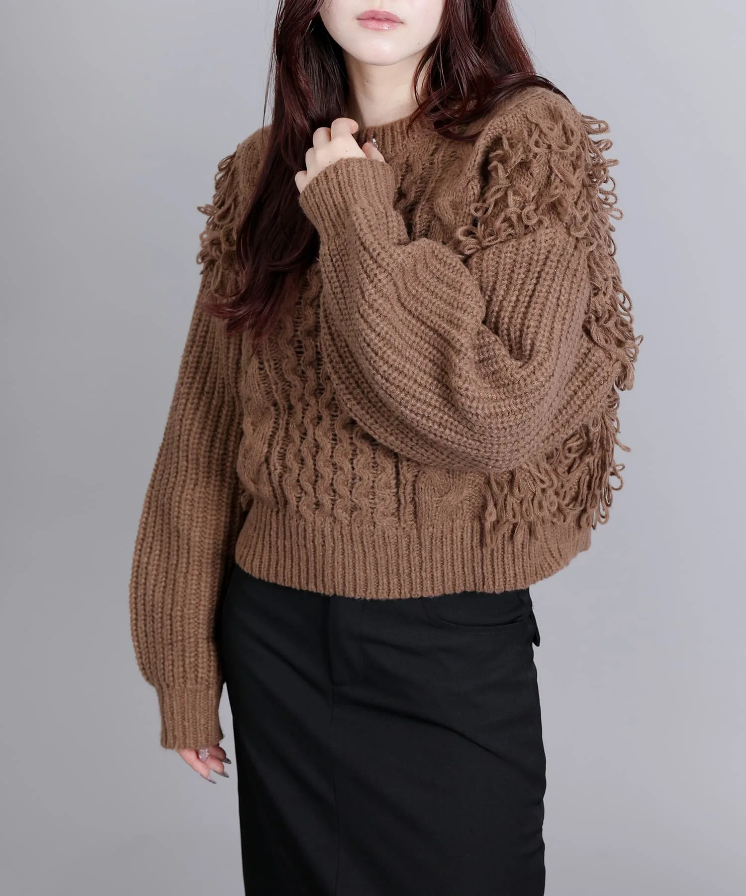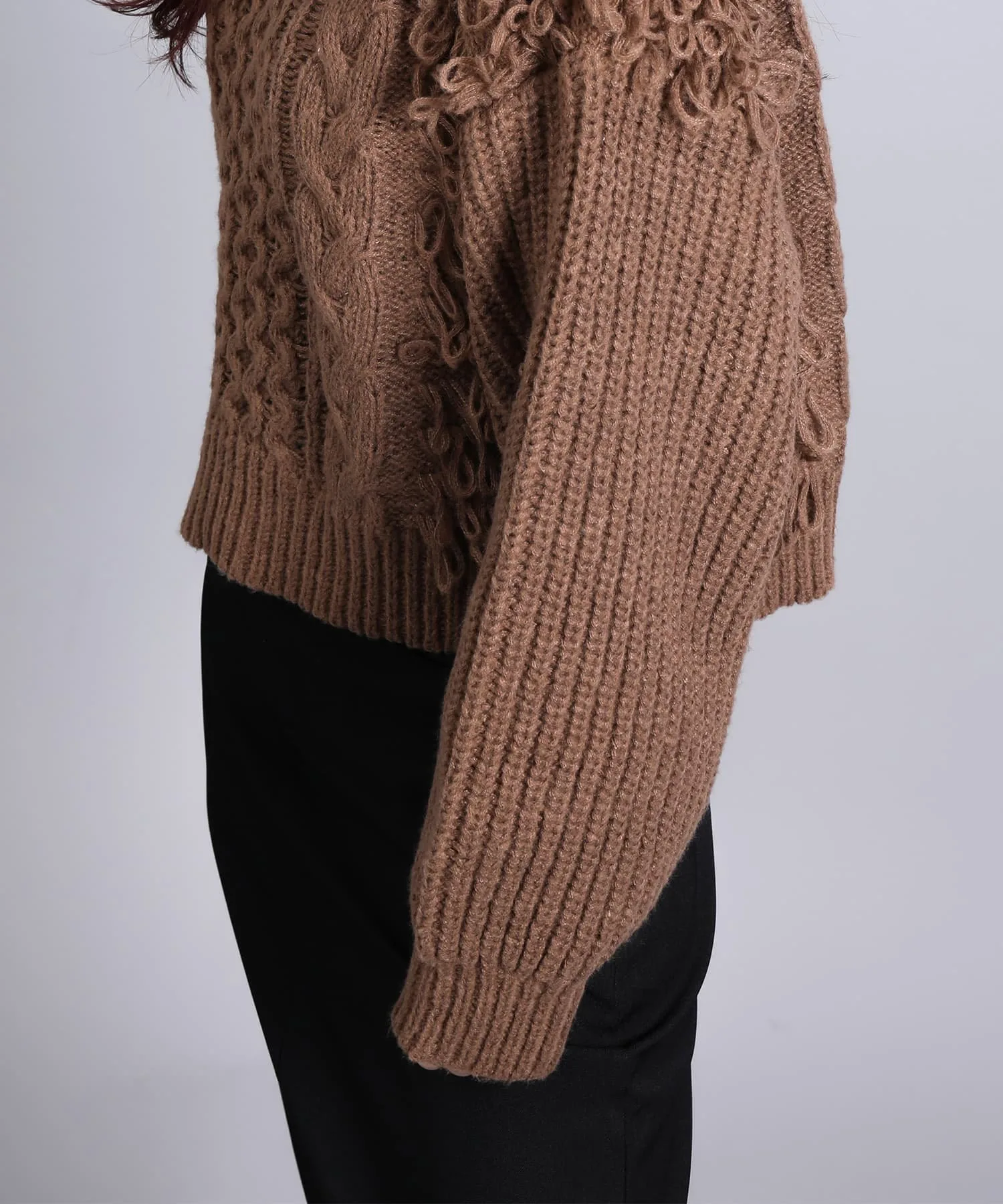 Вязаный свитер с привлекательной мягкой бахромой.
