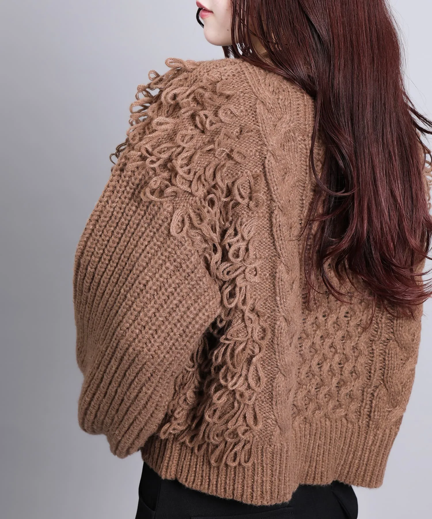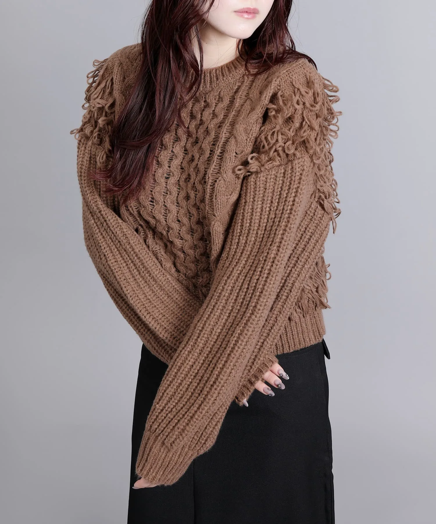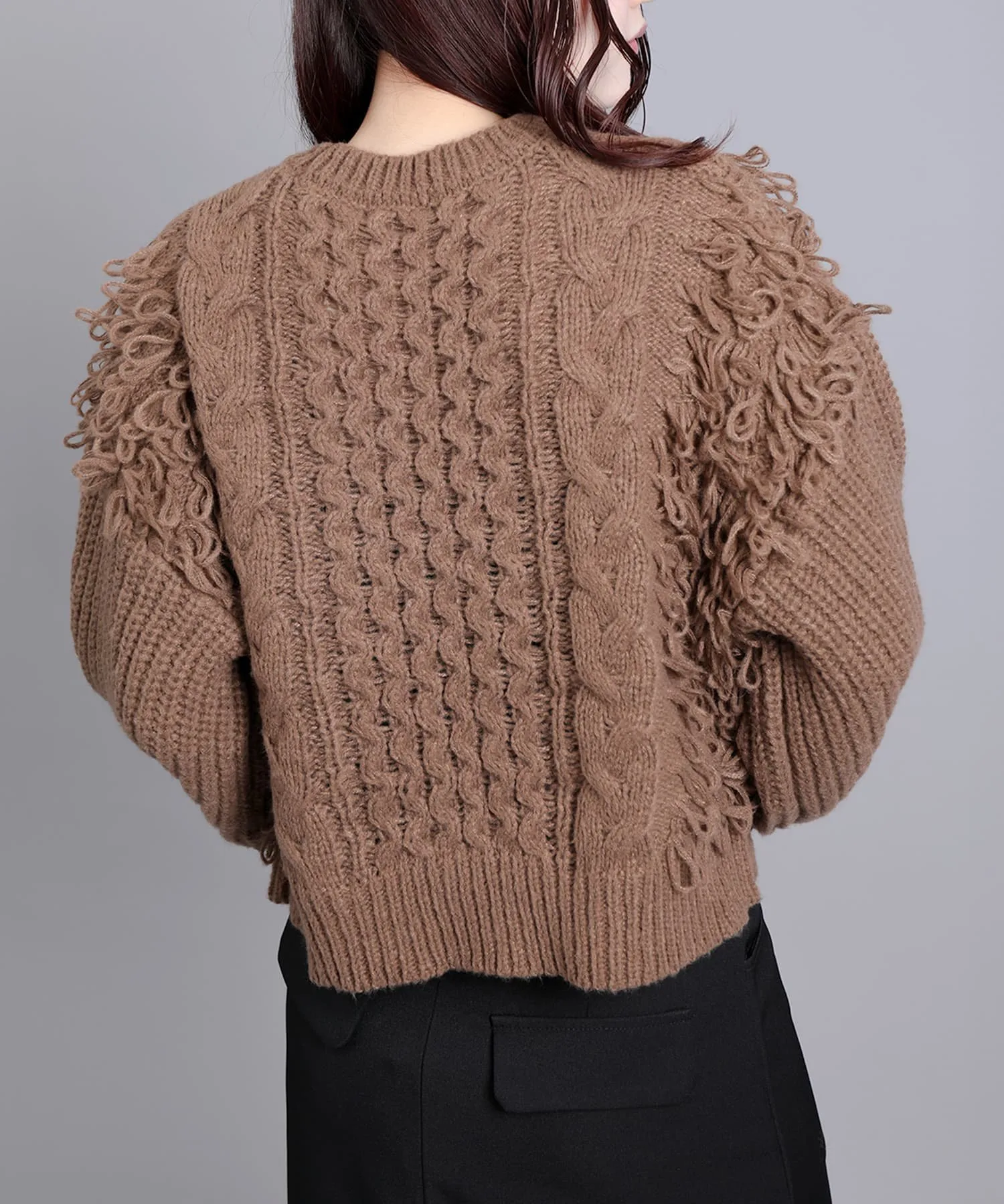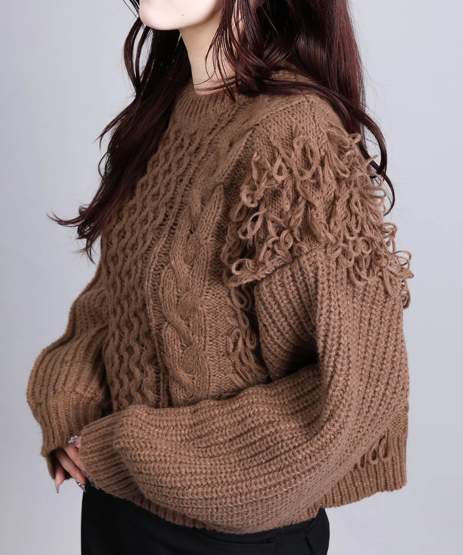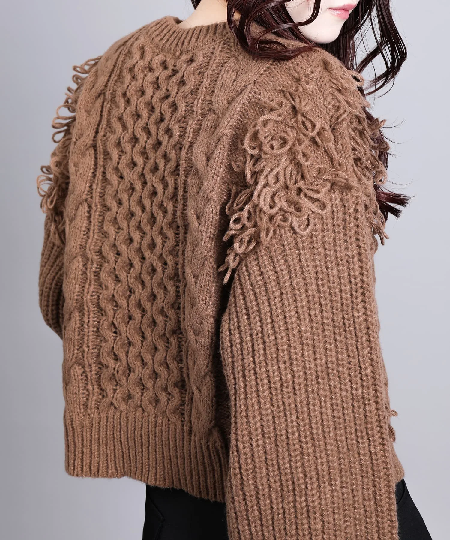 Вязаный свитер с привлекательной мягкой бахромой.