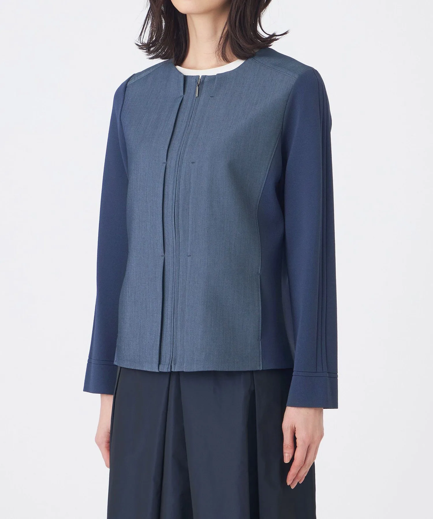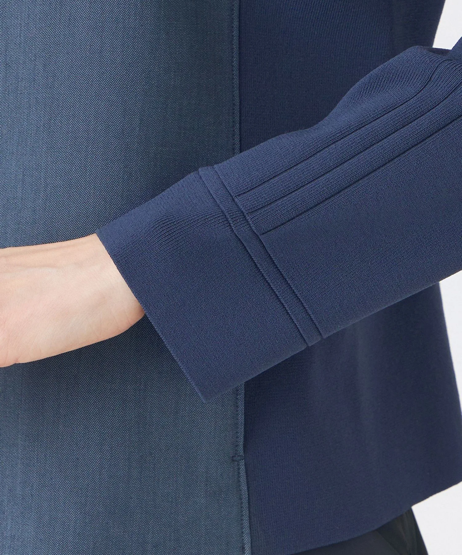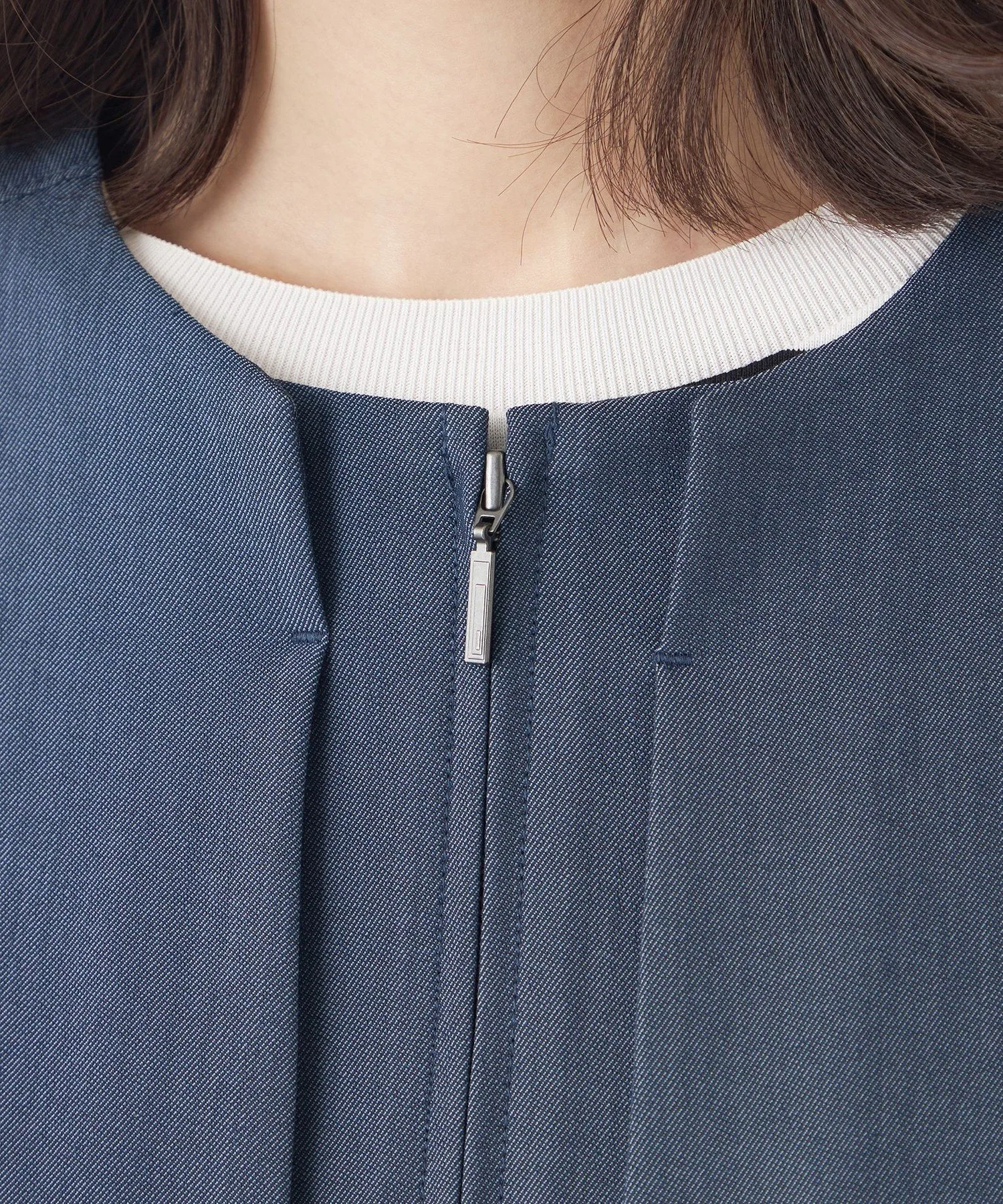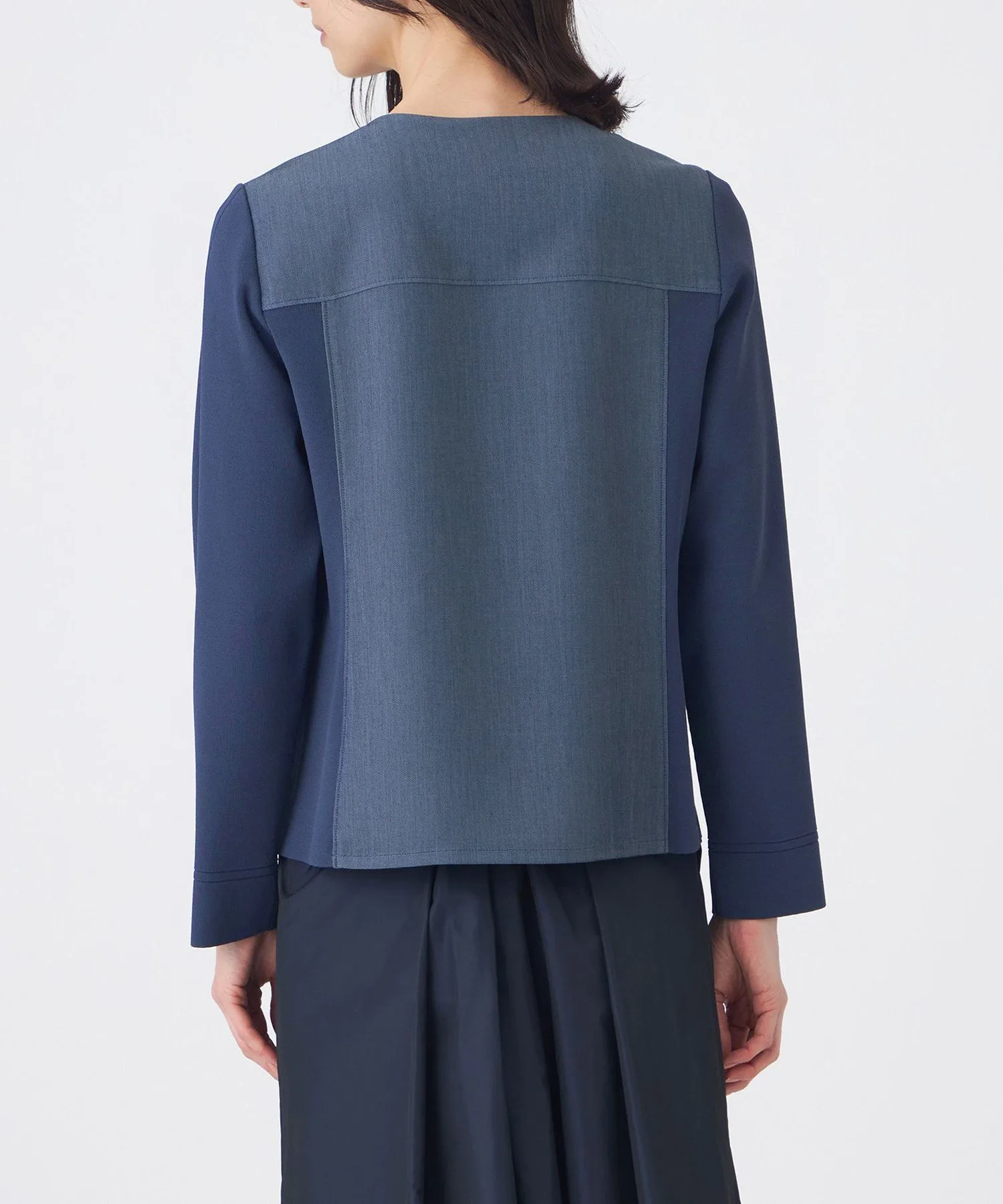 Передняя часть, кокетка и центральная часть спинки изготовлены из легко моющегося полиэстера, что придает им вид, похожий на настоящий деним. Для достижения эффекта «слабой» ткани, нити основы изготовлены из оригинальной пряжи, сочетающей в себе неравномерные нити. Нити утка изготовлены из эластичной пряжи для комфортного, эластичного ощущения и устойчивости к складкам. Вязаная часть сочетает в себе блеск волокон из регенерированной целлюлозы и эластичность полиамидных волокон, обеспечивая приятную на ощупь текстуру.