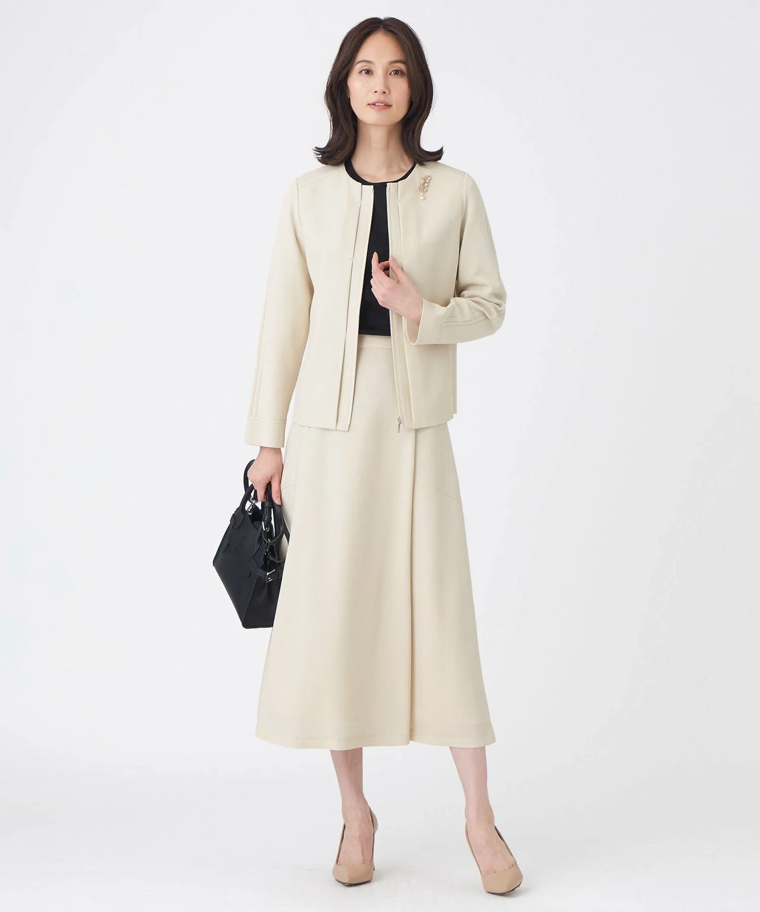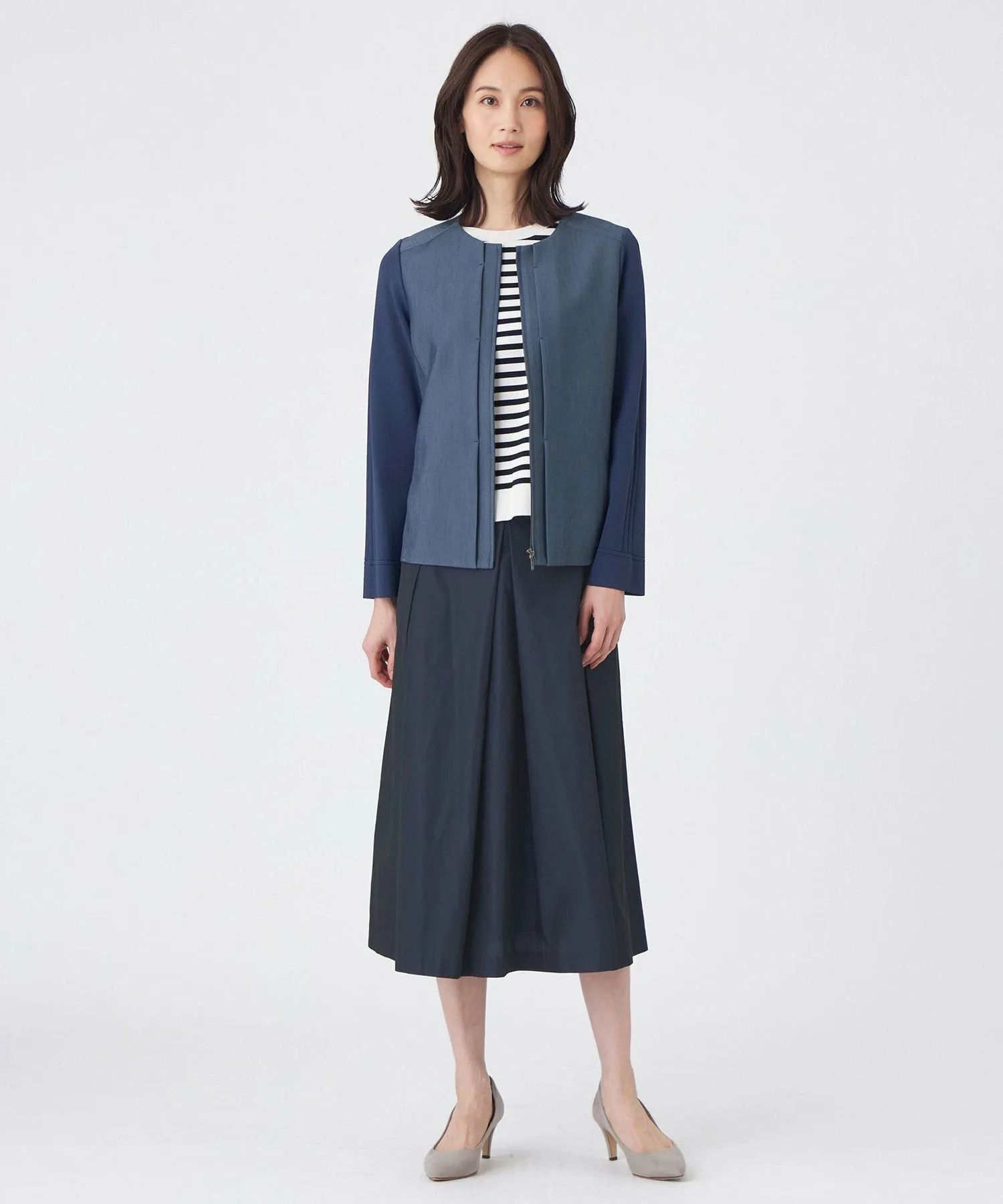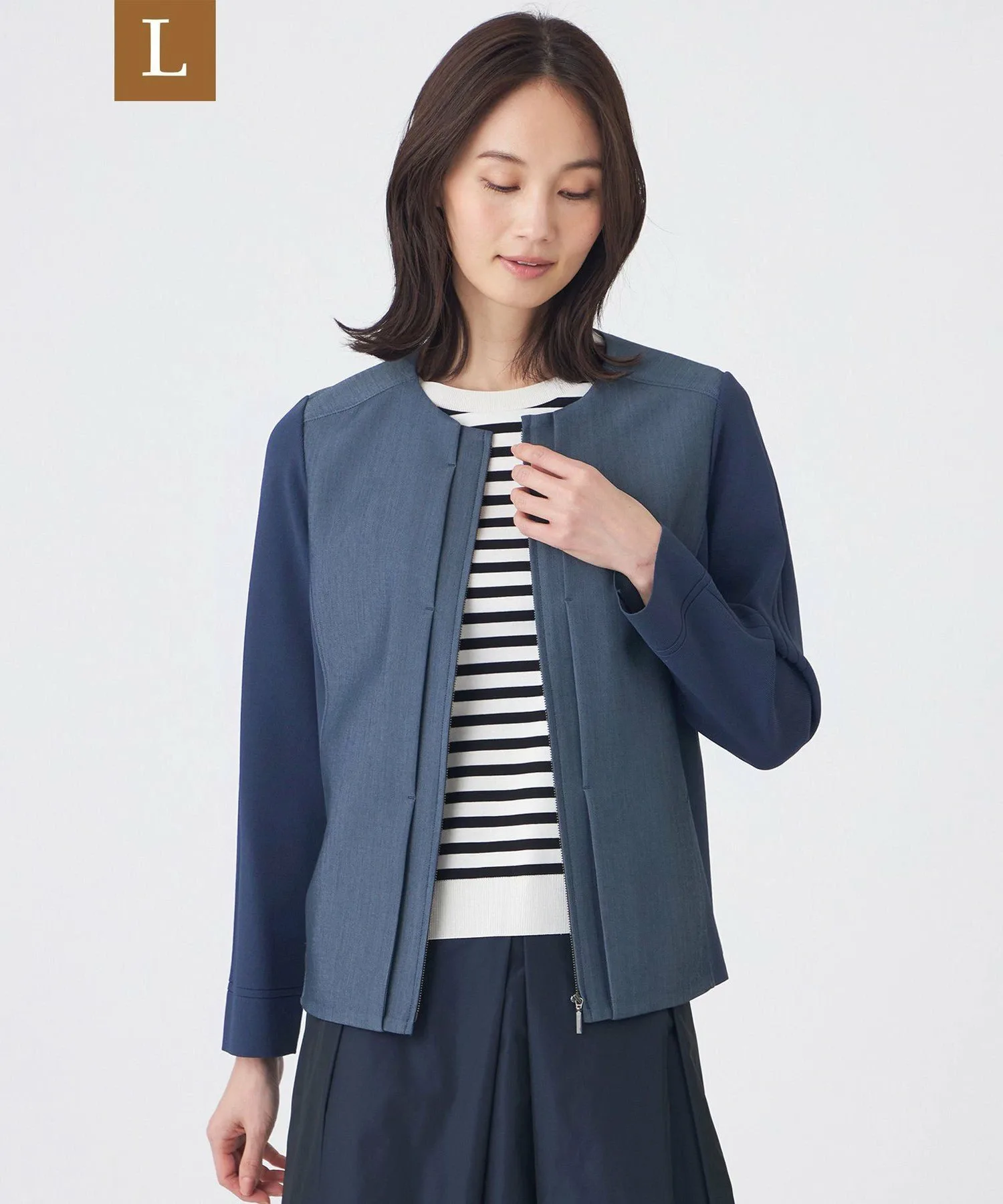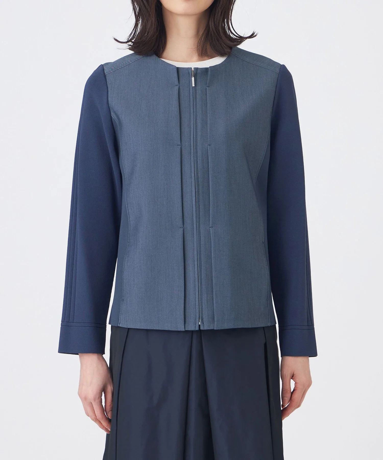 Передняя часть, кокетка и центральная часть спинки изготовлены из легко моющегося полиэстера, что придает им вид, похожий на настоящий деним. Для достижения эффекта «слабой» ткани, нити основы изготовлены из оригинальной пряжи, сочетающей в себе неравномерные нити. Нити утка изготовлены из эластичной пряжи для комфортного, эластичного ощущения и устойчивости к складкам. Вязаная часть сочетает в себе блеск волокон из регенерированной целлюлозы и эластичность полиамидных волокон, обеспечивая приятную на ощупь текстуру.
