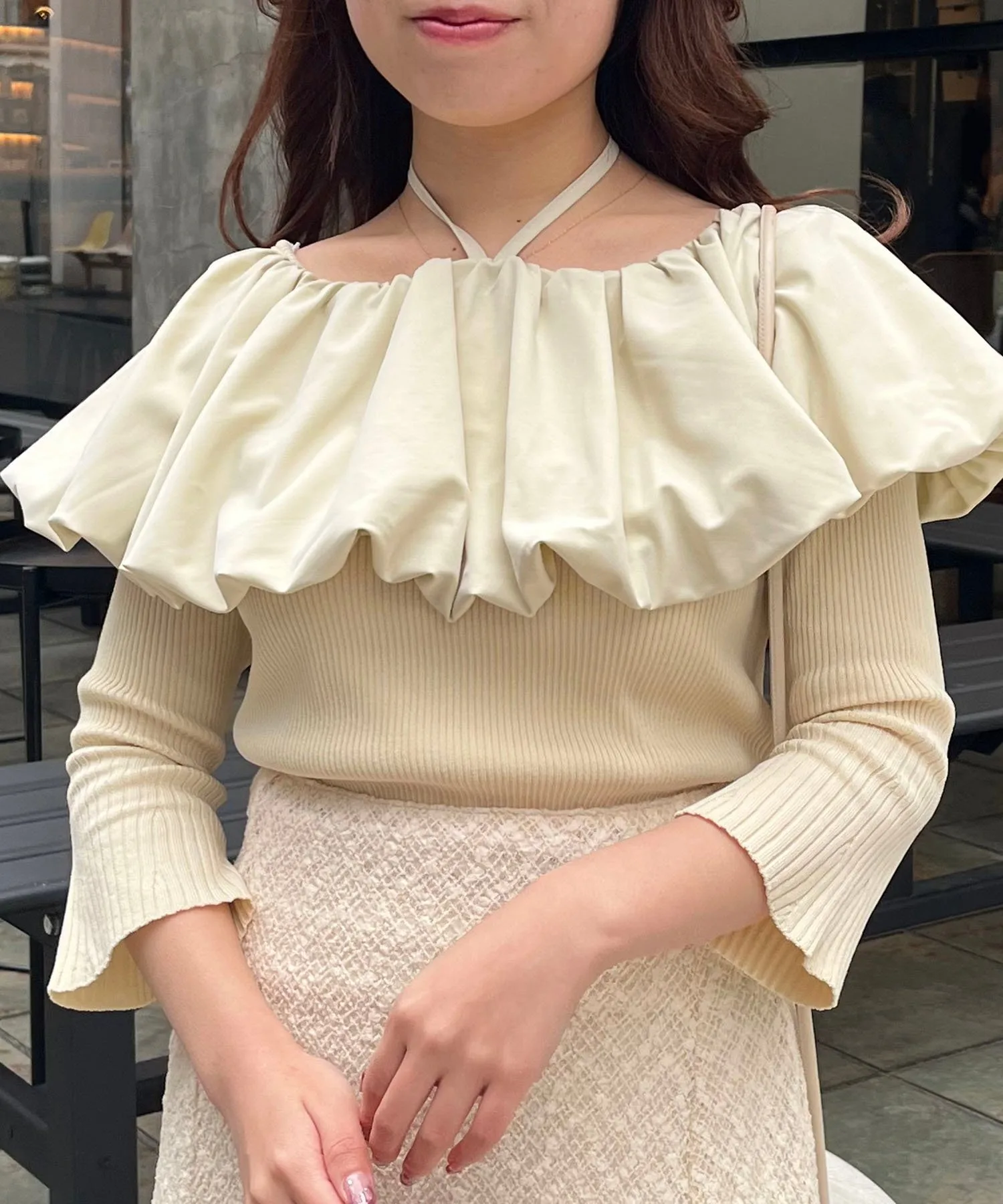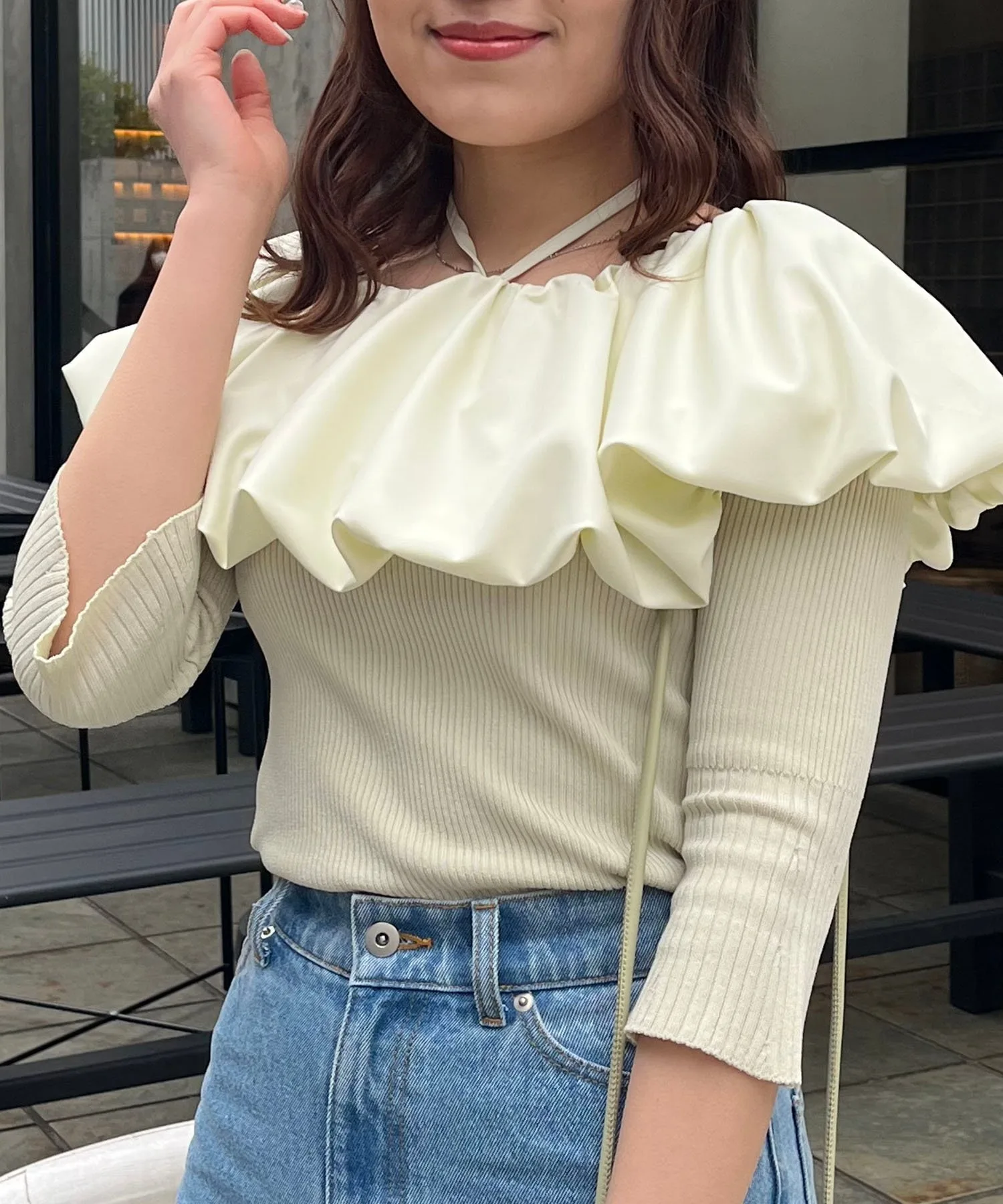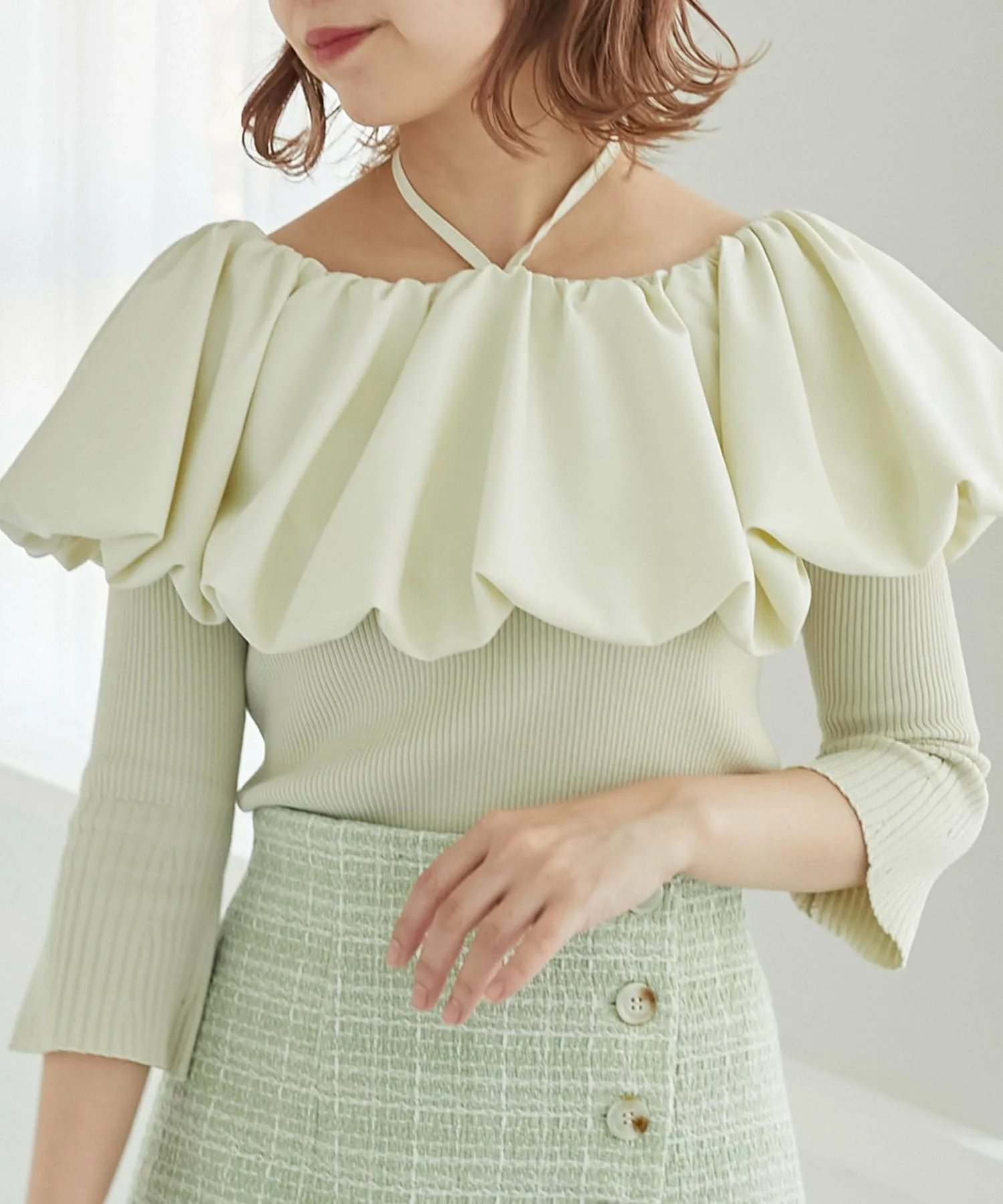 Рельефный трикотаж с модным дизайном воротника-баллона.