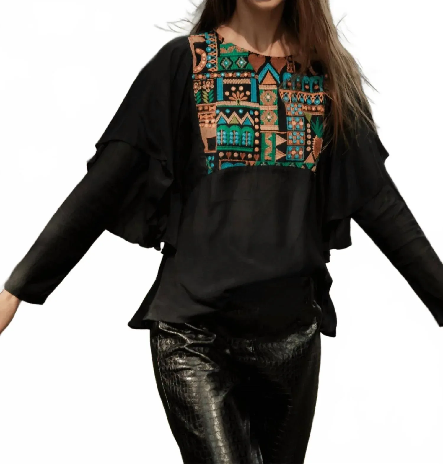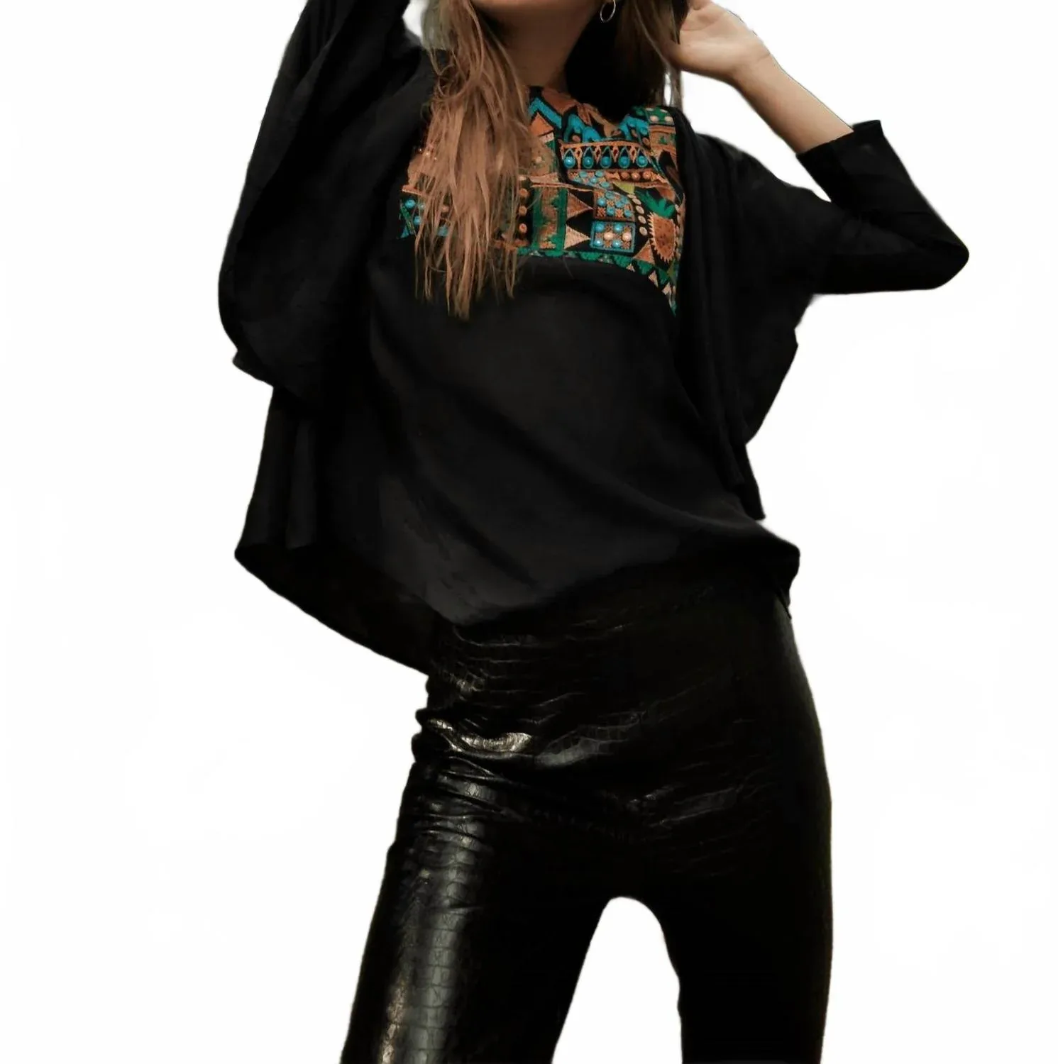 Сочетайте эту блузку с любимыми джинсами и шлепанцами для следующего девичника. Откройте для себя блузку Beatrice от Guadalupe Design, символ вневременного стиля и комфорта. Эта черная блузка с длинными рукавами идеально подойдет для новоселья, благодаря классическому круглому вырезу и влиянию моды 90-х. С застежкой-молнией и элегантным узором, она создана для женщин, которые ценят сочетание традиций и современности. Уход: машинная стирка в холодной воде, сушка в барабане при низкой температуре, стирка темных цветов отдельно, не отбеливать, гладить с отпариванием, возможна химчистка.