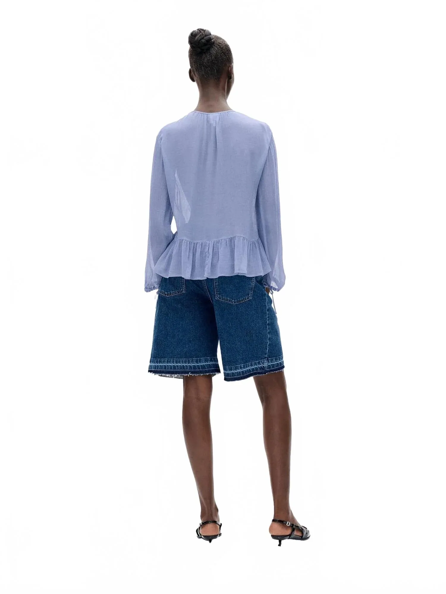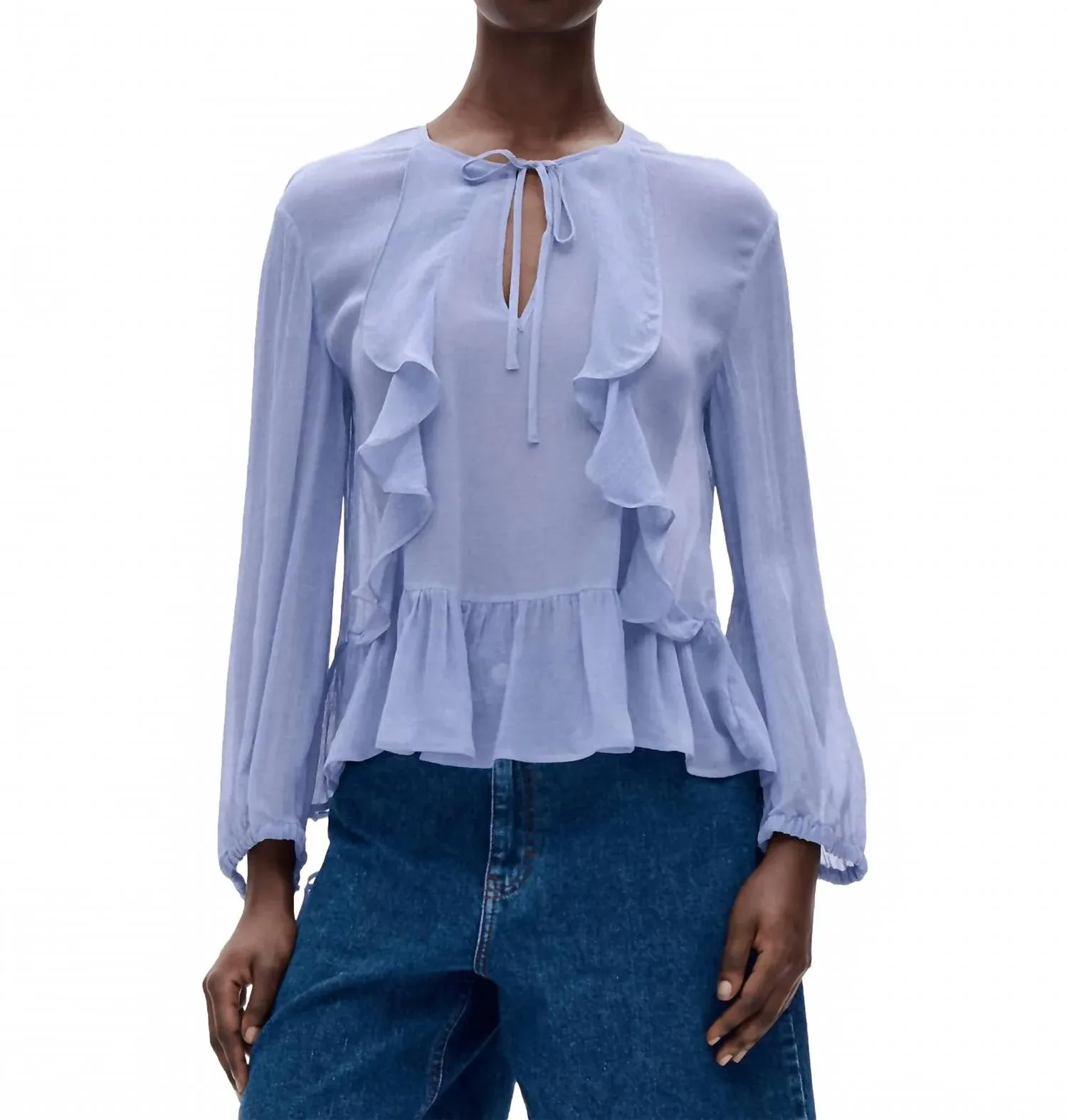Блузка, которая никогда не выйдет из моды. Представляем блузку Mikaela от BAUM UND PFERDGARTEN - легкий и стильный вариант в цвете Tempest Blue. Изготовленная из 100% вискозы, эта блузка с длинными рукавами украшена изящными оборками, придающими ей элегантность. Текстурированный узор и круглый вырез горловины делают ее идеальной для летних вечеринок. Завязка добавляет женственности этому минималистичному изделию.